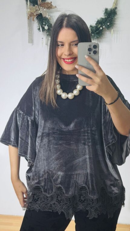 Original price was: 59,00 €.48,00 €Η τρέχουσα τιμή είναι: 48,00 €.Grey Velour Blouse Plus Size