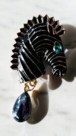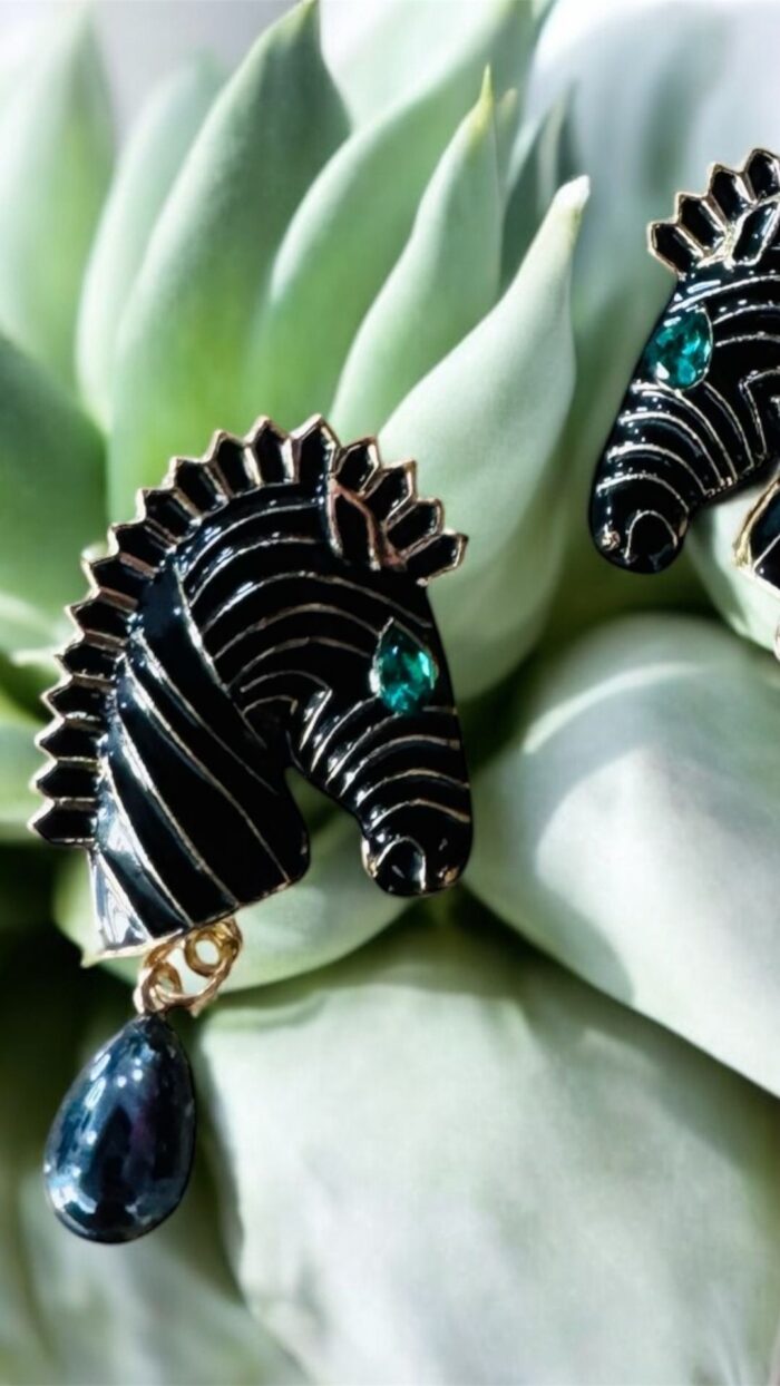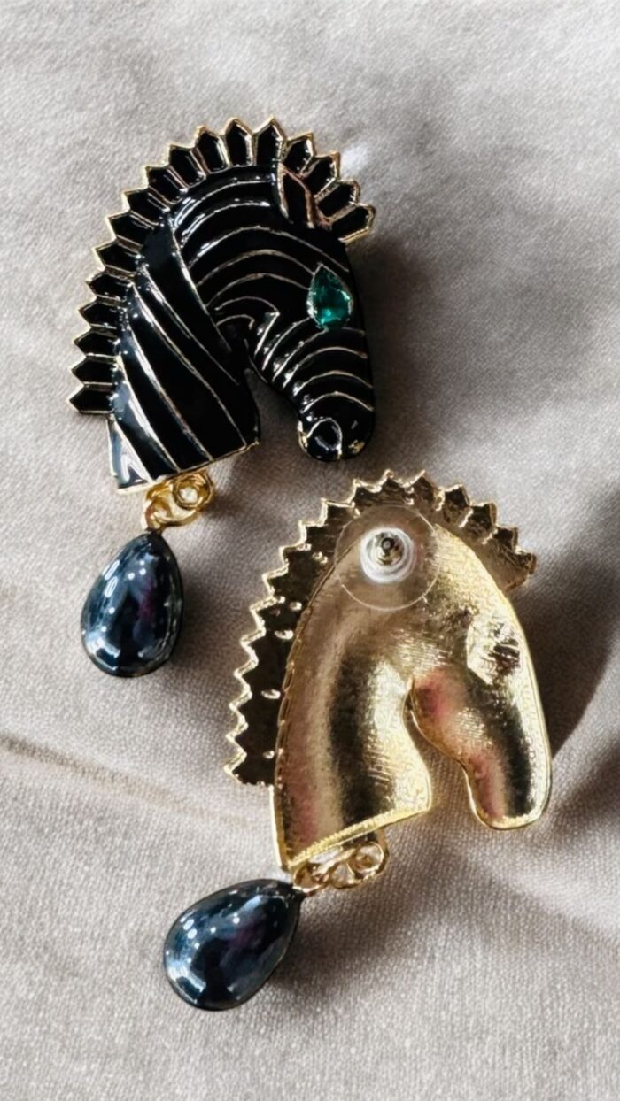 Σκουλαρίκια καρφωτά σε σχήμα ζέβρα με χρωματιστό ματάκι και πέρλα στο τελείωμα.