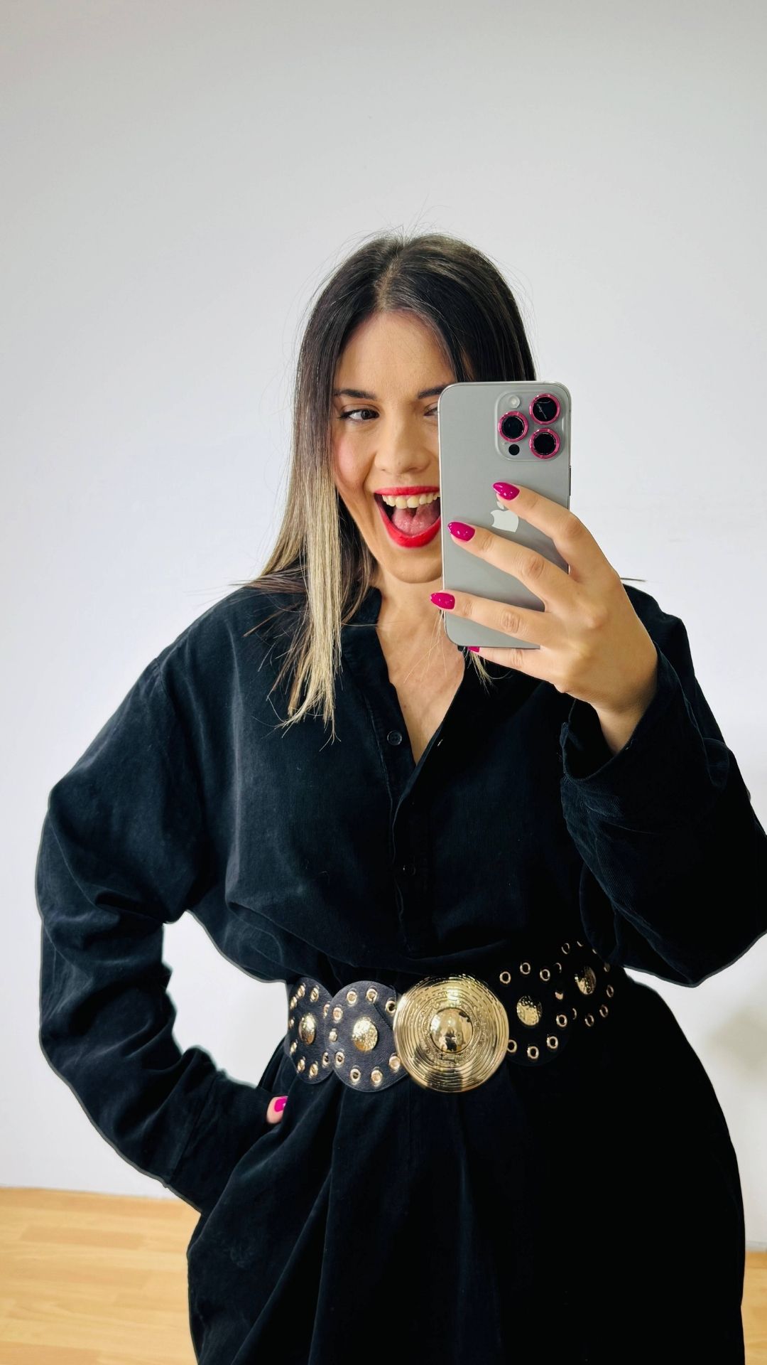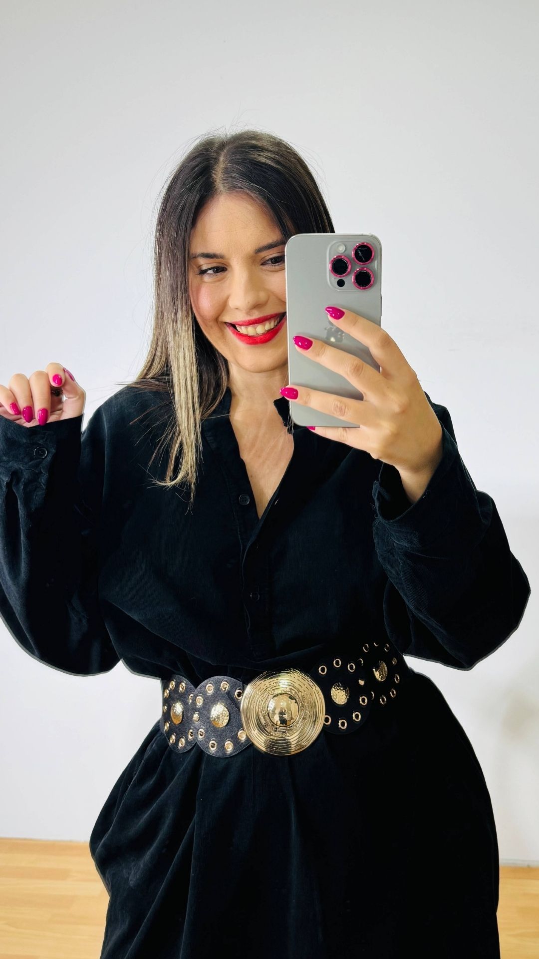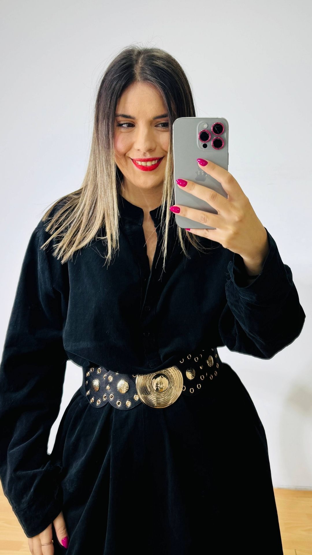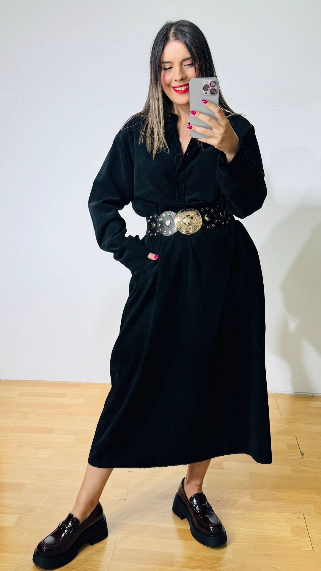 Φόρεμα κοτλέ με μάο γιακά και κουμπάκια στο μπούστο.