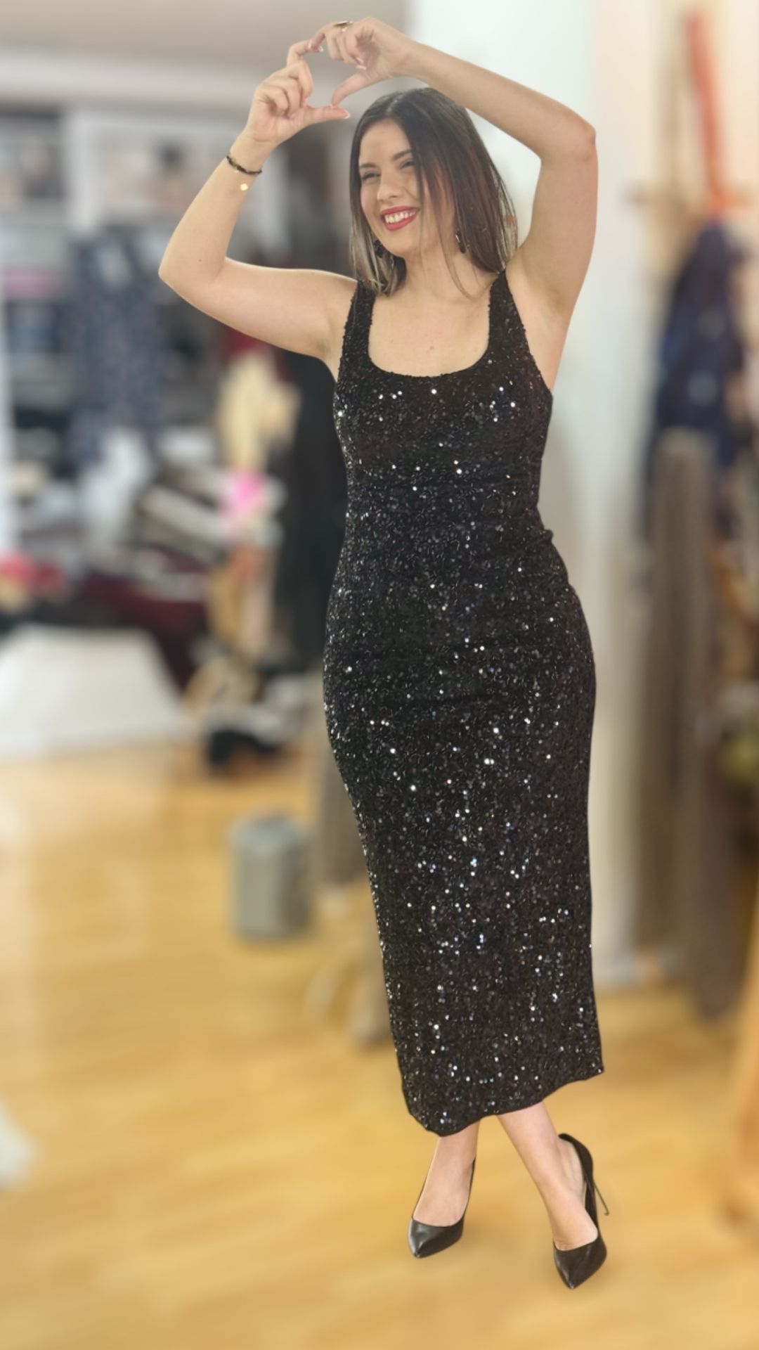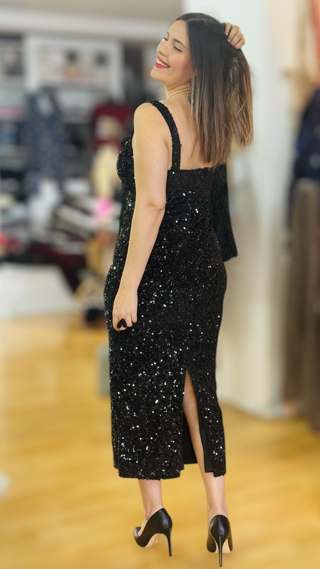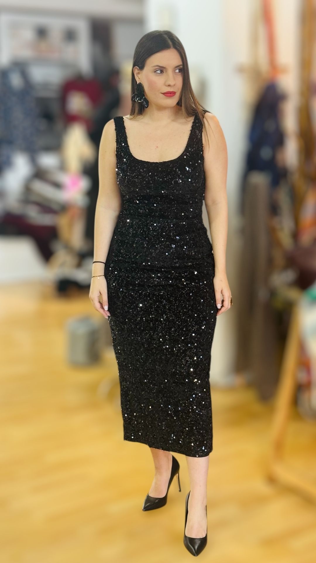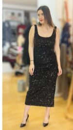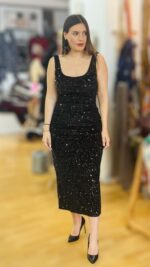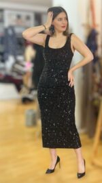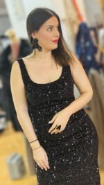 Μακρύ ελαστικό φόρεμα με μαύρη παγέτα και μαύρες χάντρες κεντημένες πάνω στο ύφασμα. Διαθέτει εσωτερική φόδρα και cups στο στήθος.