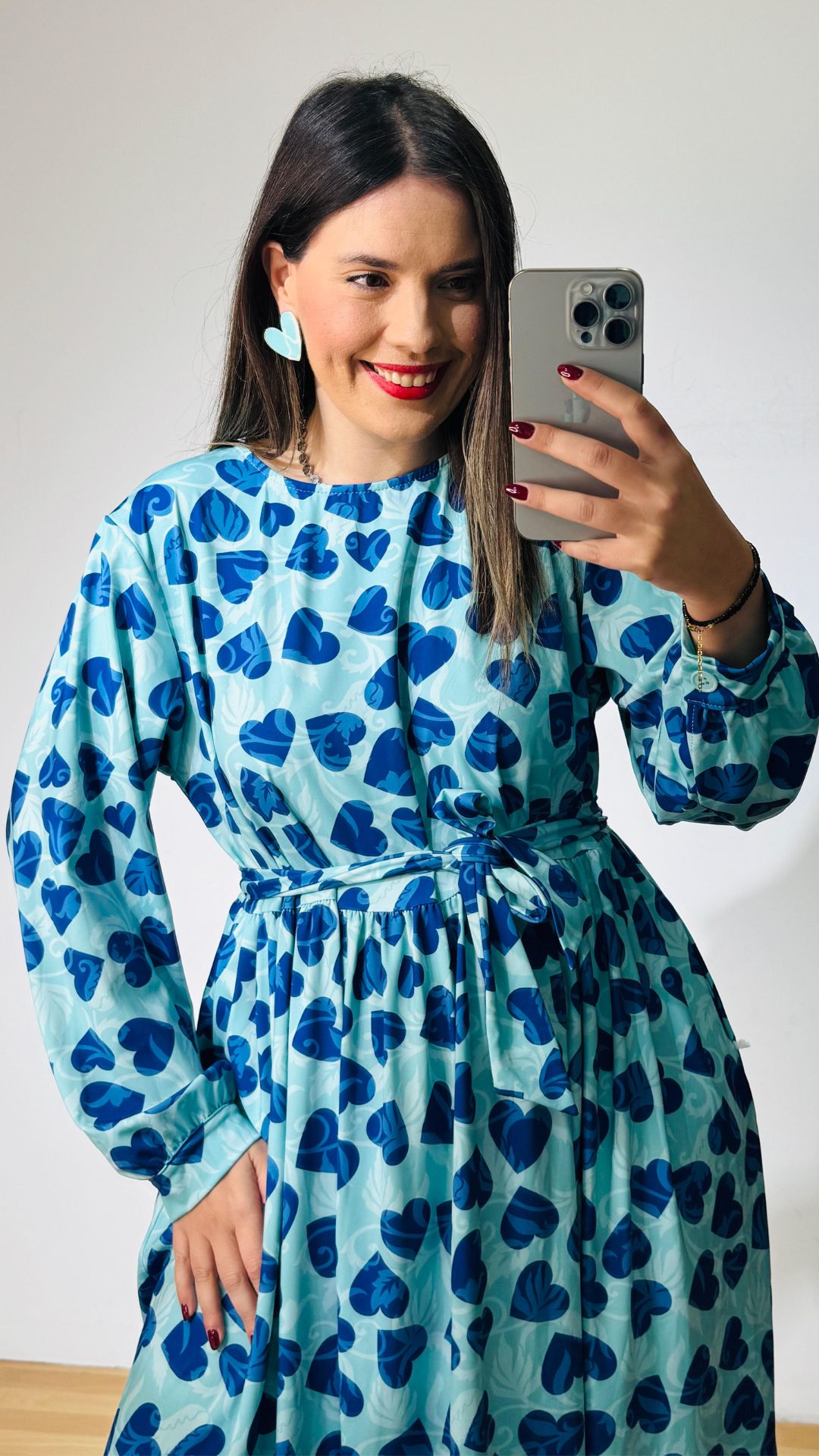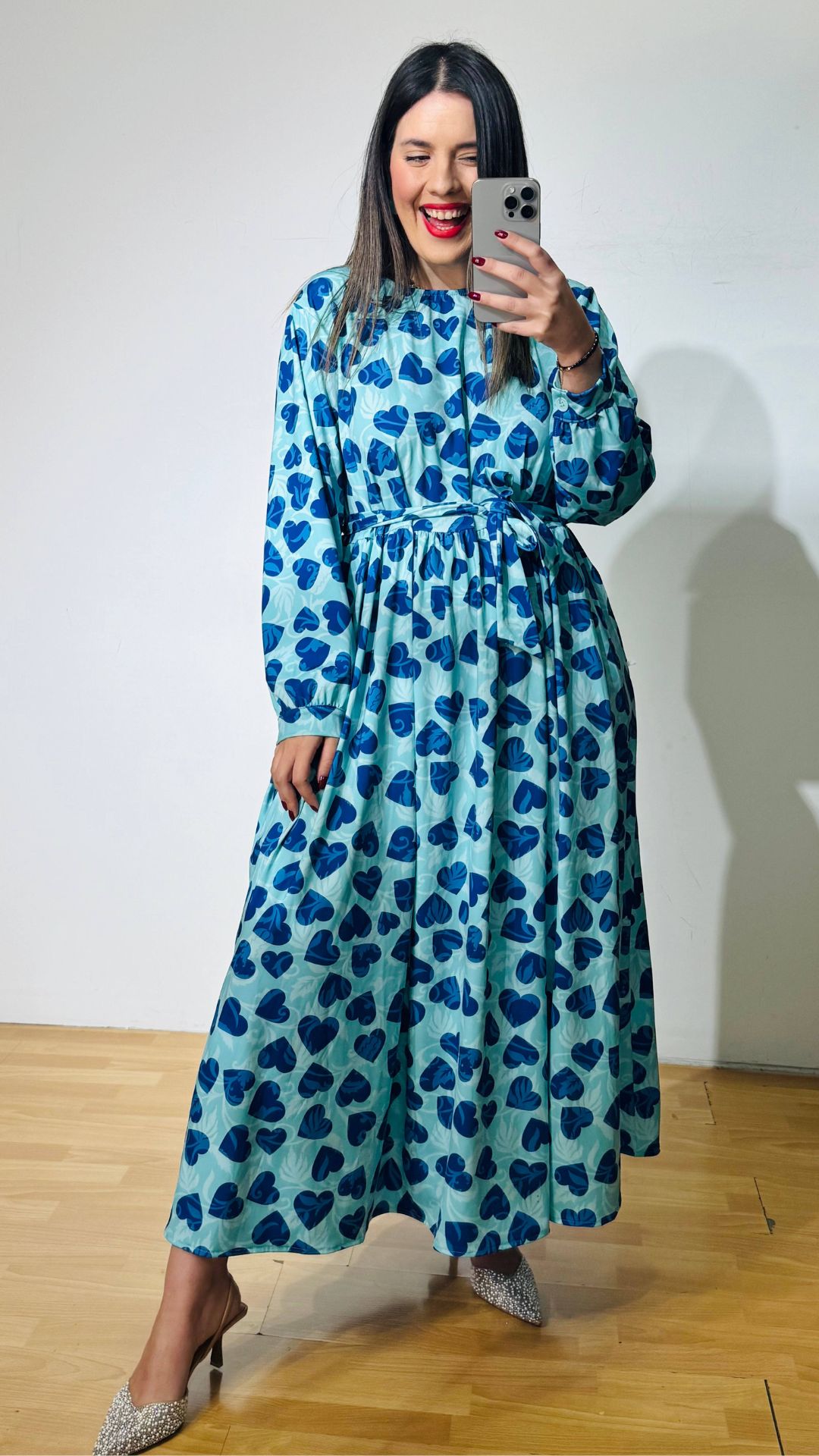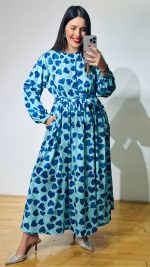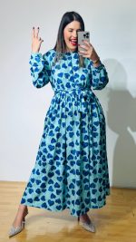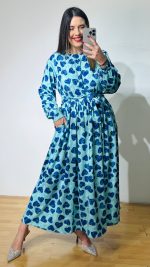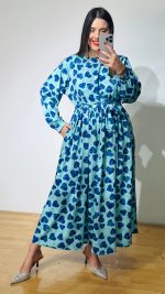 Μακρύ φόρεμα σε αέρινη boho γραμμή. Πλούσιο ύφασμα. Φούσκα μανίκι με μανσέτα και μεταλλικό κουμπί.