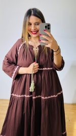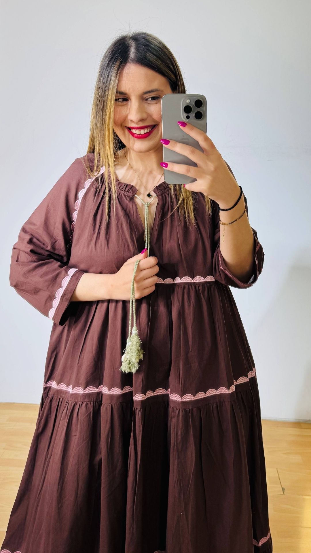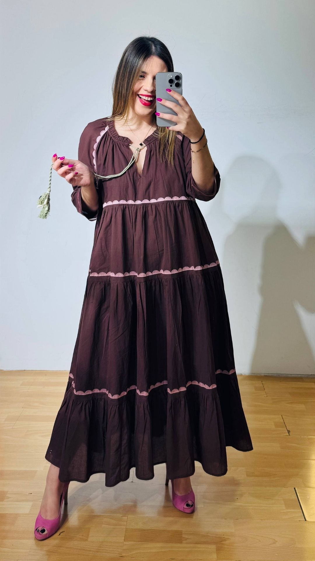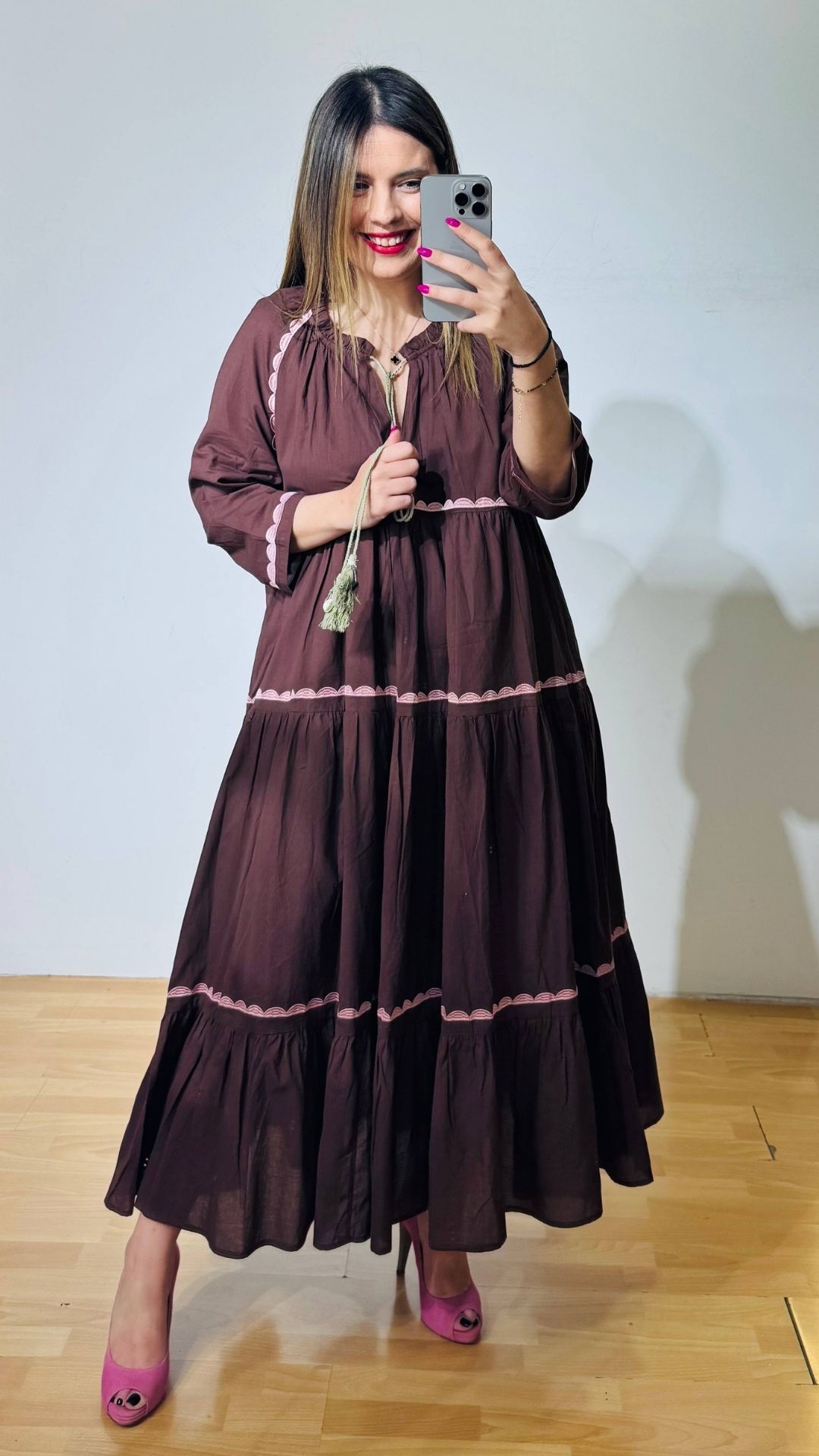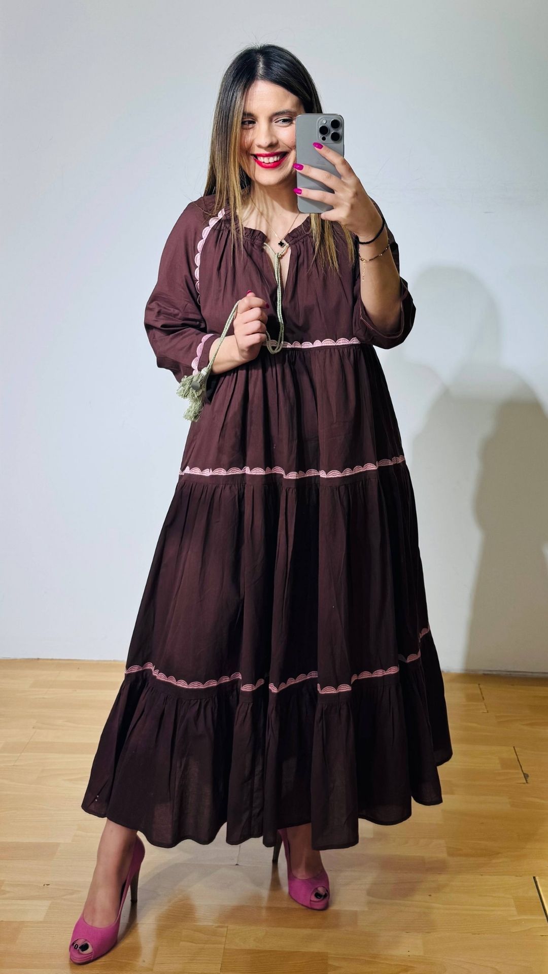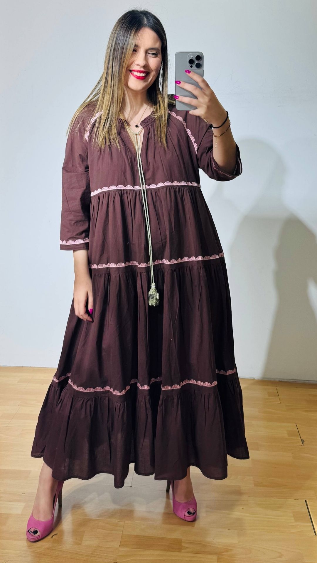 Φόρεμα σε boho στυλ από βαμβακερή ποπλίνα με ροζ τρέσες και κορδόνι στο μπούστο με φουντίτσες.