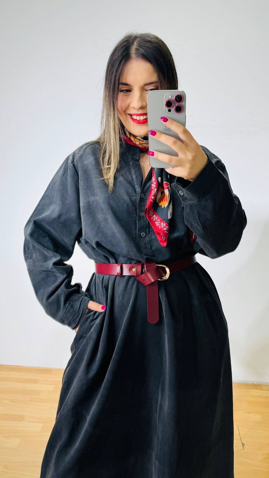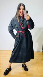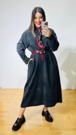Φόρεμα κοτλέ με μάο γιακά και κουμπάκια στο μπούστο.