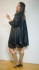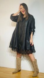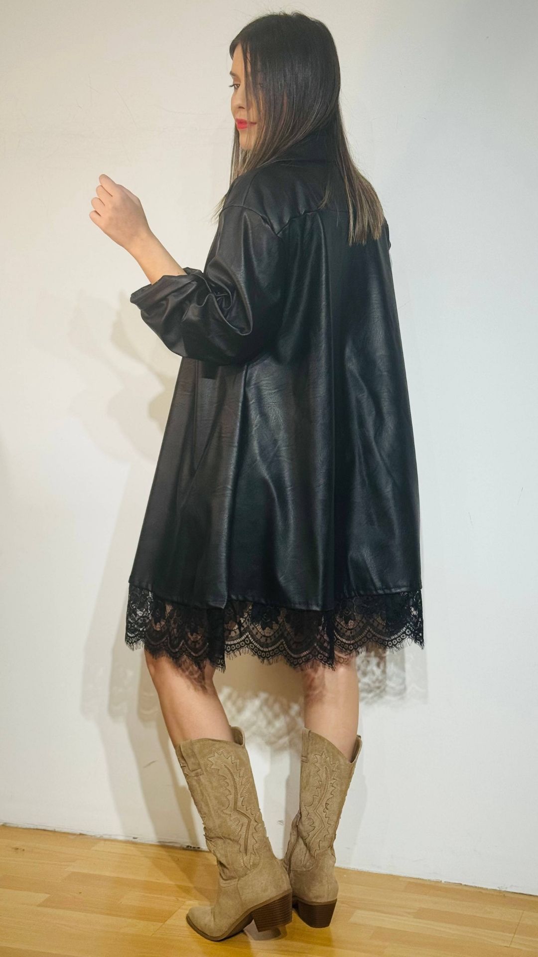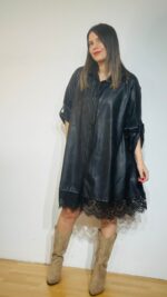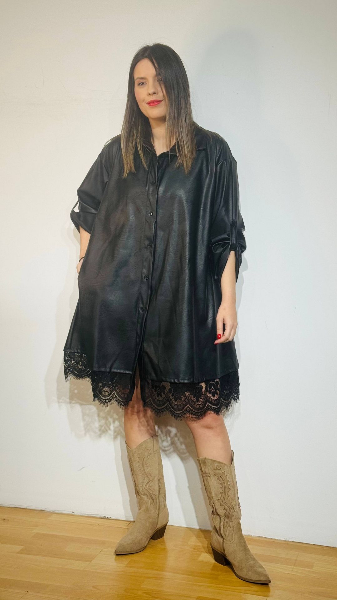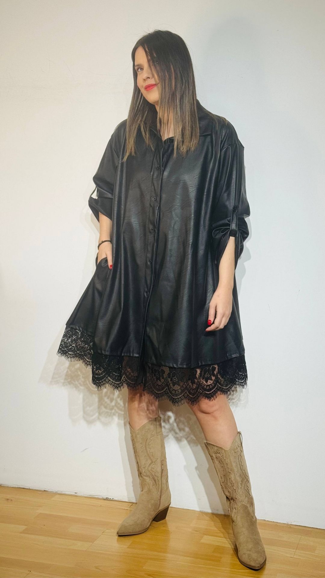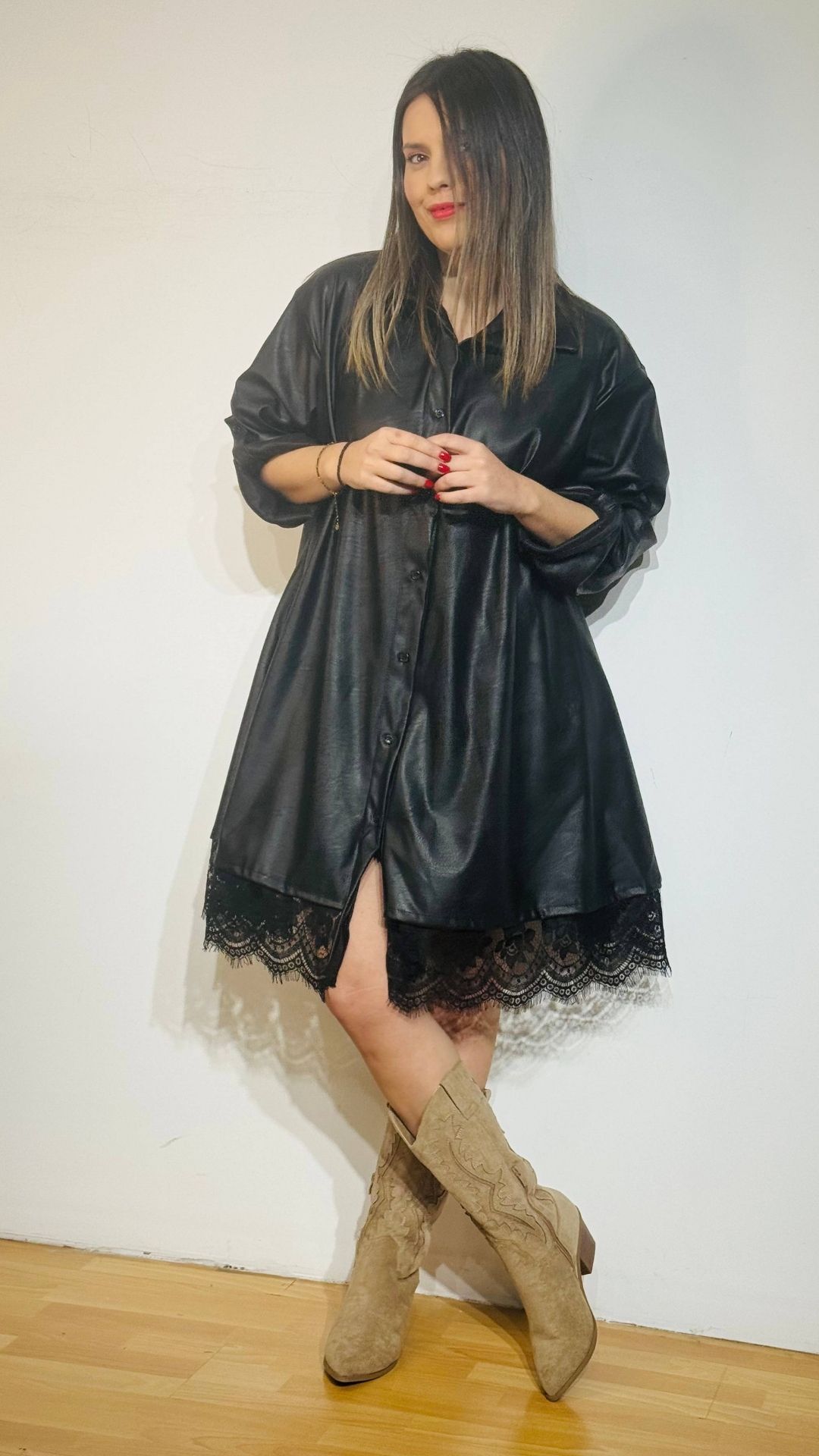 Φόρεμα σεμιζιέ με κουμπάκια κατά μηκος, απο οικολογικό δέρμα σε χαλαρή γραμμή. Διαθέτει πλαινές τσέπες και δαντέλα περιμετρικά στο τελείωμα.