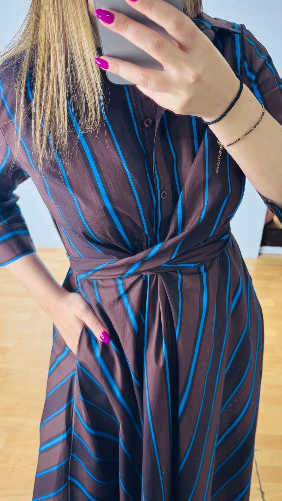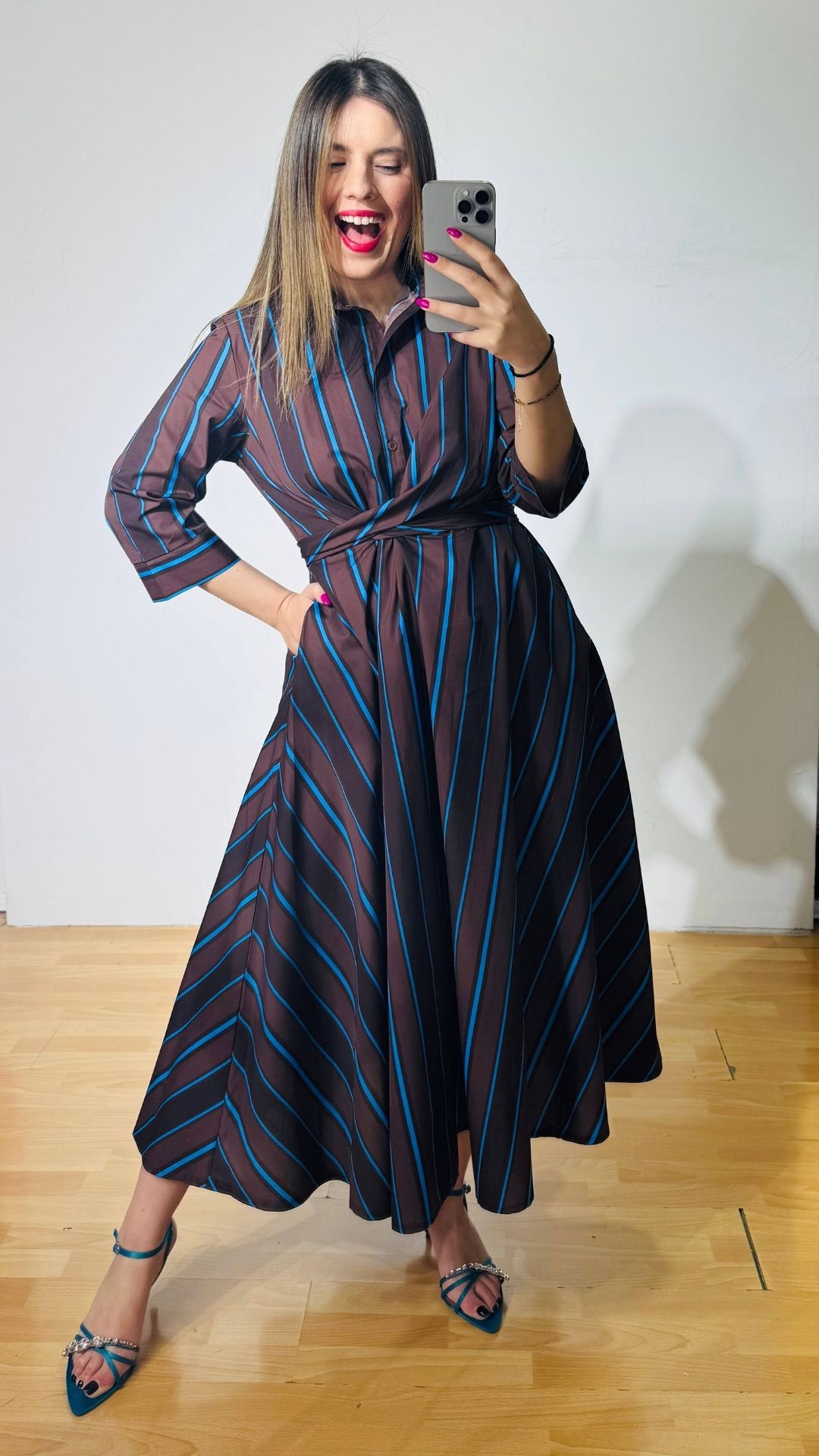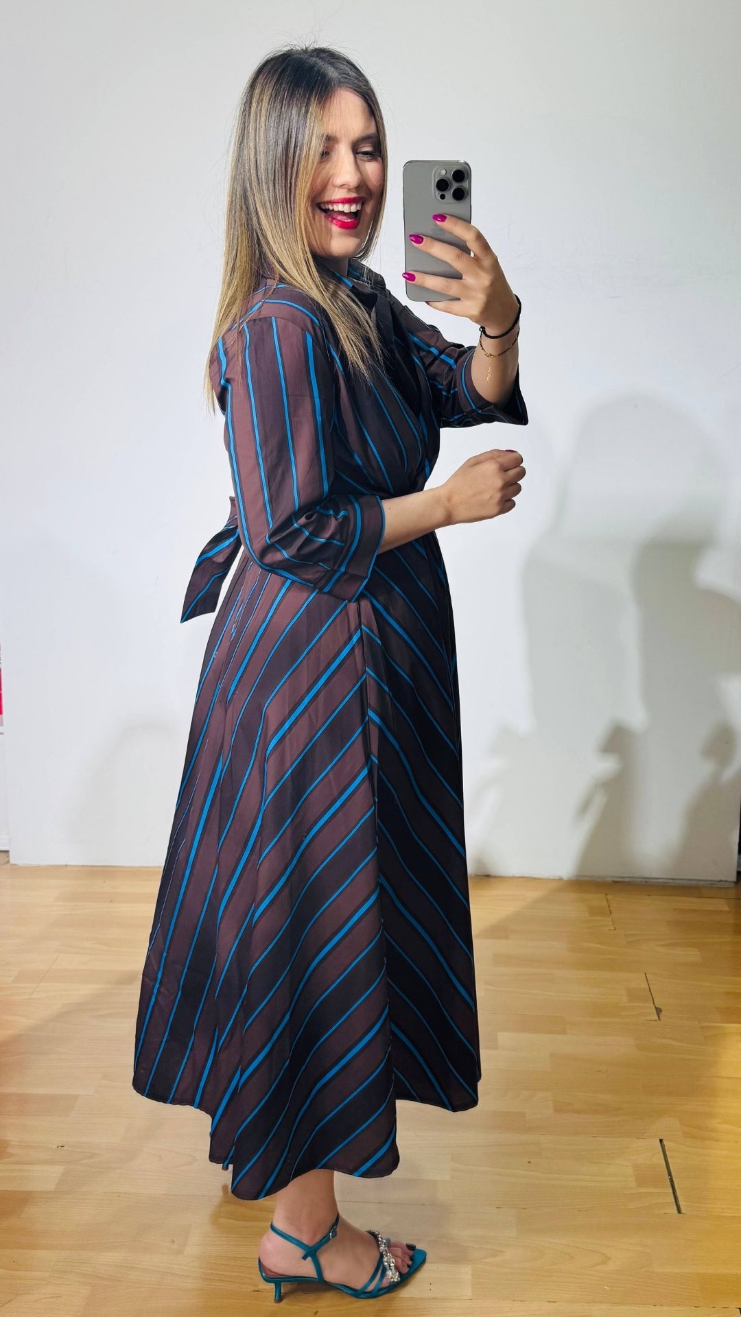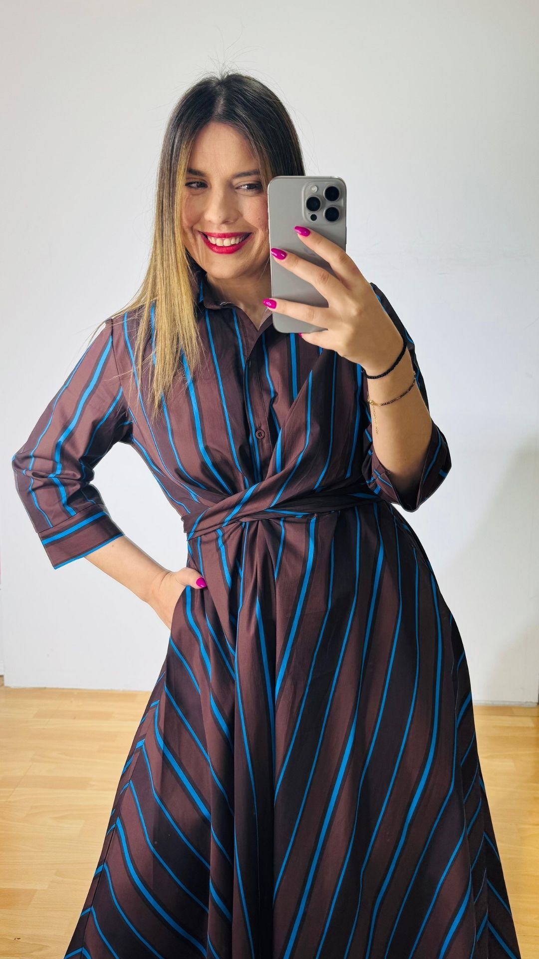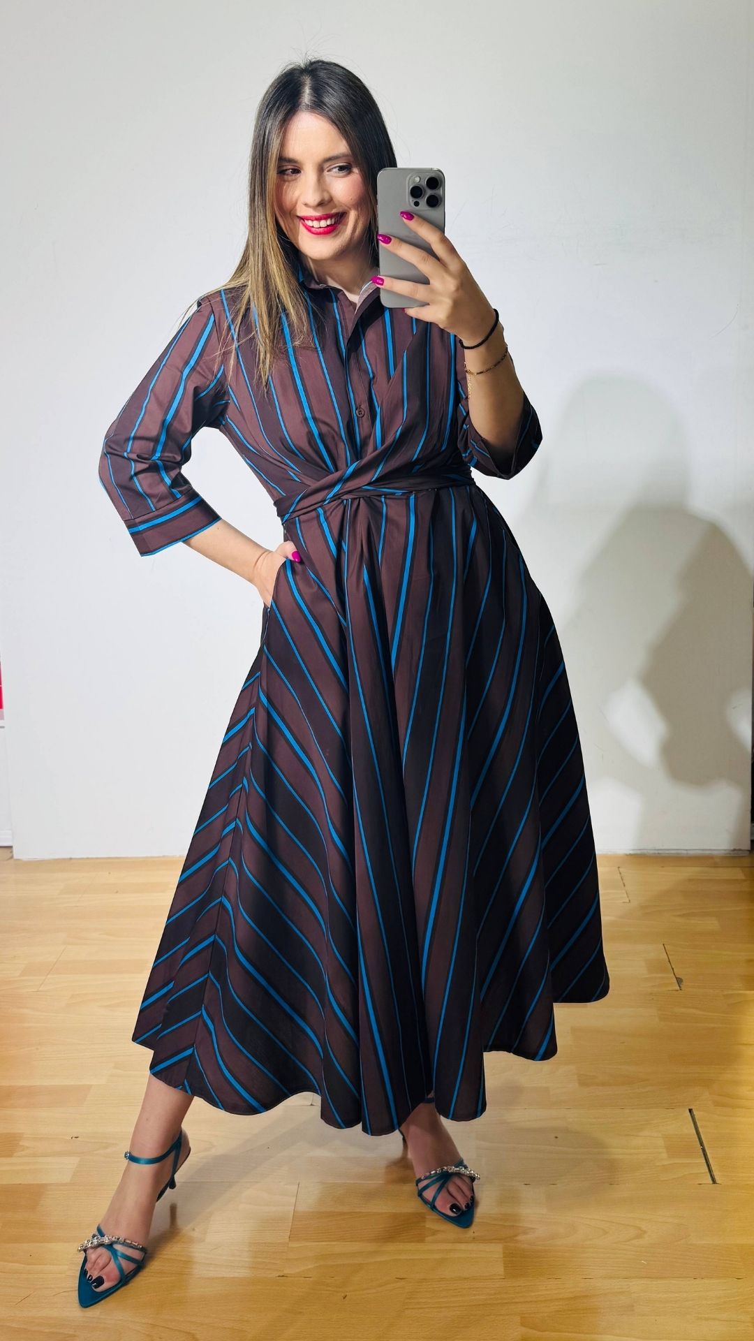 Φόρεμα από βαμβακερή ποπλίνα με πολυμορφικό δέσιμο στην μέση, κουμπάκια έως το ύψος της κοιλιάς με τρουακάρ μανίκια.