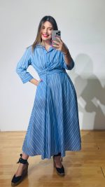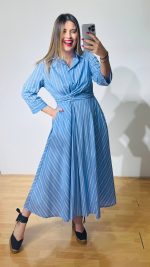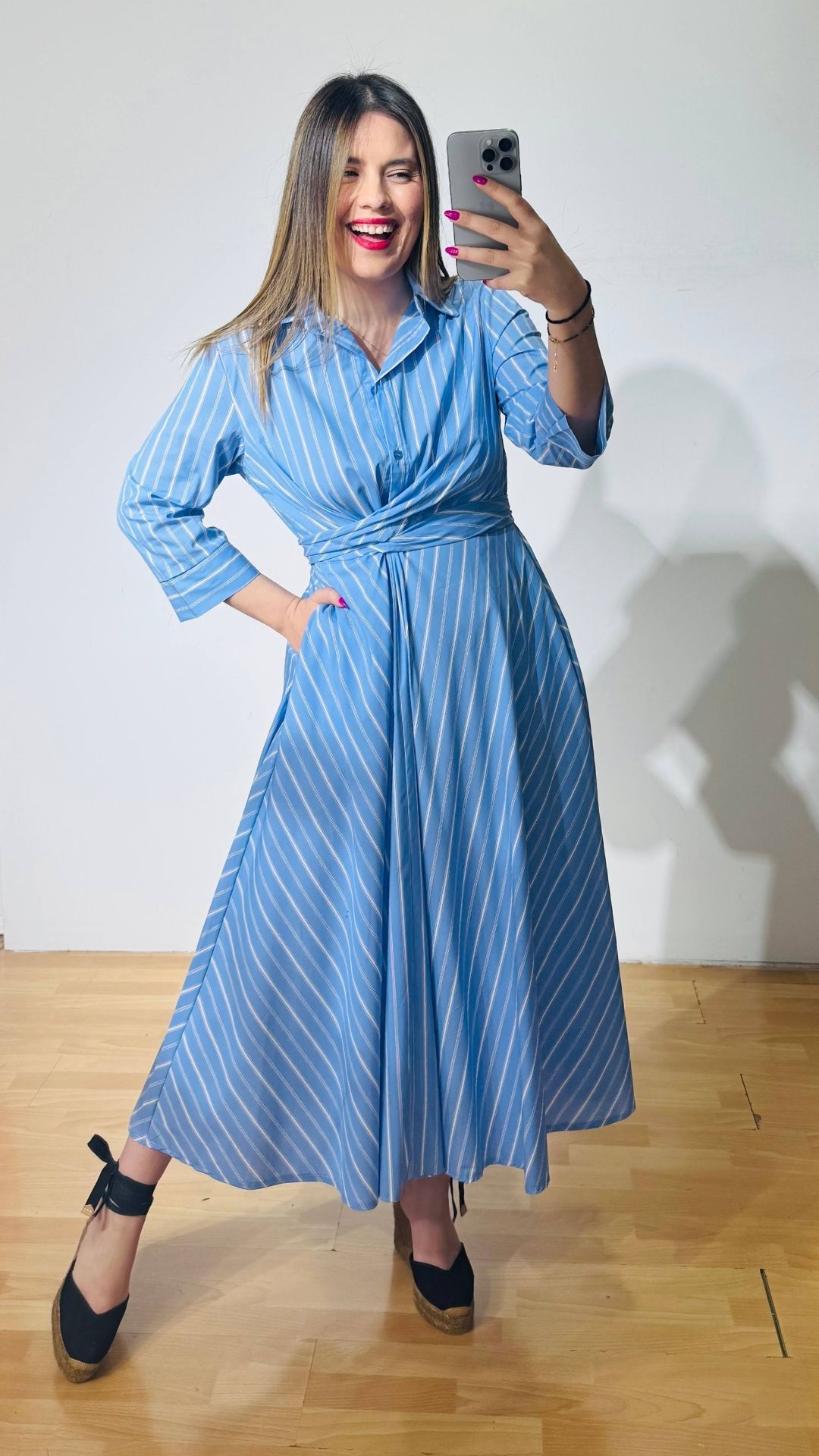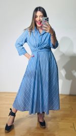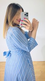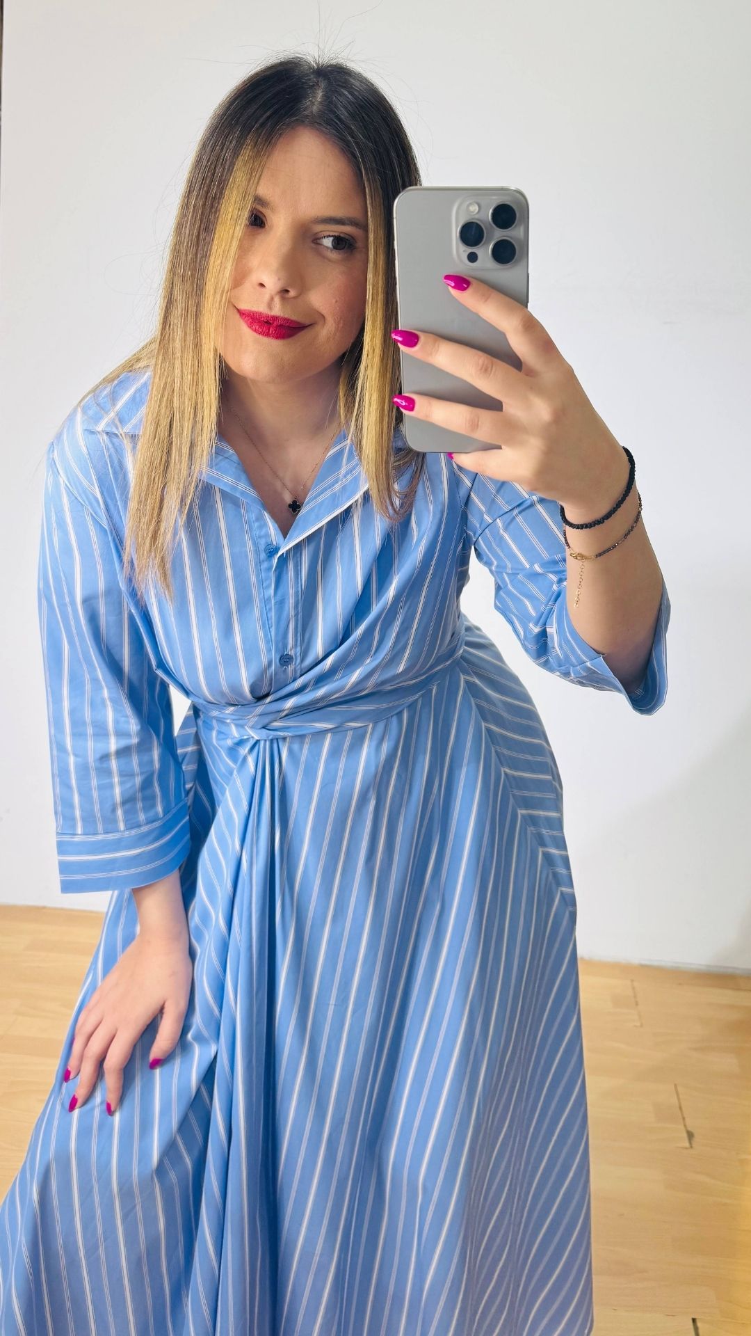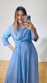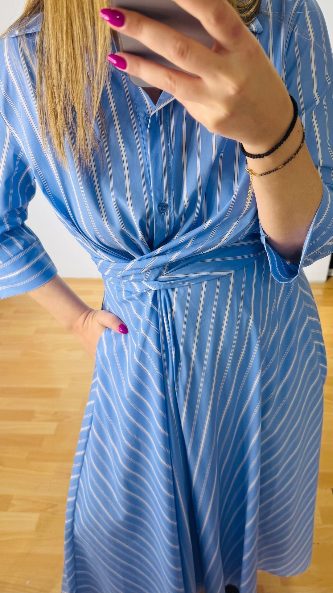 Φόρεμα από βαμβακερή ποπλίνα με πολυμορφικό δέσιμο στην μέση, κουμπάκια έως το ύψος της κοιλιάς με τρουακάρ μανίκια.