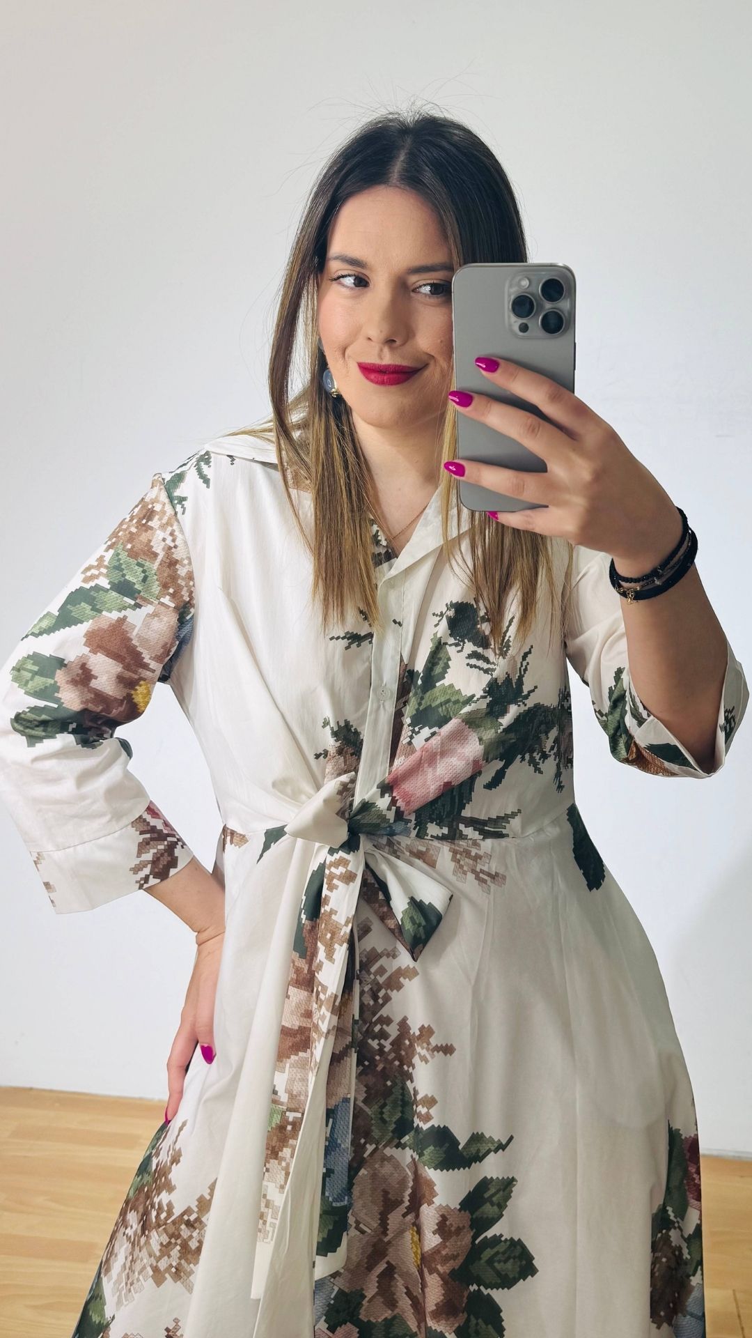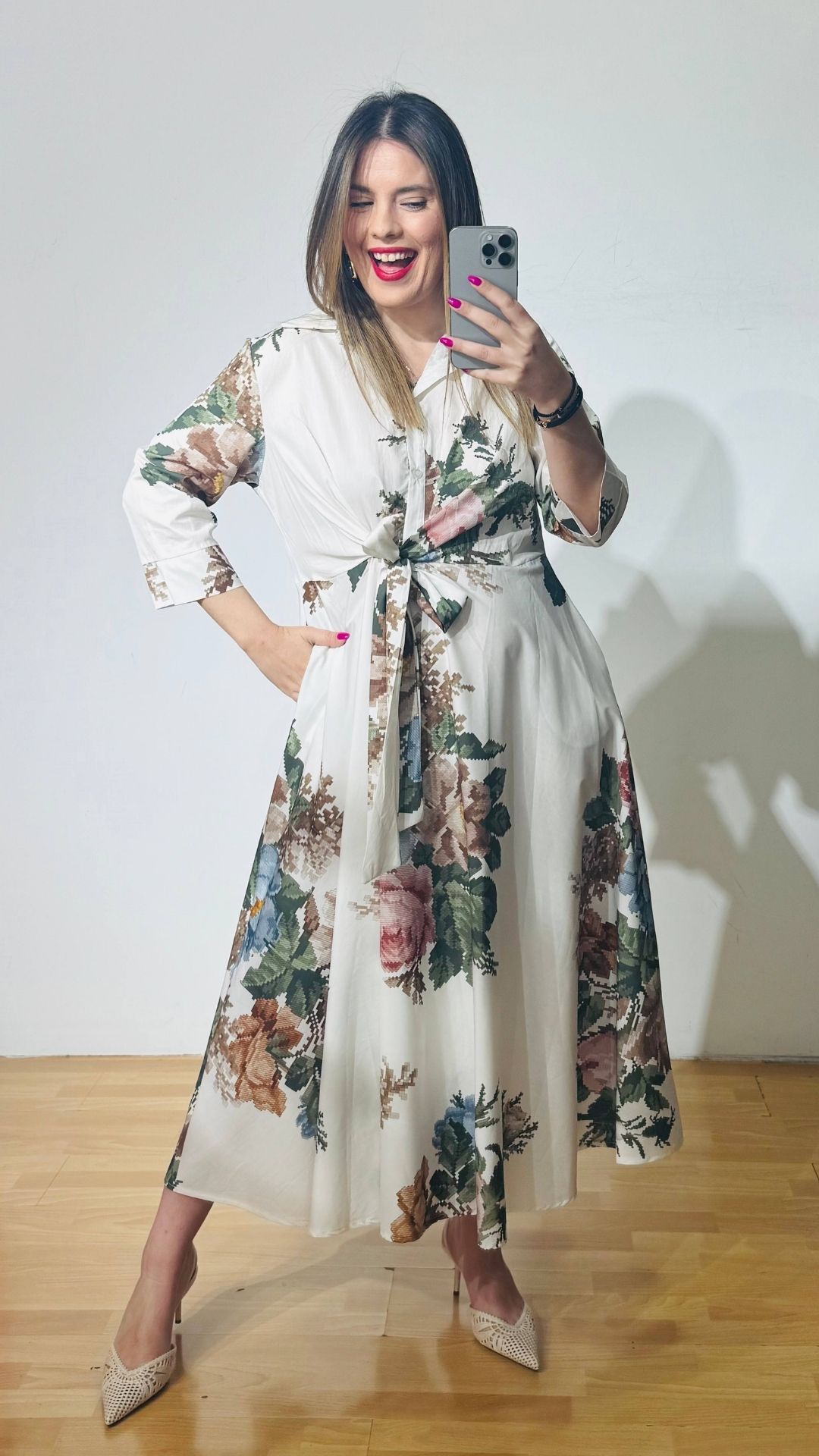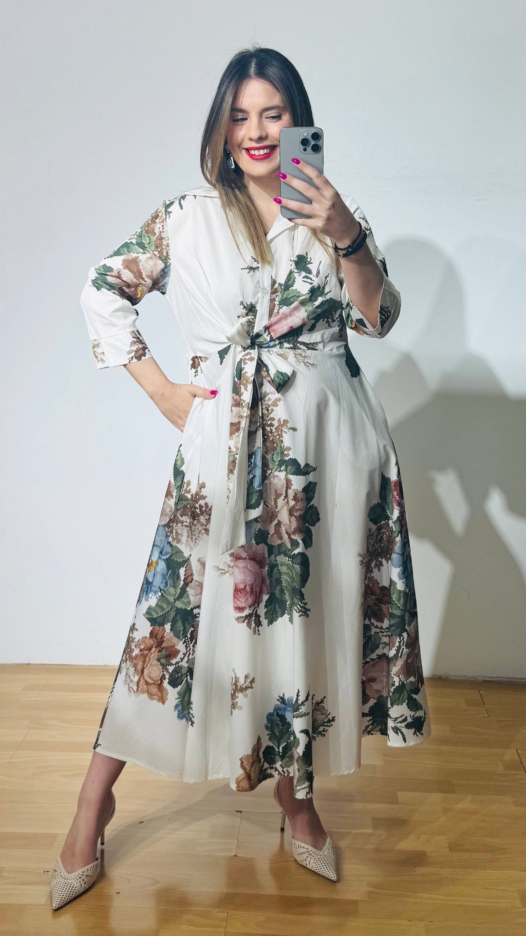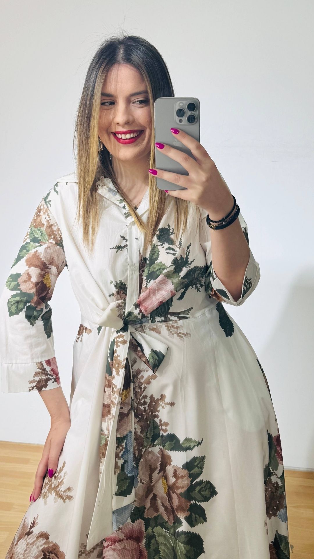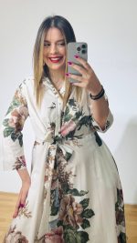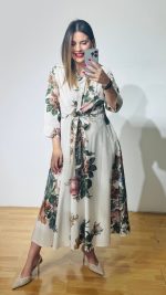 Φόρεμα από βαμβακερή ποπλίνα με πολυμορφικό δέσιμο στην μέση, κουμπάκια έως το ύψος της κοιλιάς με τρουακάρ μανίκια.