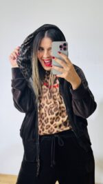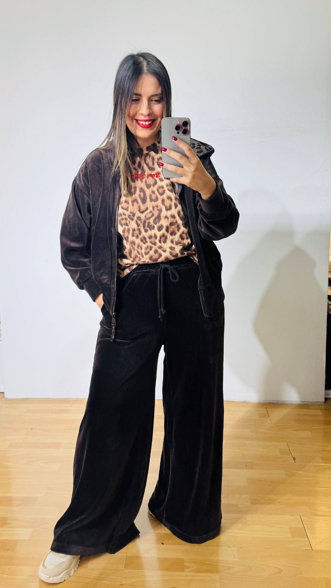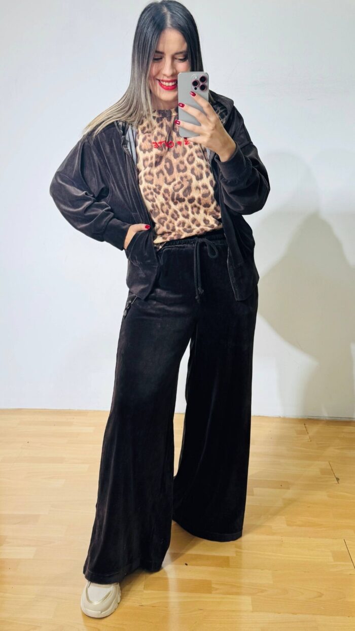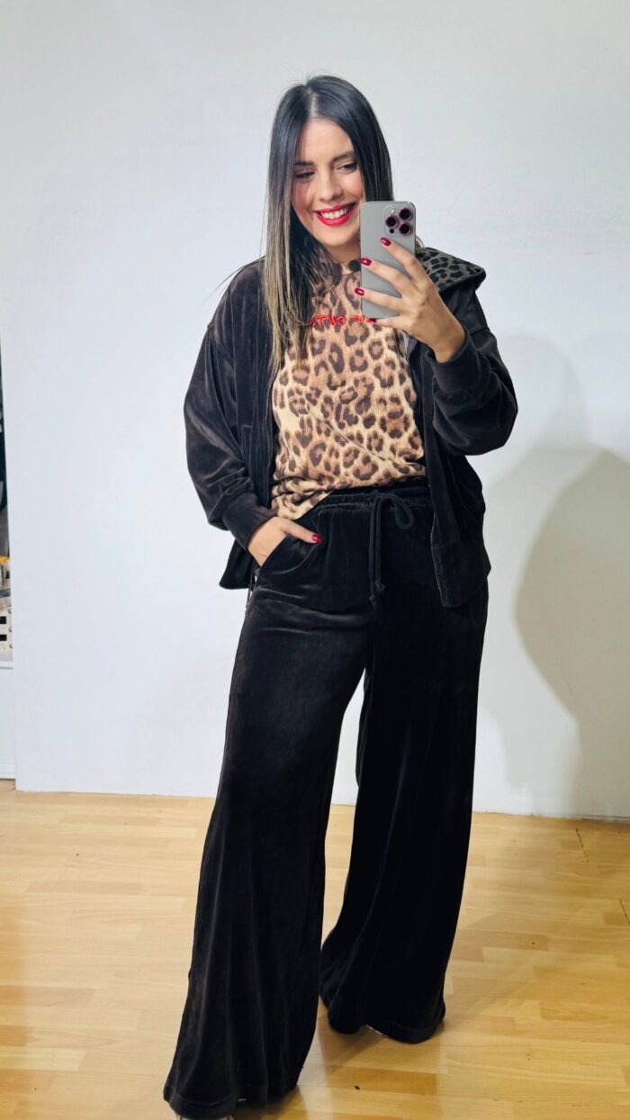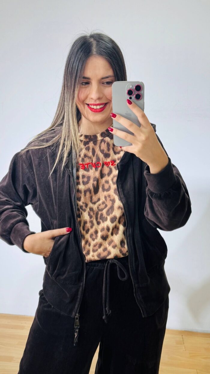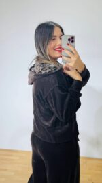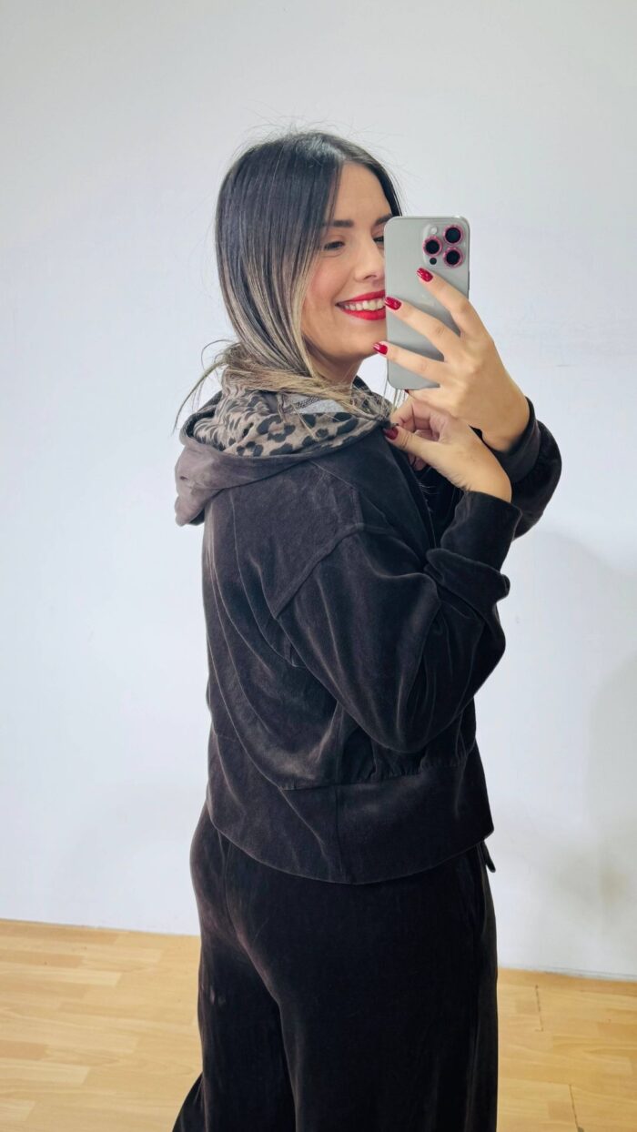 Σετ σοκολά velvet. Αποτελείται από ζακέτα με πλαινές τσέπες , κουκούλα με λεοπαρ επενδυση και κλείνει με φερμουάρ