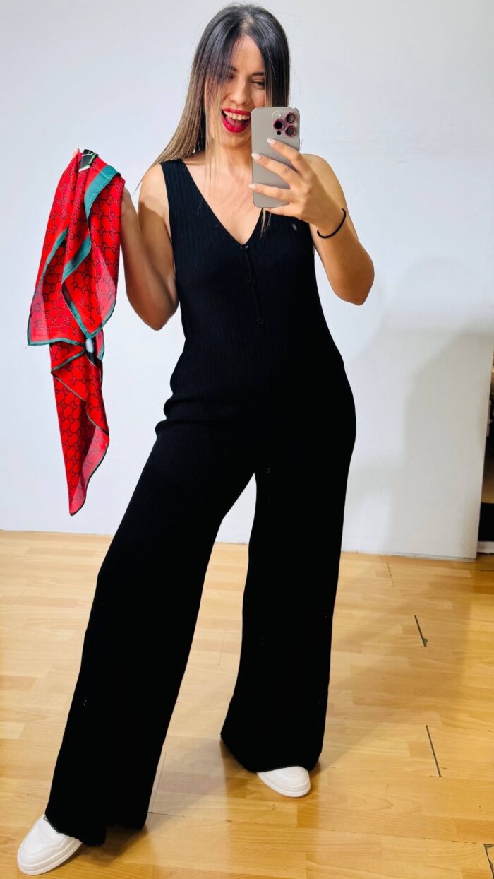 Πλεκτή ριπ ολόσωμη φόρμα με φαρδιά τιράντα, κουμπάκια στο μπροστινό μέρος. Διαθέτει ελαστικότητα