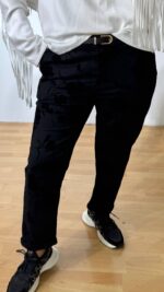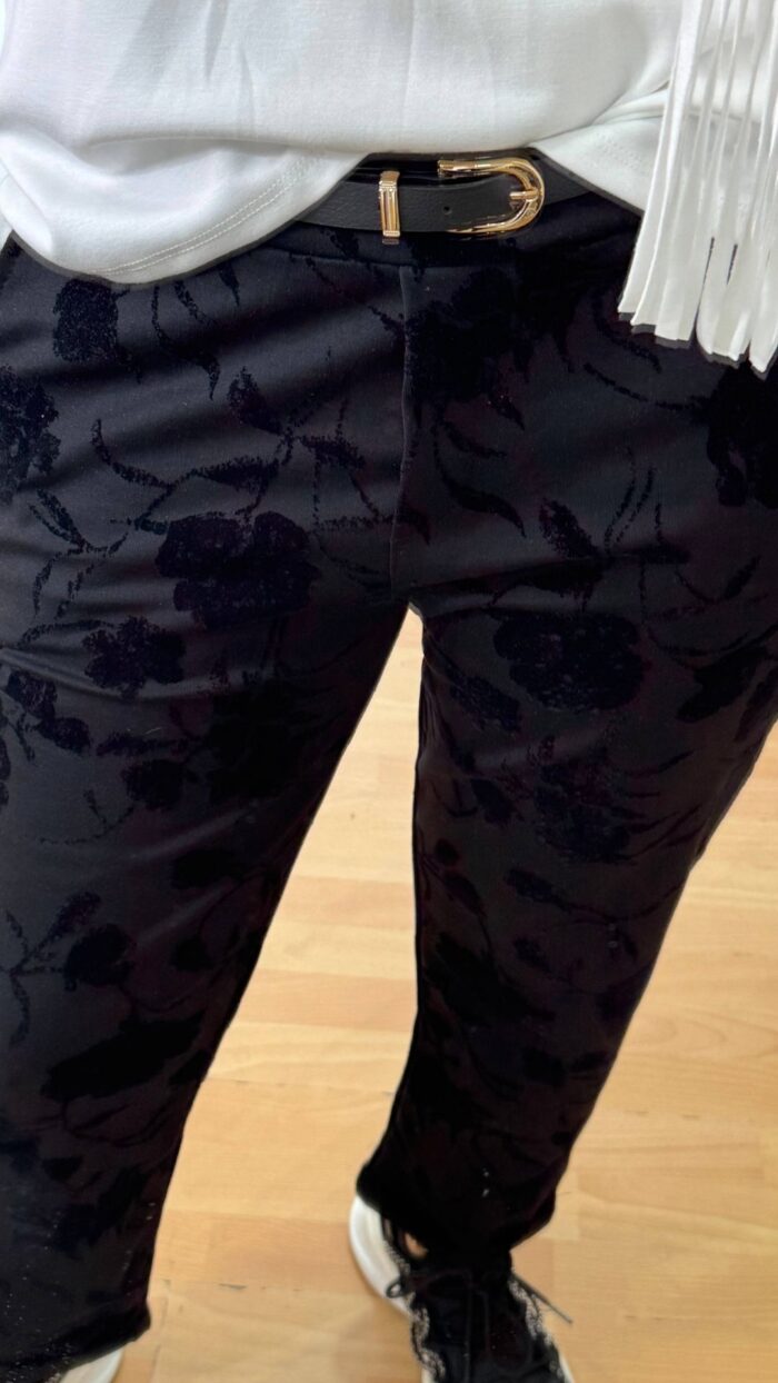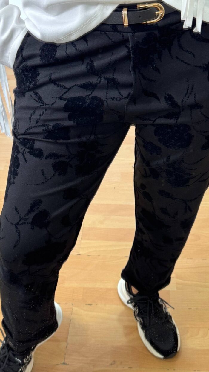 Παντελόνι τύπου σαλβάρι με ανάγλυφα σχέδια βελουτέ, με λάστιχο στην μέση, πλαινές τσέπες και δερμάτινο ζωνάκι