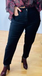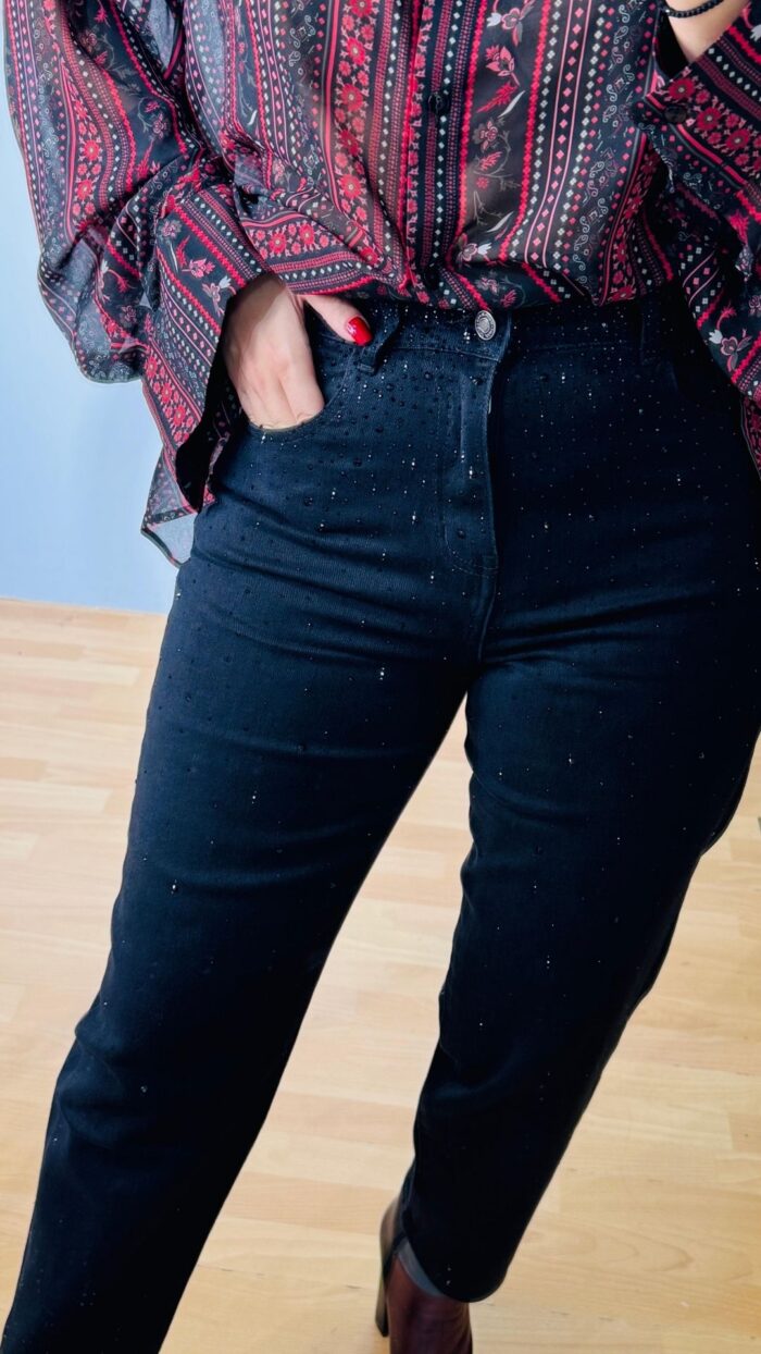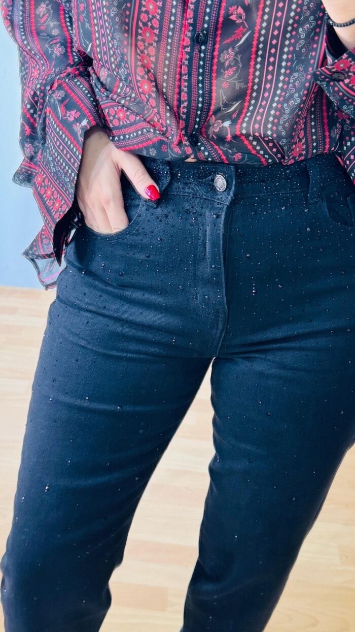 Denim παντελόνι σε buggy γραμμή , βαμβακερό πεντάτσεπο με ελαστικότητα και διάσπαρτα μαύρα κρυστάλλινα στοιχεία σε όλη την μπροστινή όψη. Κλείνει με κουμπί και φερμουάρ.