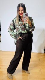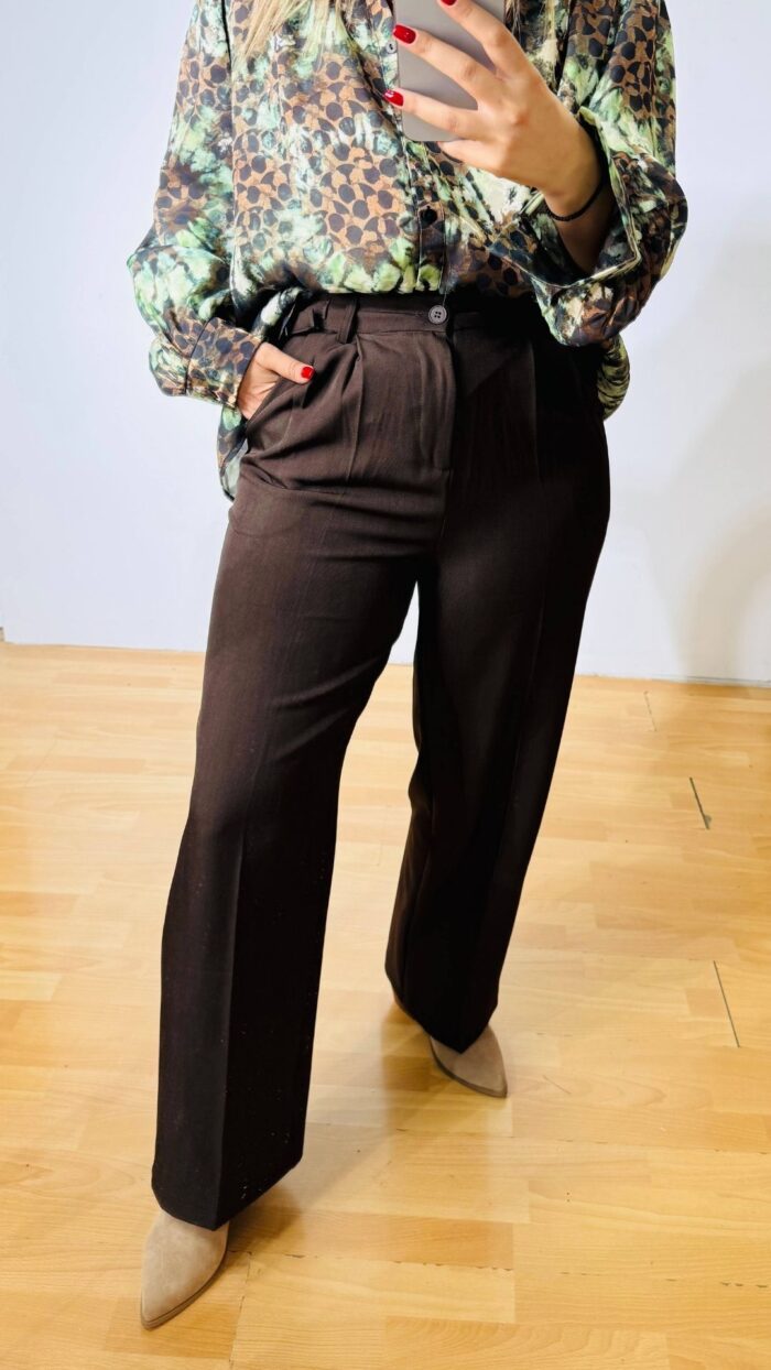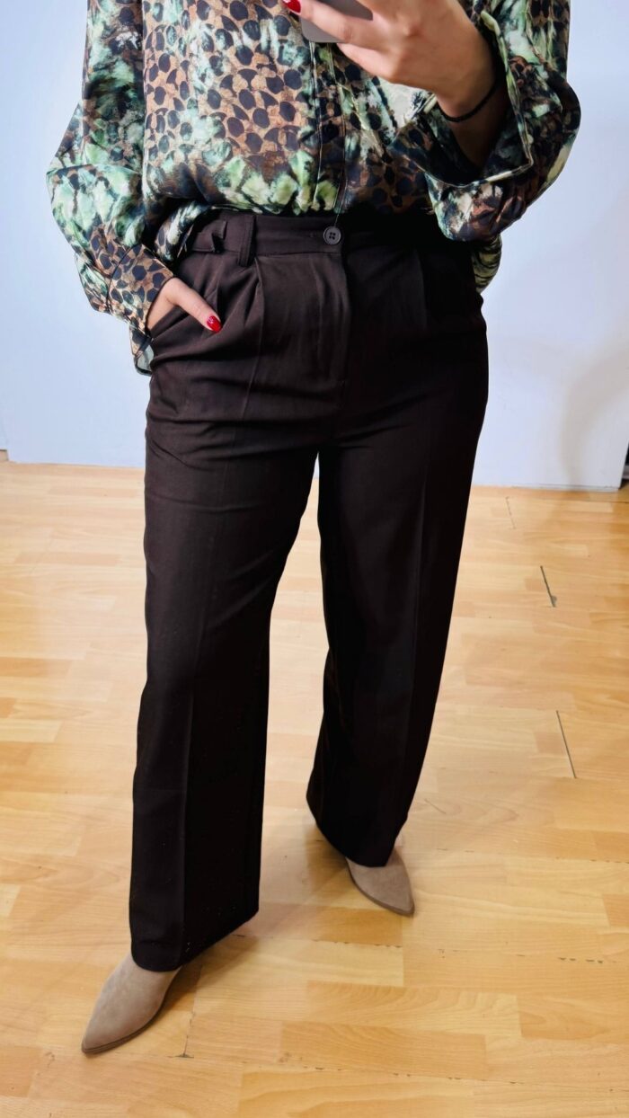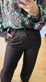 Ψηλόμεση Παντελόνα σε σκούρο σοκολά,με ελαφριά πιέτα, ισόφαρδη, διαθέτει πλαινές τσέπες και θυλάκια στη μέση για να αυξομειώνεται.