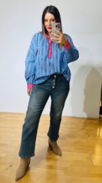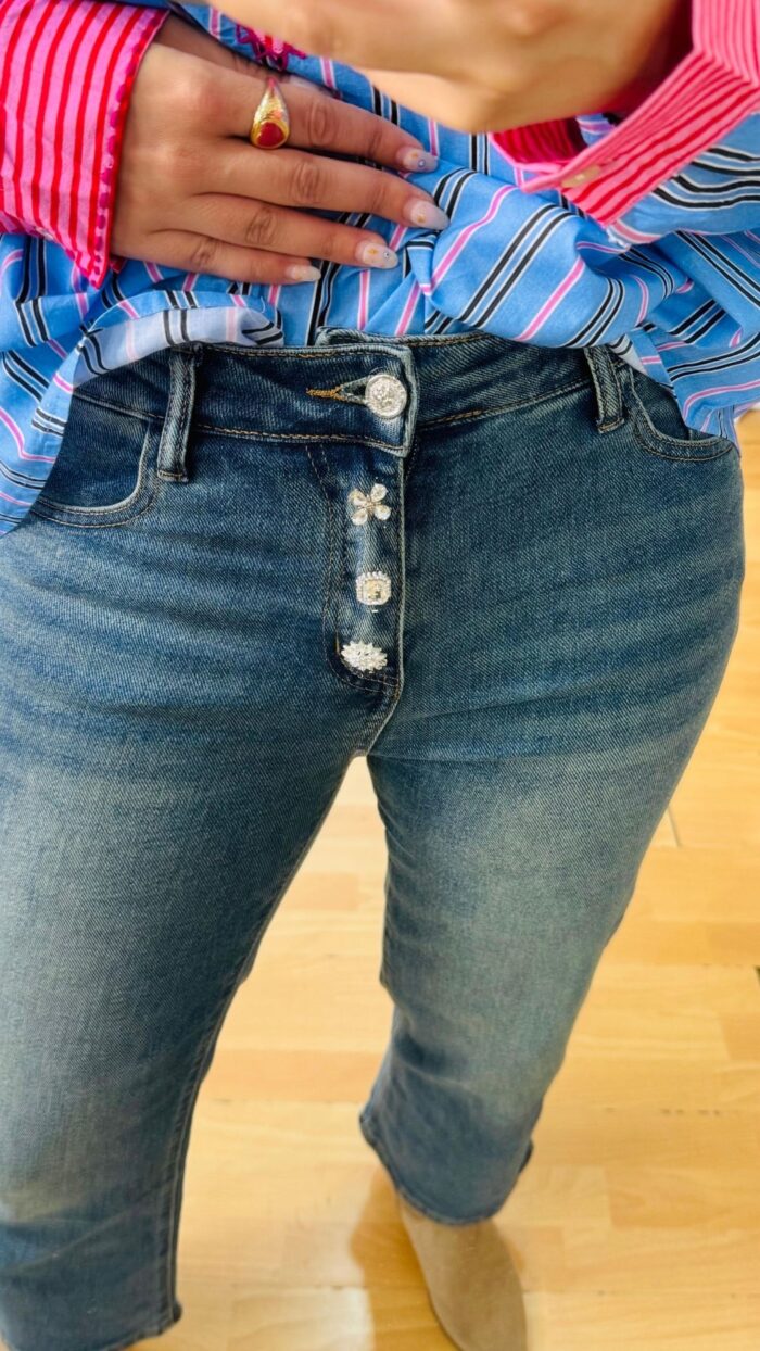 Denim παντελόνι ελαστικό,πεντάτσεπο μέχρι τον αστράγαλο.-Κλείνει με φερμουάρ και κουμπί και Διαθέτει extra κρυστάλλινα διακοσμητικά κουμπιά
