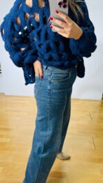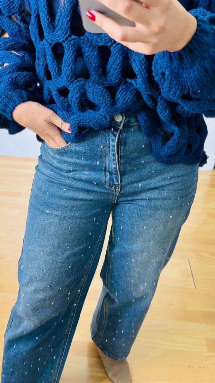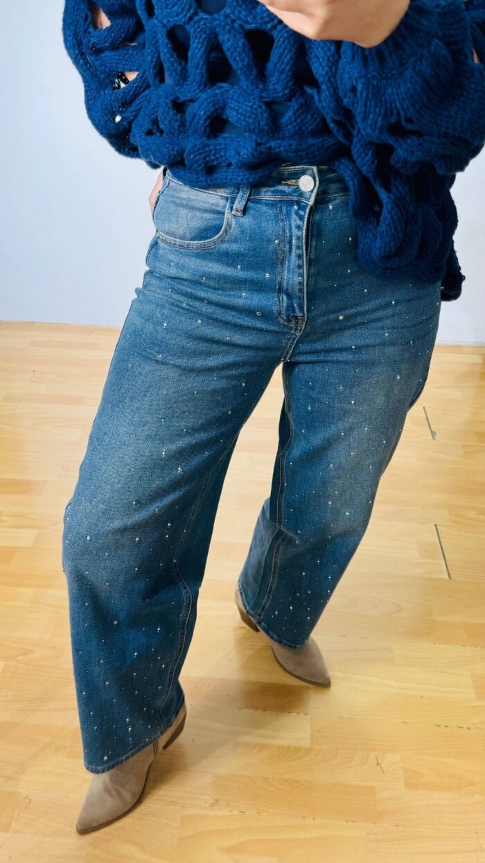 Denim παντελόνι σε buggy γραμμή , βαμβακερό πεντάτσεπο με ελαστικότητα και διάσπαρτα κρυστάλλινα στοιχεία σε όλη την μπροστινή όψη.