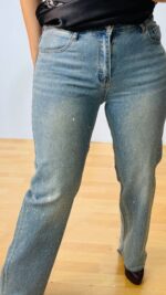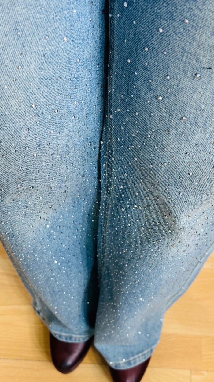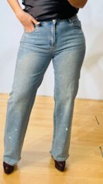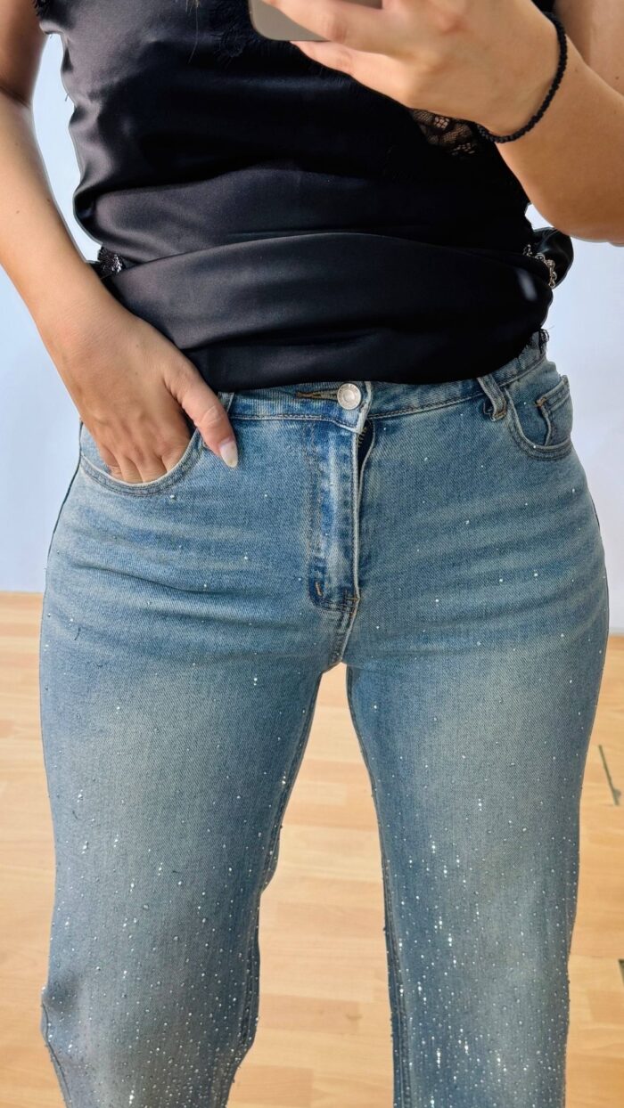 Ψηλόμεσο Denim Παντελόνι Πεντάτσεπο βαμβακερό με ελαστικότητα. Διάσπαρτα στρας στην μπροστινή όψη. Κλείνει με φερμουάρ και κουμπί.