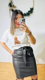Μidi Φούστα από οικολογικό μαλακό δέρμα σε pencil στυλ με ασορτί αποσπώμενη ζώνη φουλάρι, πλαινές τσέπες. Κλείνει με φερμουάρ στο πίσω μέρος.