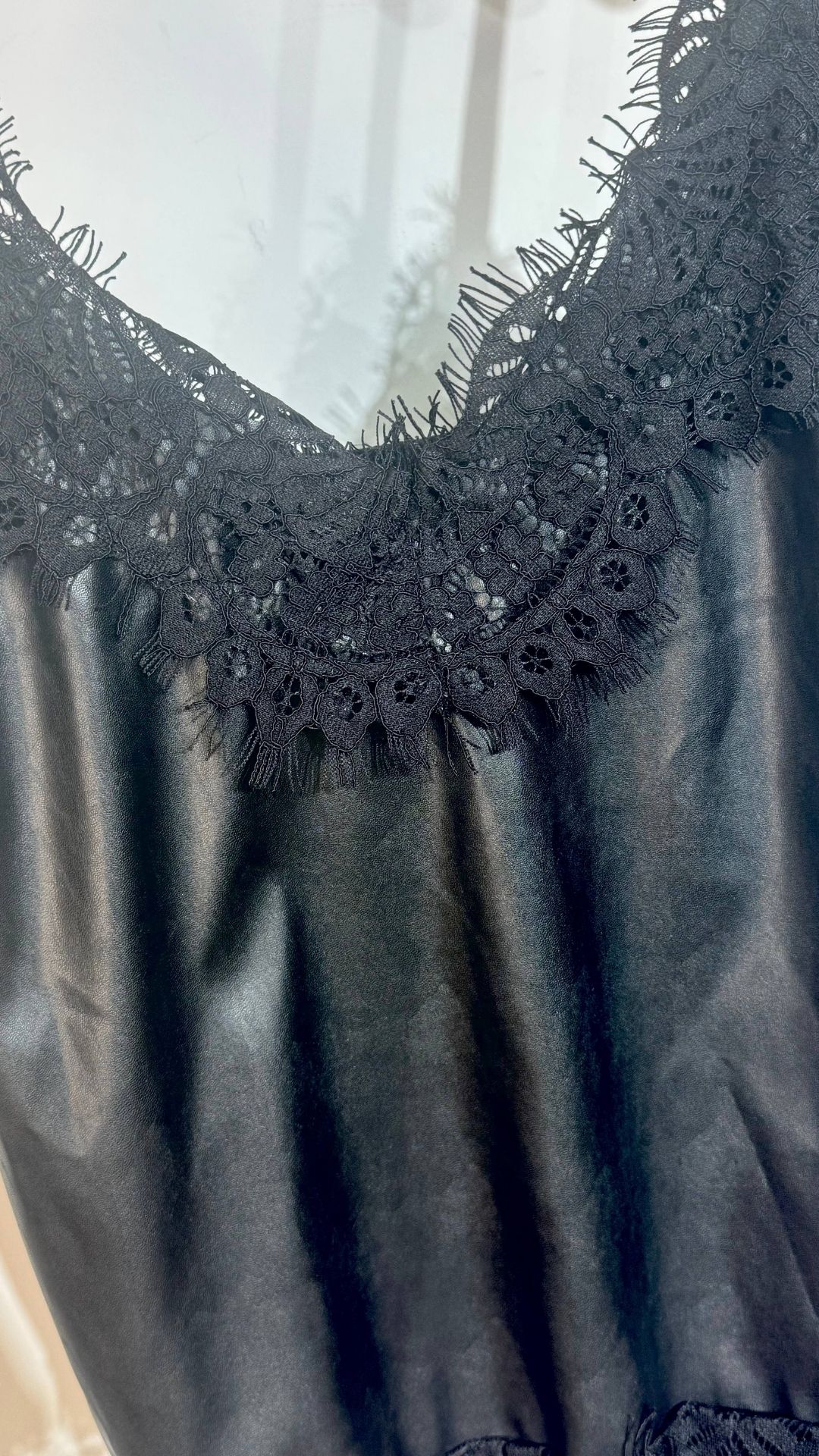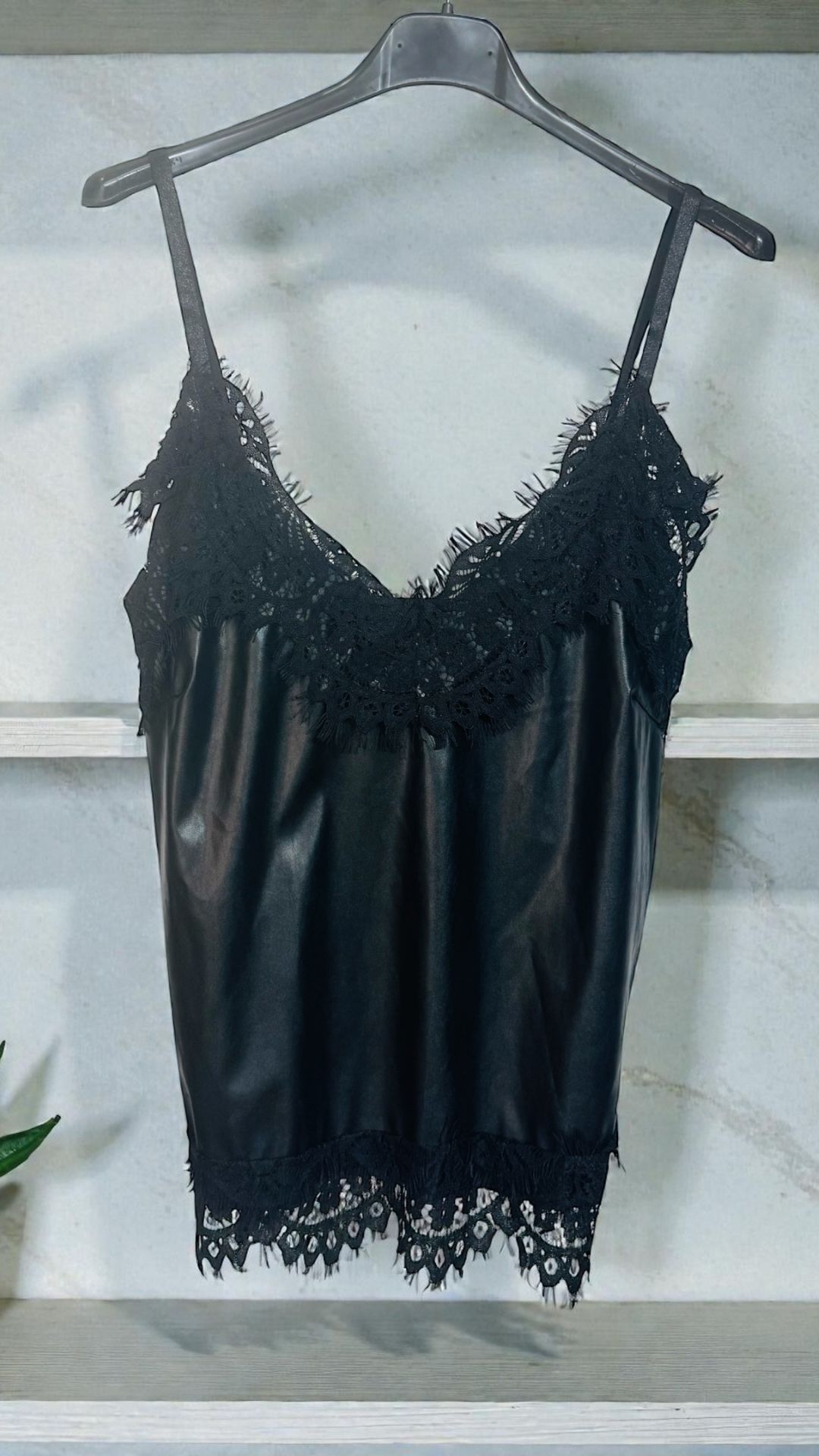 Τοπ από οικολογικό δέρμα . Διαθέτει ελαστικά ρυθμιζόμενα ραντάκια και δαντέλα στο μπούστο και στο τελείωμα