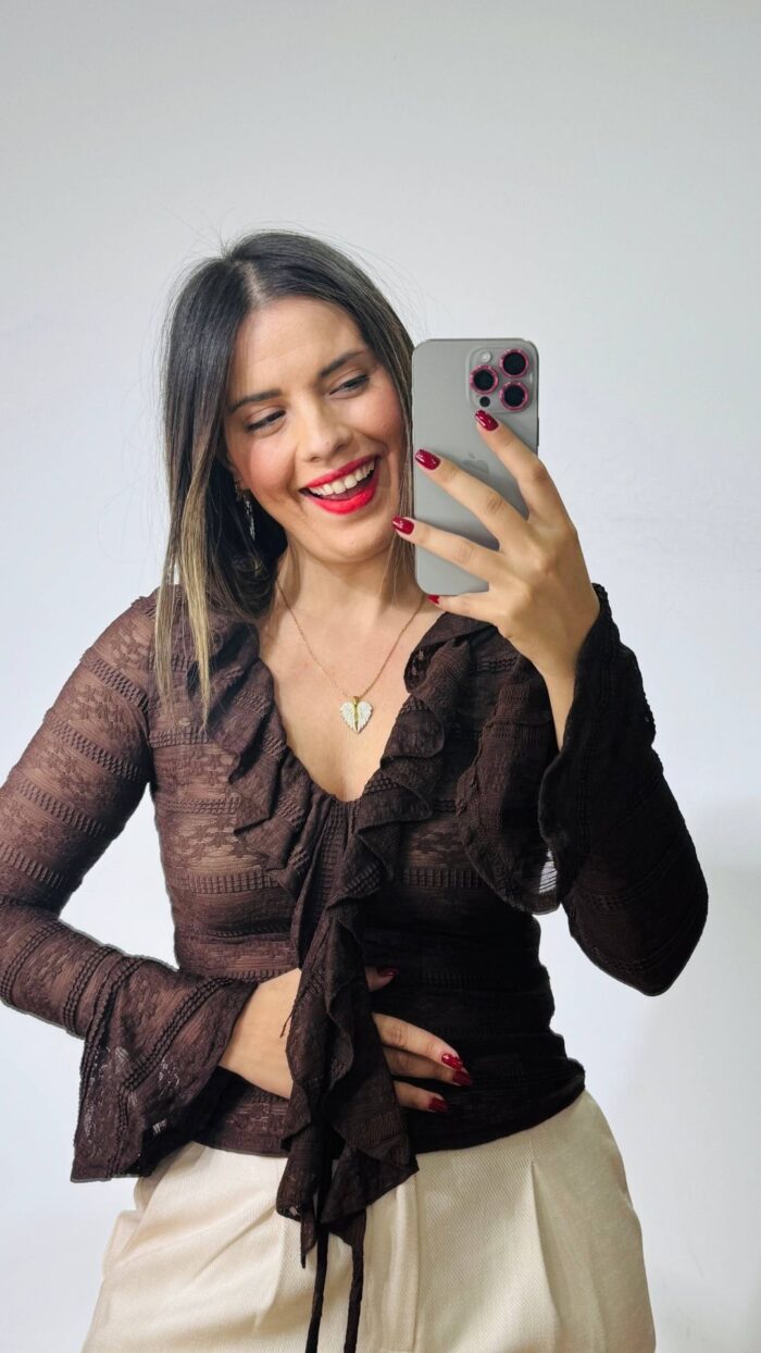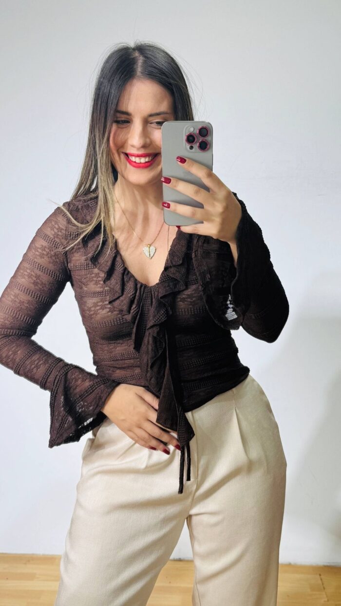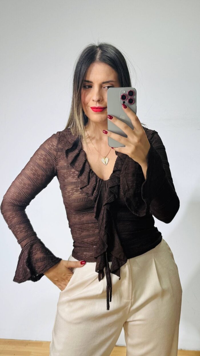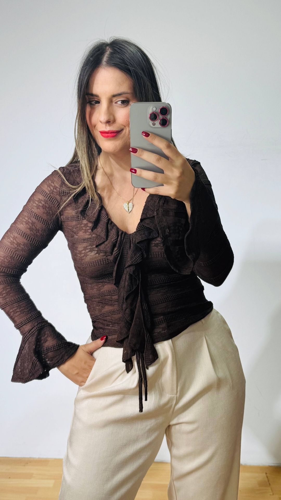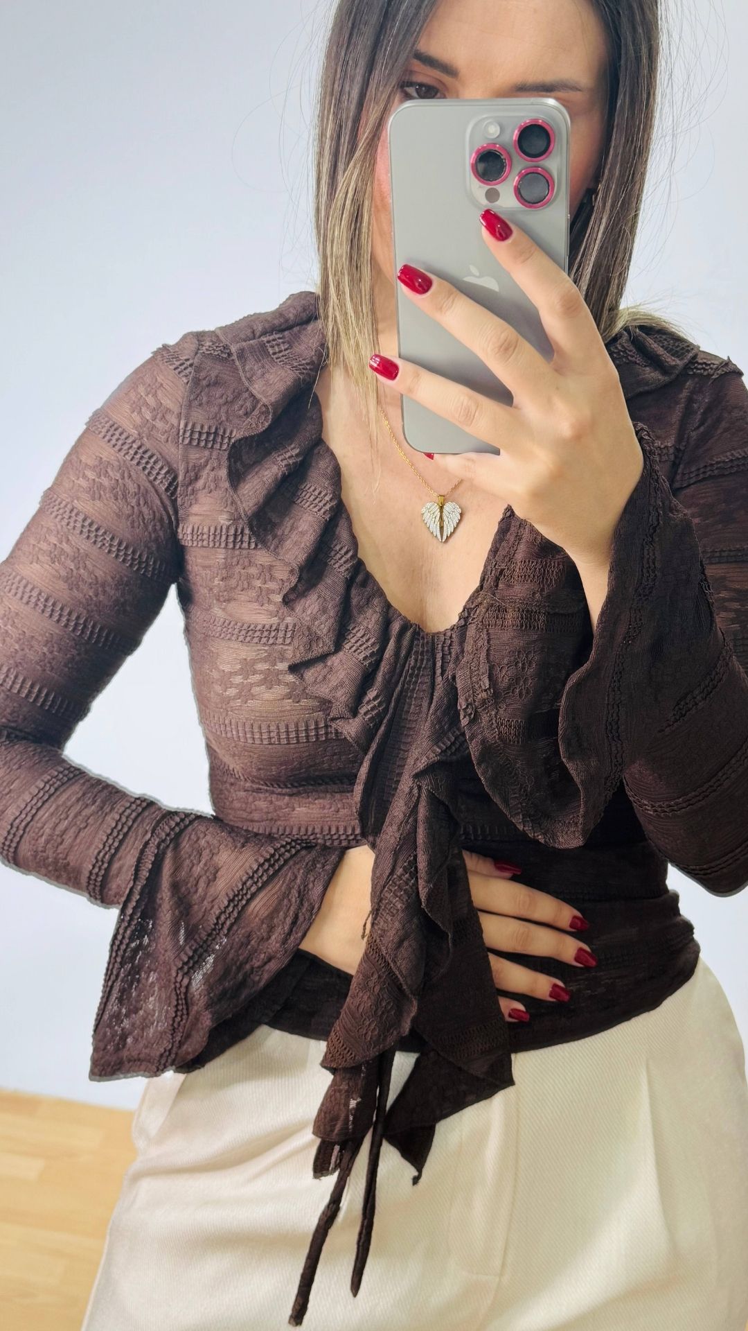 Μπλουζα από ελαστική δαντέλα με βολάν στο μπούστο και στα μανίκια