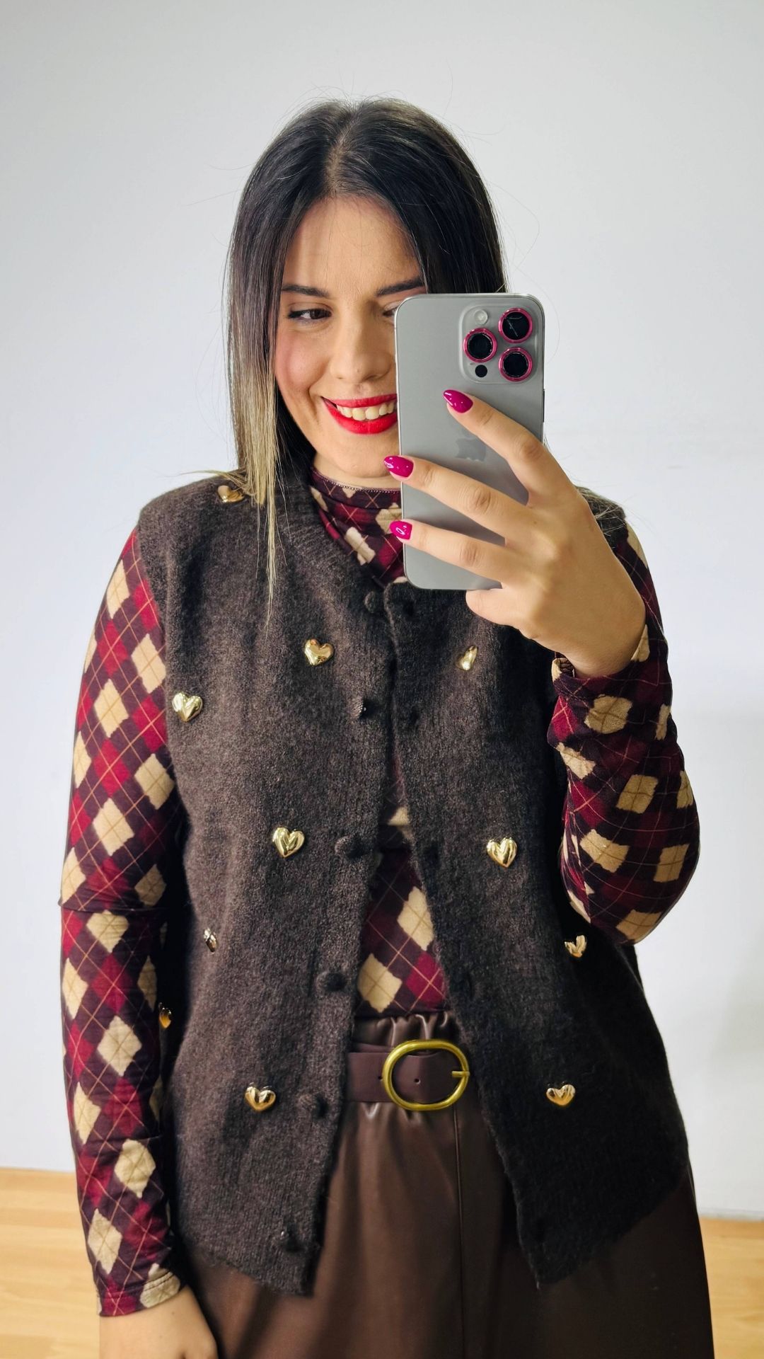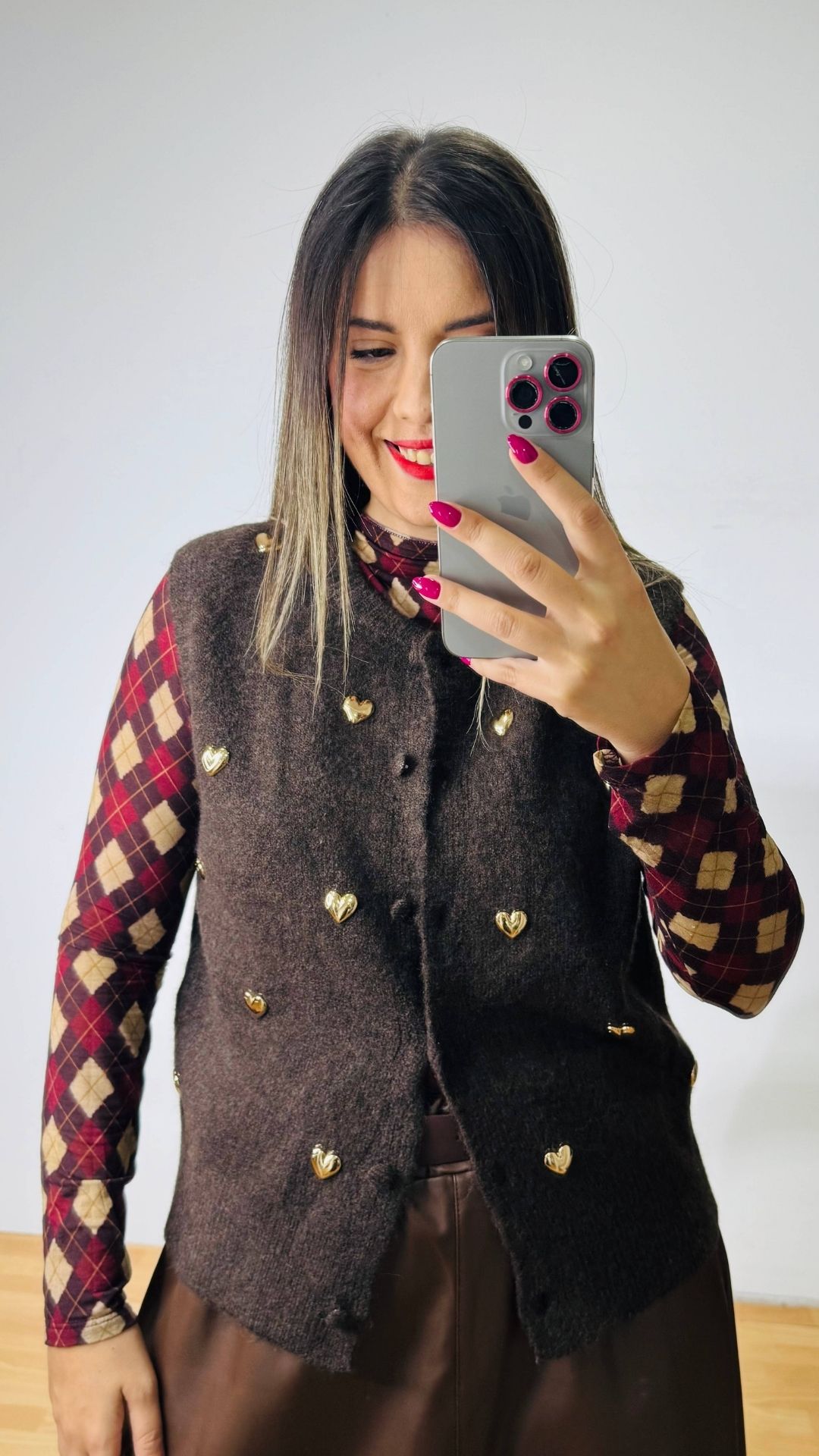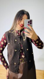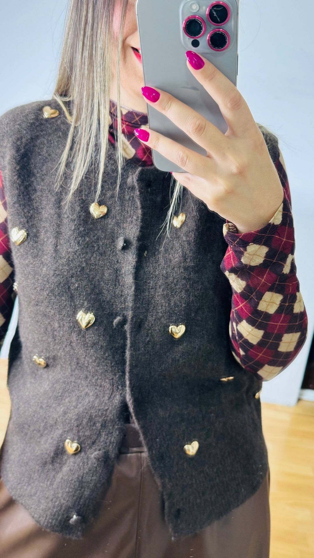 Ζακέτα-Καζάκα πλεκτή διακοσμησμένη με μεταλλικές χρυσές καρδιές στο μπροστινό μέρος.