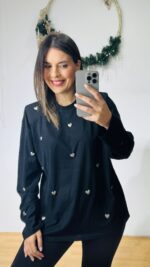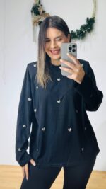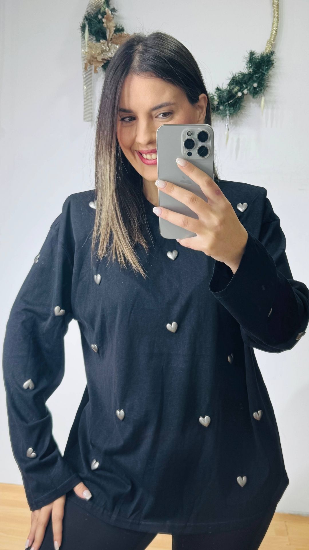 Βαμβακερό Τ-shirt σε χαλαρή γραμμή με μεταλλικές διασπαρτες καρδούλες. Διαθέτει βάτες