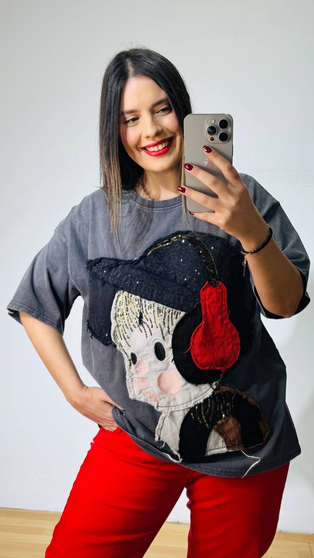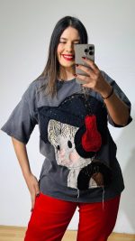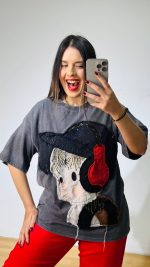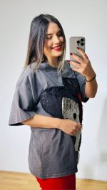 Πετροπλυμένο βαμβακερό T-shirt με χειροποίητο σχέδιο και διάσπαρτες παγέτες