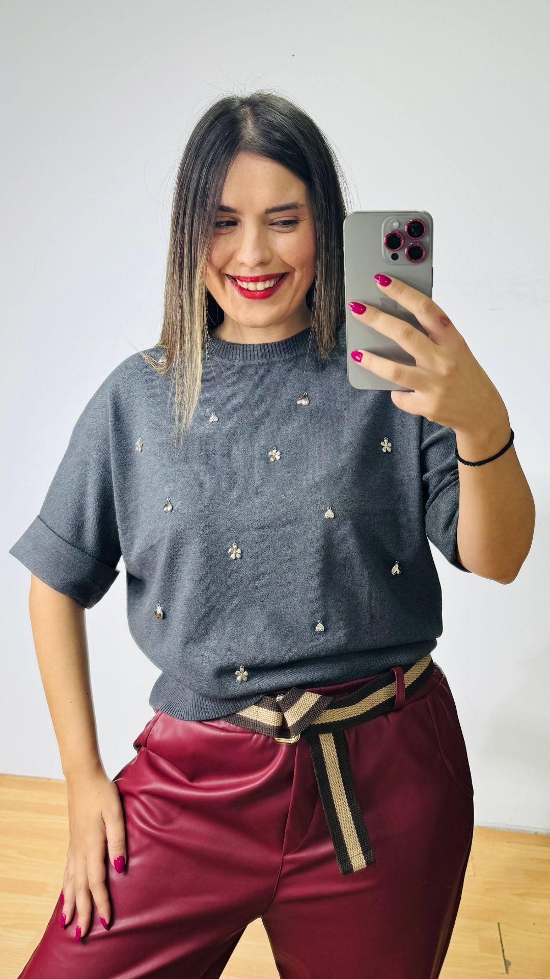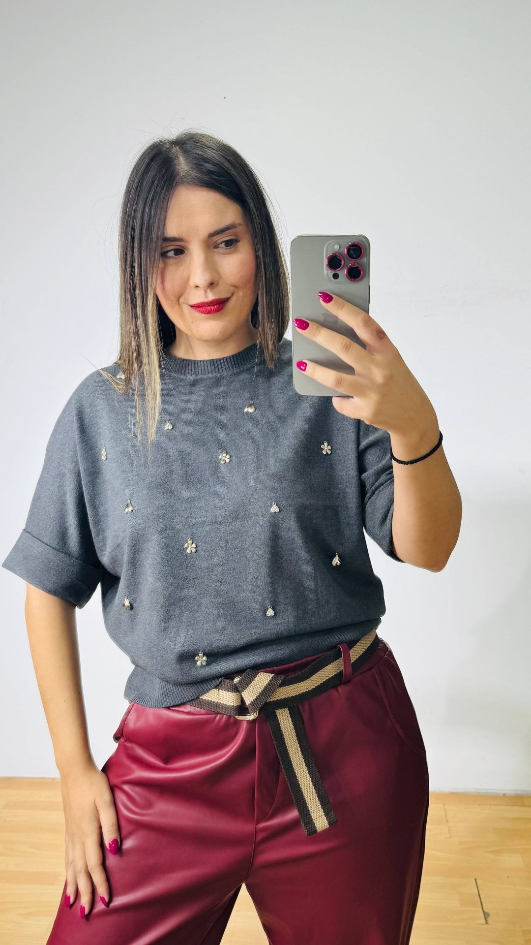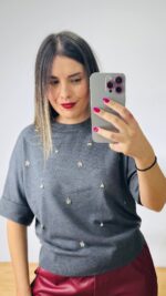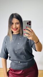 Πουλόβερ Κασμίρ με 3/4 μανίκι ρεβέρ και διακοσμημένο με μεταλλικά στοιχεία στην μπροστινή όψη