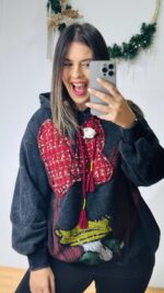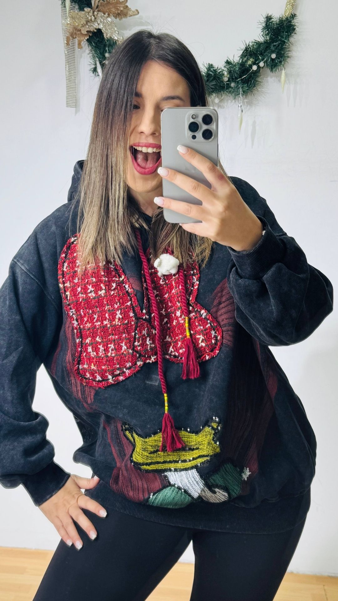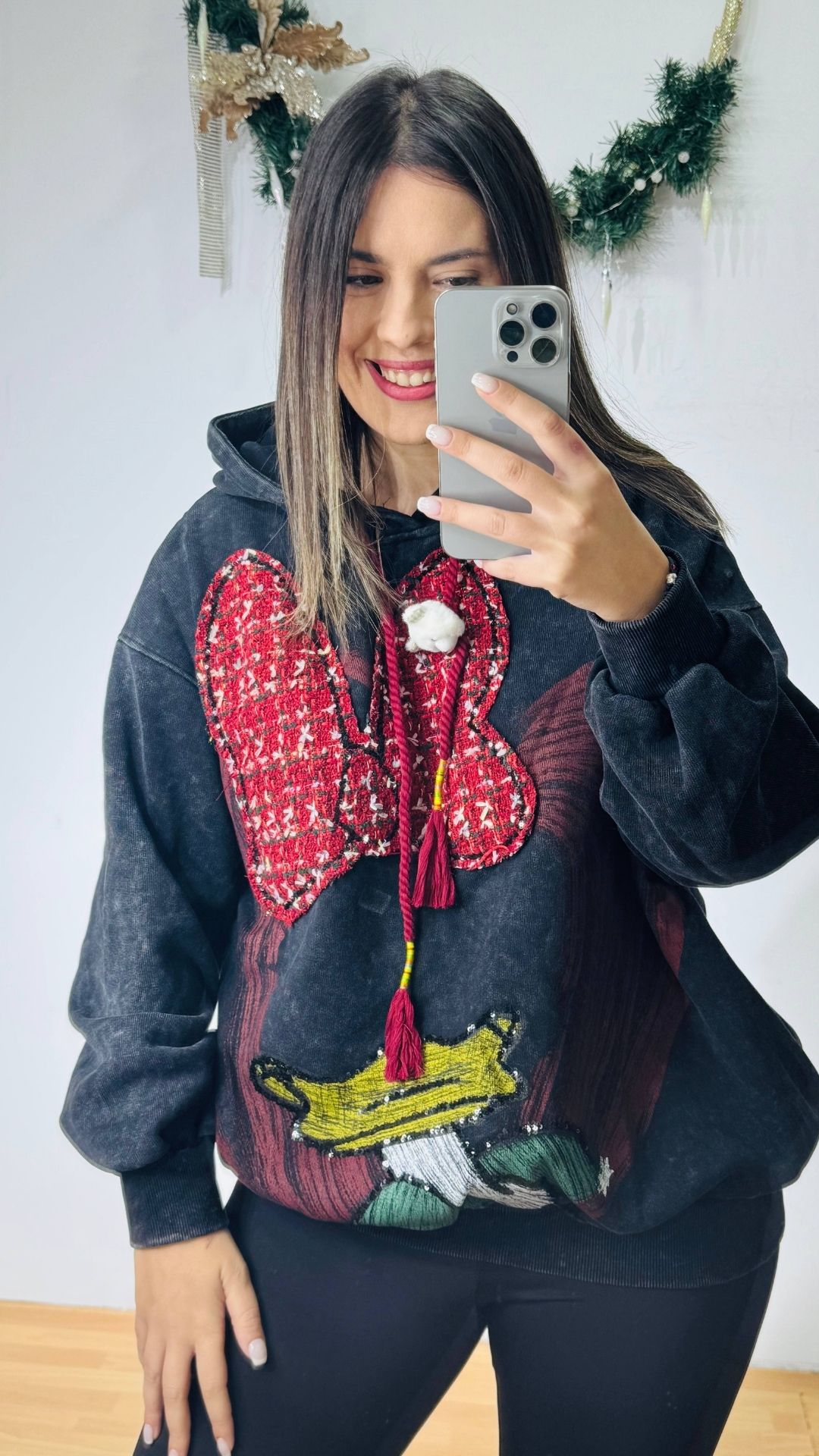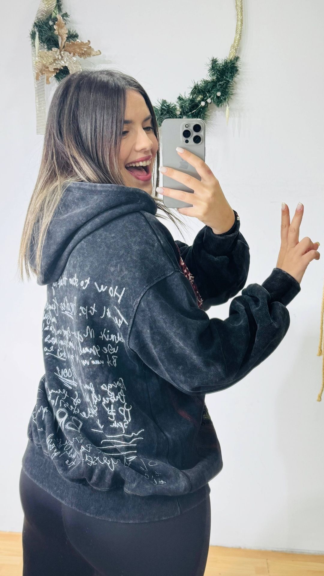 Βαμβακερό πετροπλυμμένο φούτερ με κουκούλα και χειροποίητα σχέδια στην μπροστινή όψη, και σχέδιο μαυροπίνακα στην πίσω όψη.