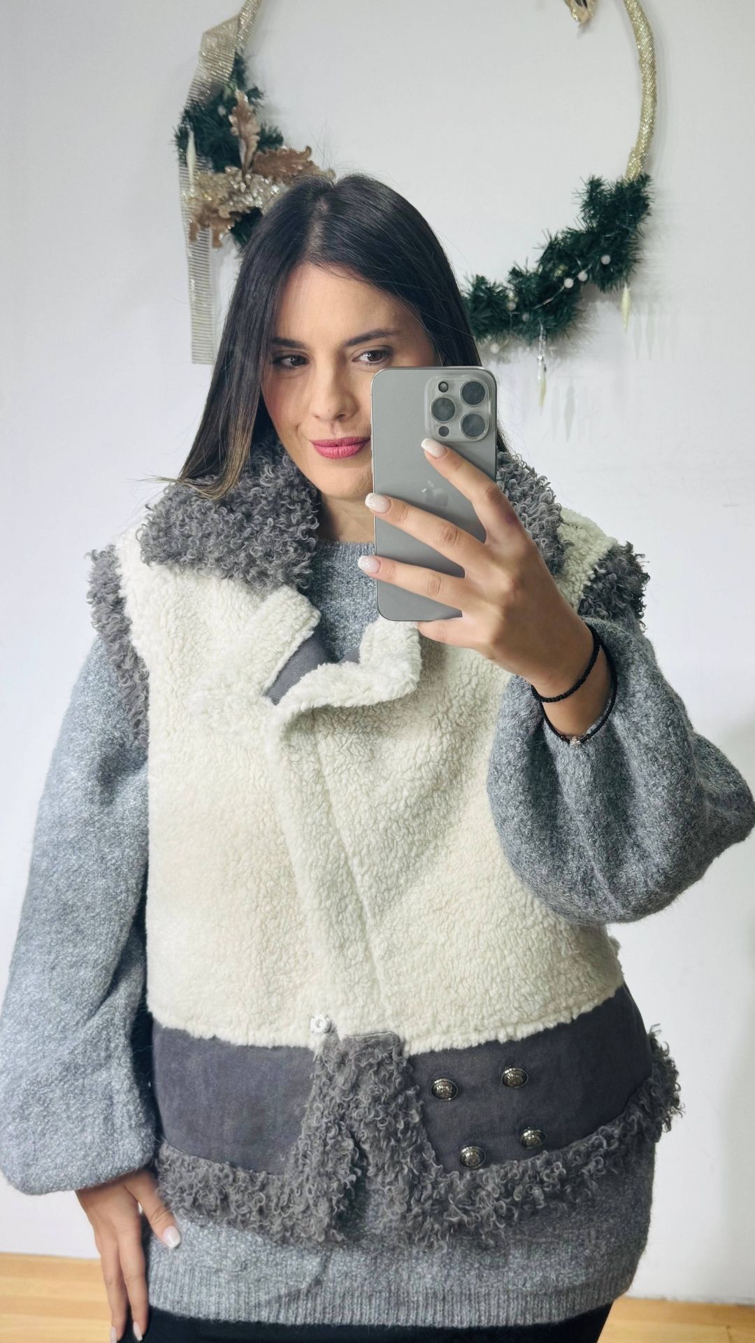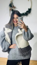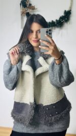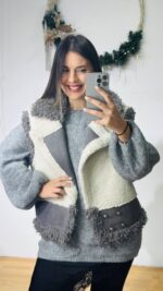 Teddy γούνινο μπουκλέ πανωφόρι -με σουεντ λεπτομέρειες και μεταλλικά κουμπιά.