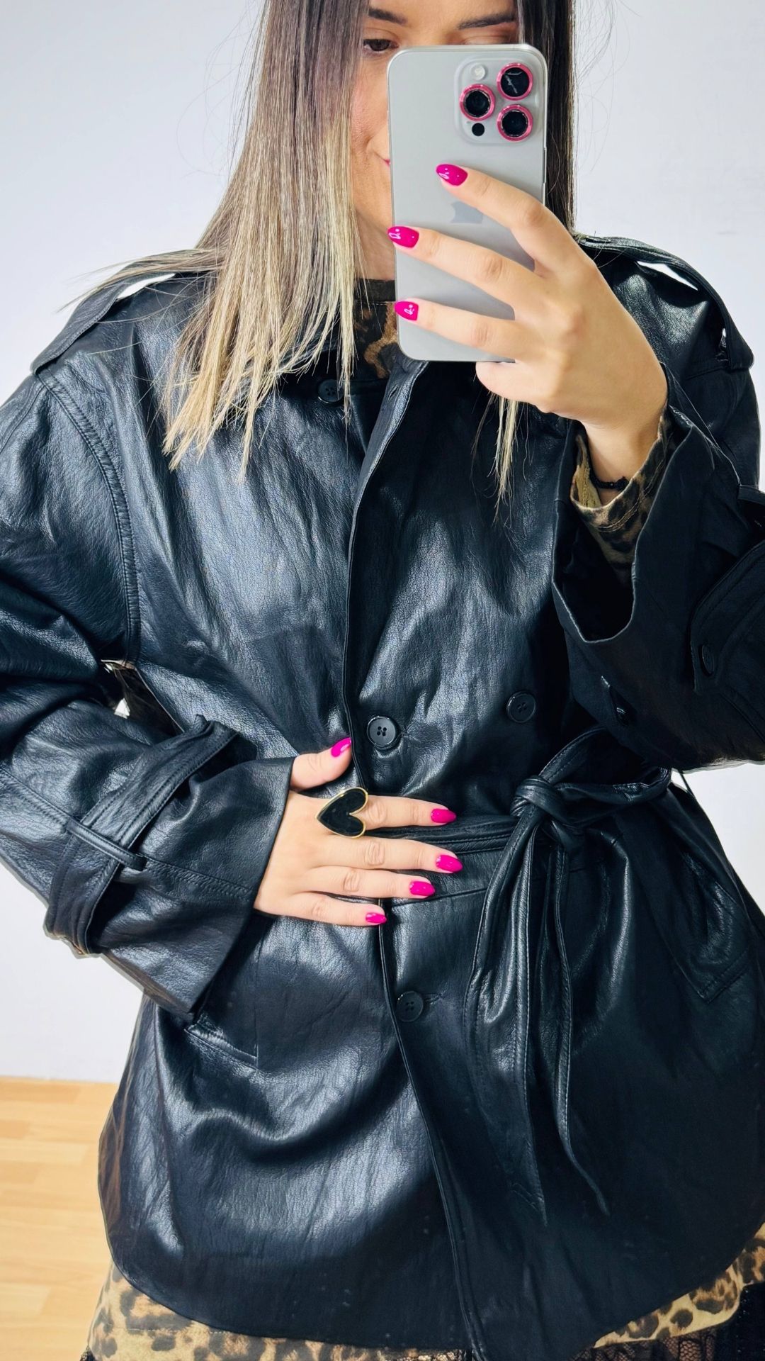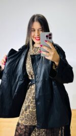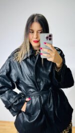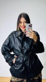 Δερμάτινο πανωφόρι -ημίπλατο σε στυλ καπαρτινάκι. Σταυροκούμπωτο, σχηματίζει ορθό λαιμό, επωμίδες στις μανσέτες και στους ώμους.