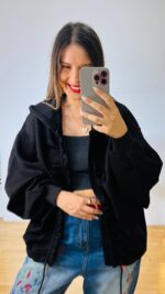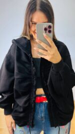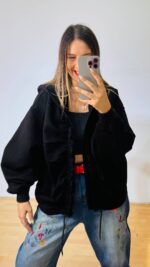 Ζακέτα τύπου bomber 100% φουτερ βαμβακερό, φούσκα μανίκι. Ενσωματωμένη κουκούλα πλαινές τσέπες. Κλείνει με φερμουάρ.