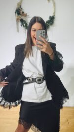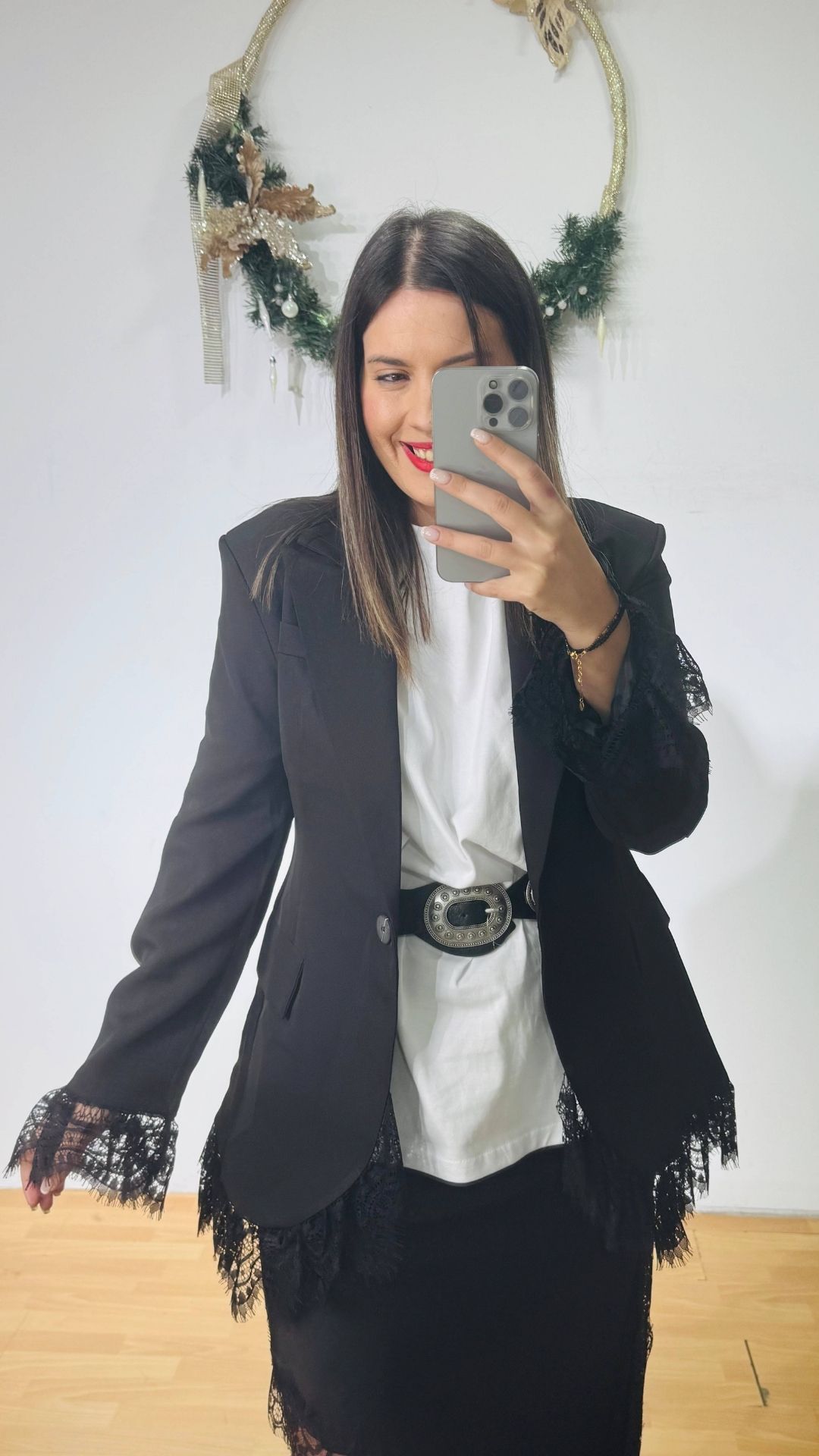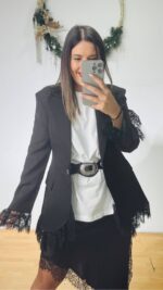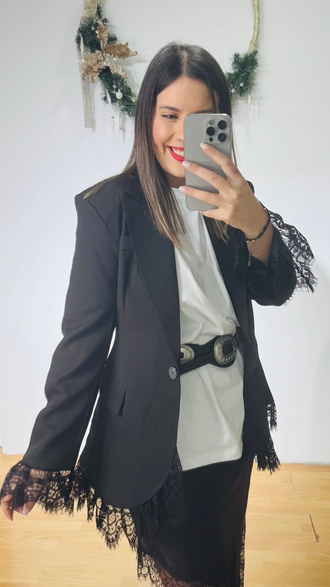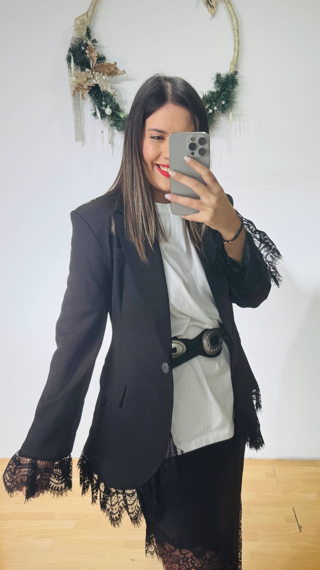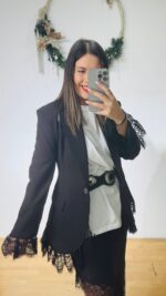 Blazer μεσάτο μονόκουμπο με διακοσμητική δαντέλα στα τελειώματα. Διαθέτει βάτες, εξωτερικές τσέπες