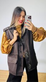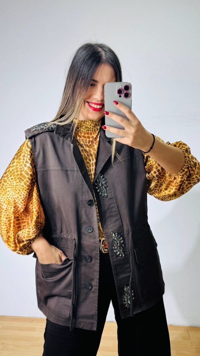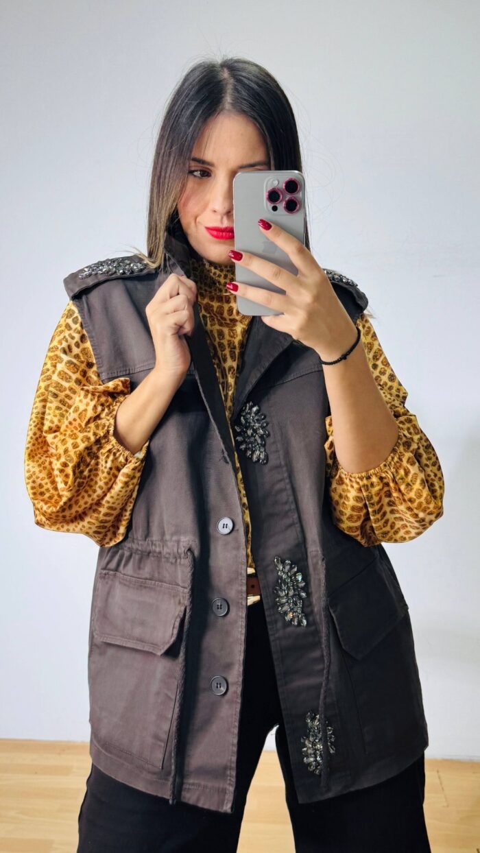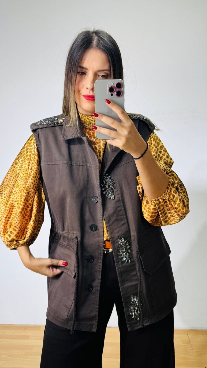 Bαμβακερό Jacket αμάνικο με κρυστάλλινα στοιχεία στου ώμους και στο μπροστινό μέρος της πατιλέτας.