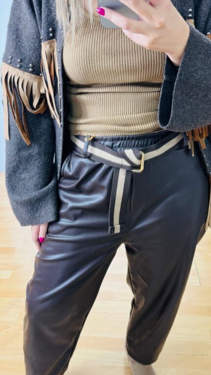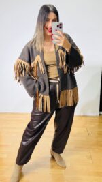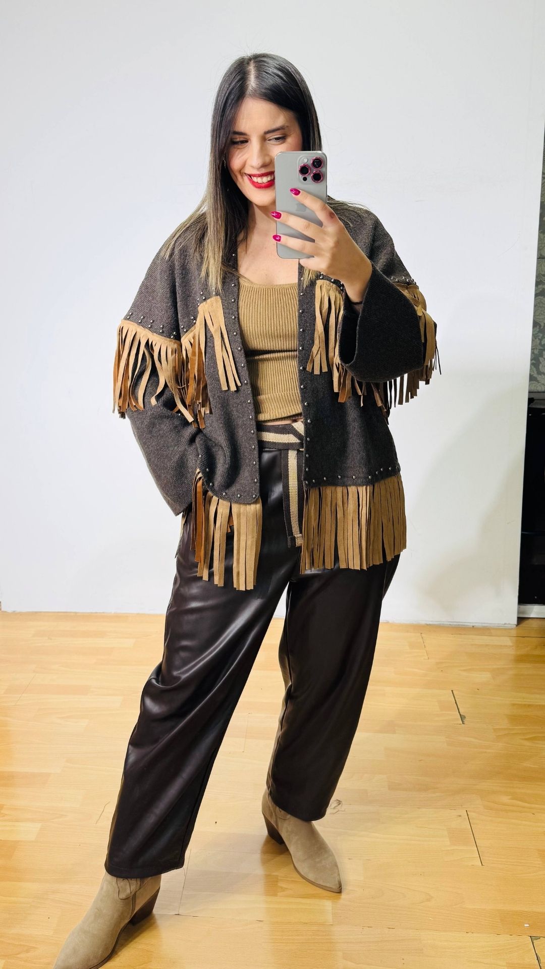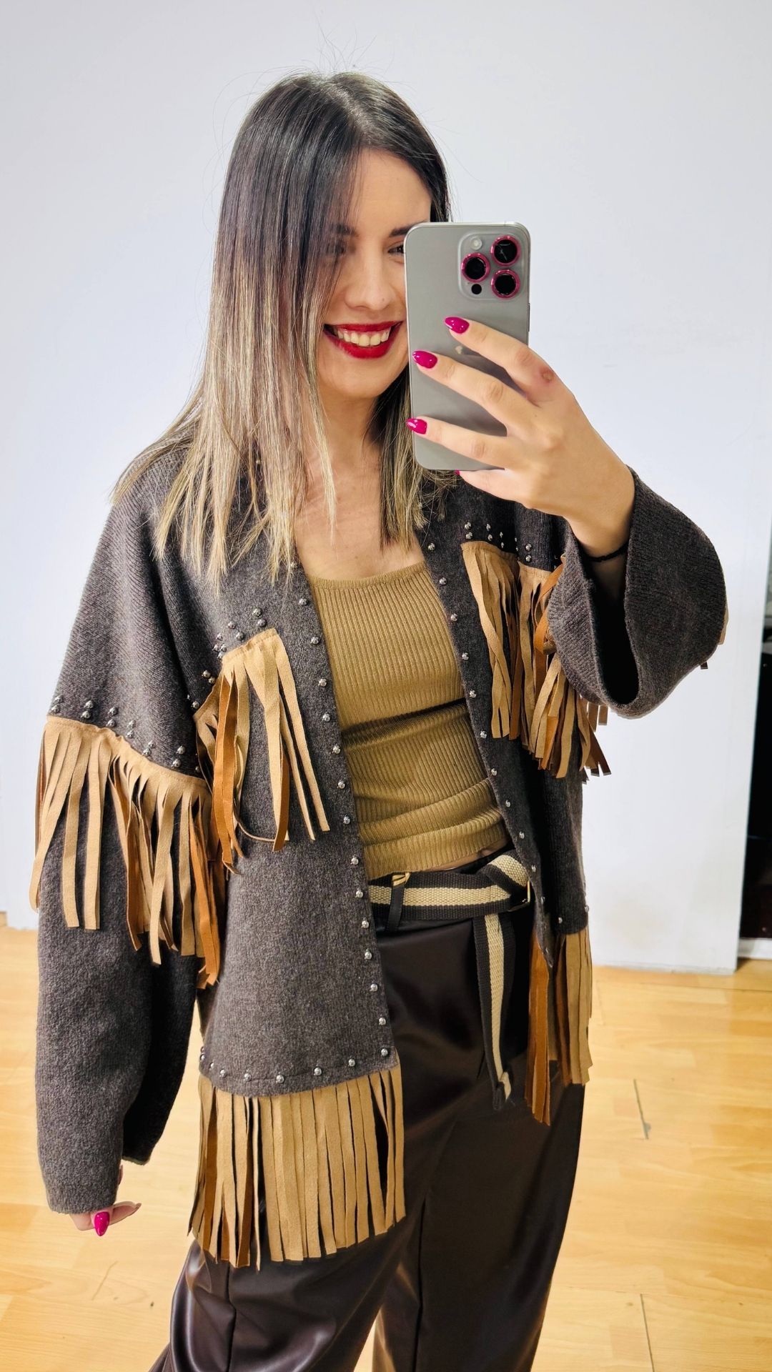 Πλεκτή Ζακέτα σε στυλ Κιμονό με διακοσμητικά suede κρόσια και μεταλλικά τρουκς. Διαθέτει μανίκι καμπάνα