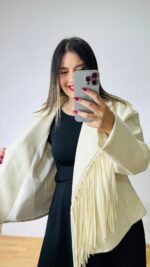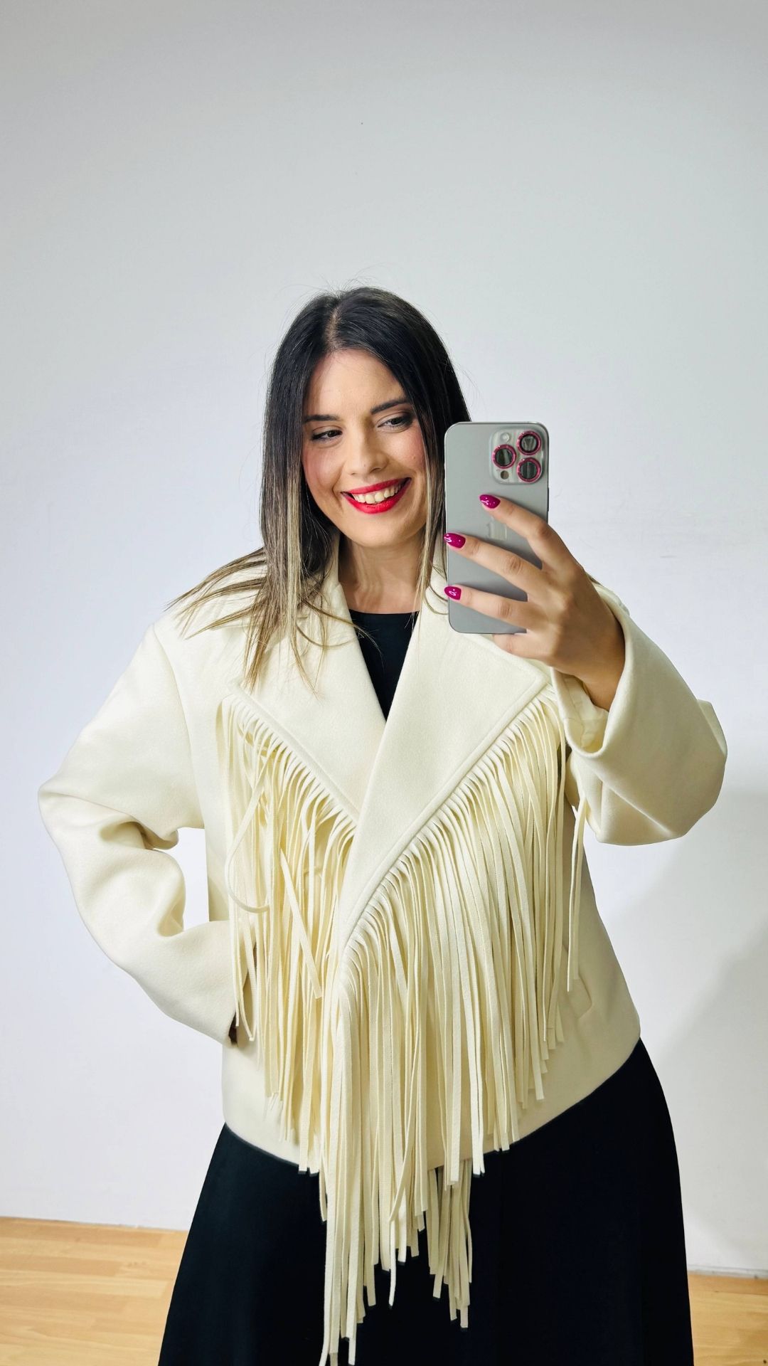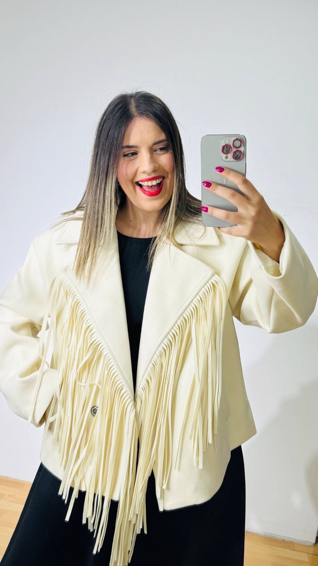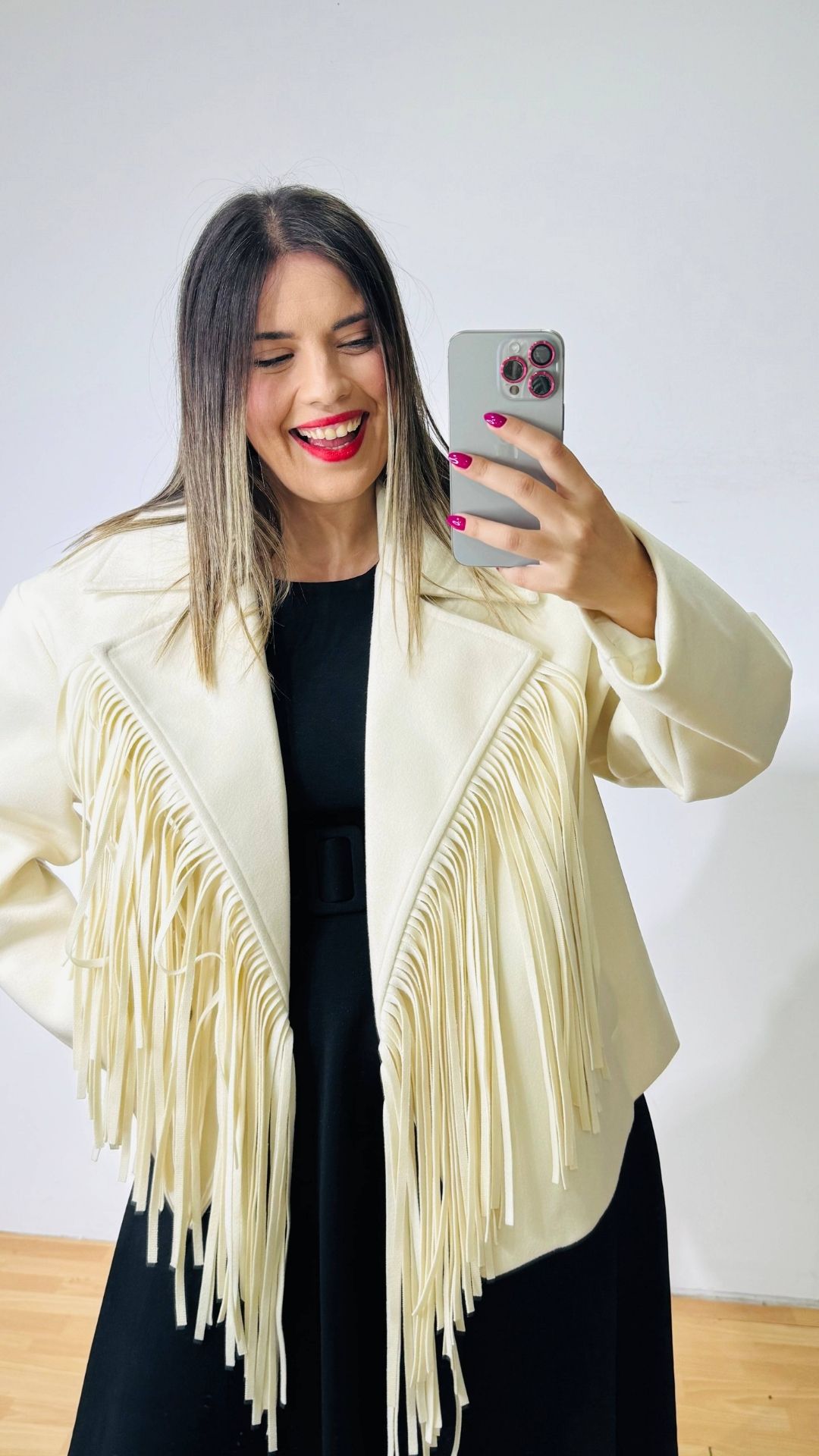 Παλτουδάκι σε αμπίρ γραμμή με γιακά και κρόσια στην μπροστινή όψη. Εσωτερικά φοδραρισμένο. Διαθέτει πλαινές τσέπες.