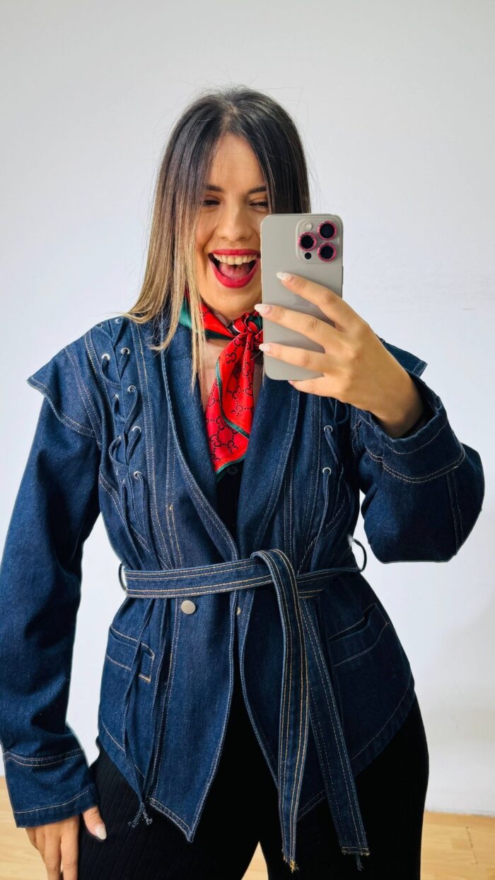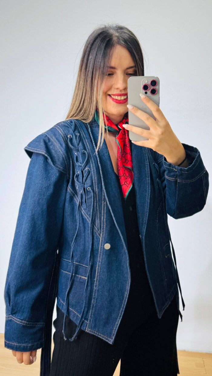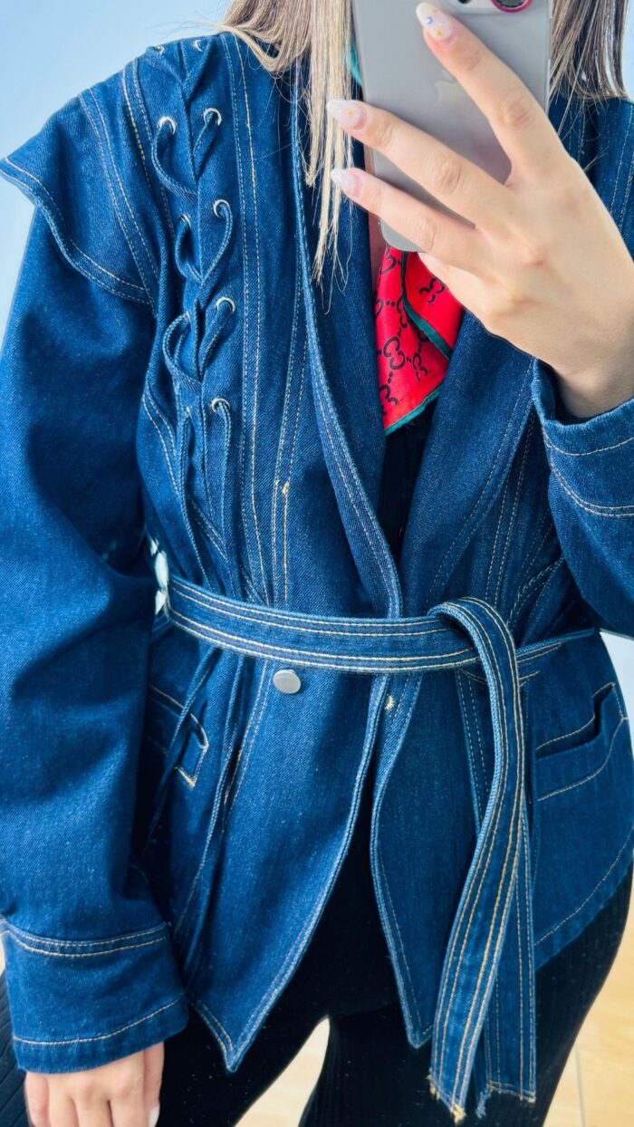 Denim Jacket μεσάτο με διακοσμητικά κορδονάκια στο μπροστινό μέρος, ασορτί αποσπώμενη ζώνη -Κλεινει με κουμπί