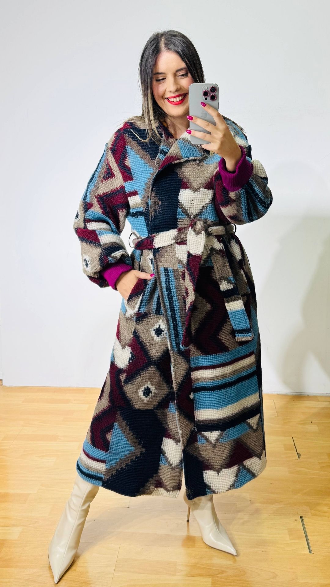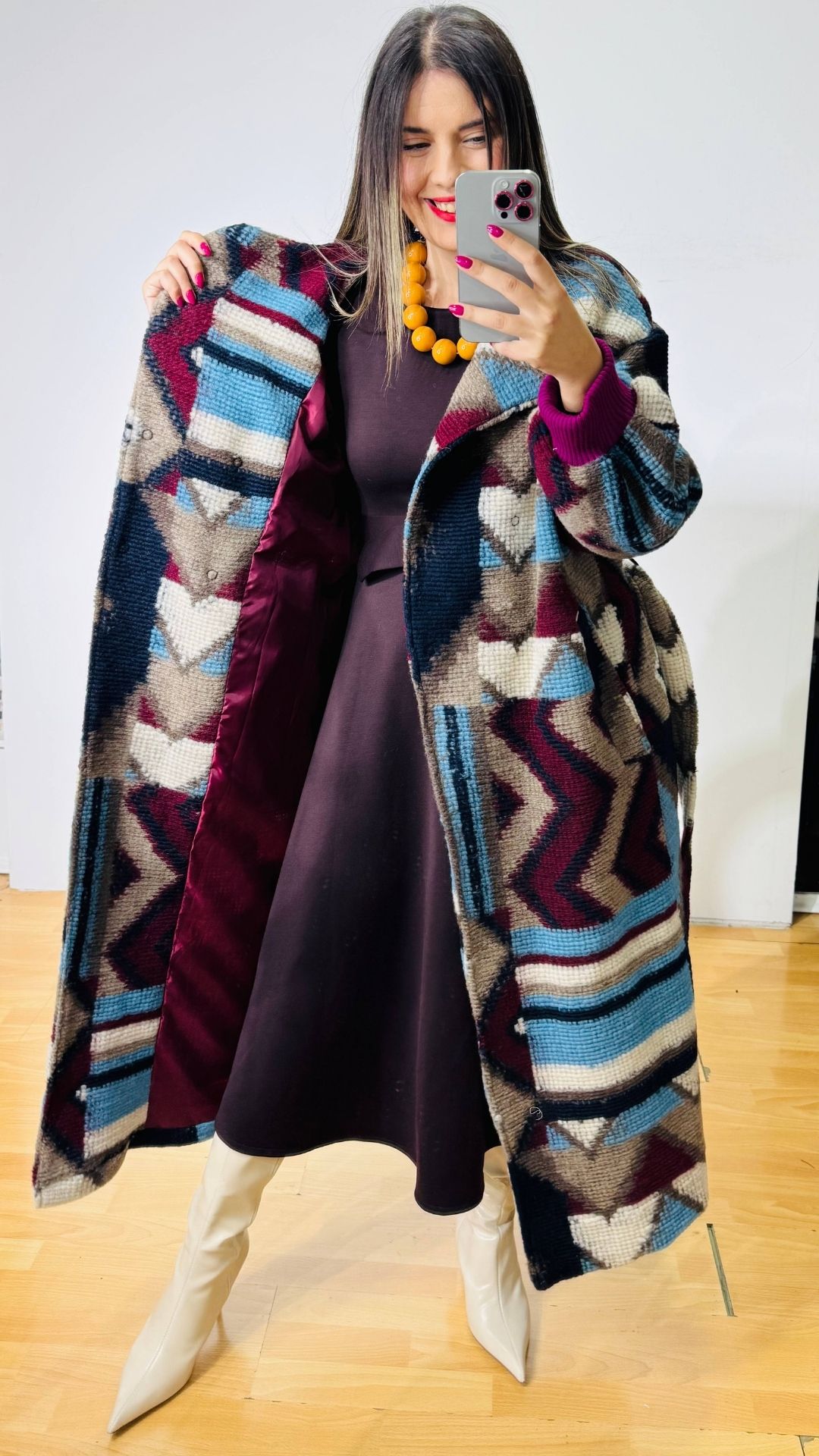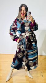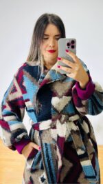 Μπουκλέ Παλτό με πολύχρωμα γεωμετρικά σχέδια. Εσωτερικά φοδραρισμένο. Κλείνει με μεταλλικά τρουκς σταυρωτά.