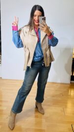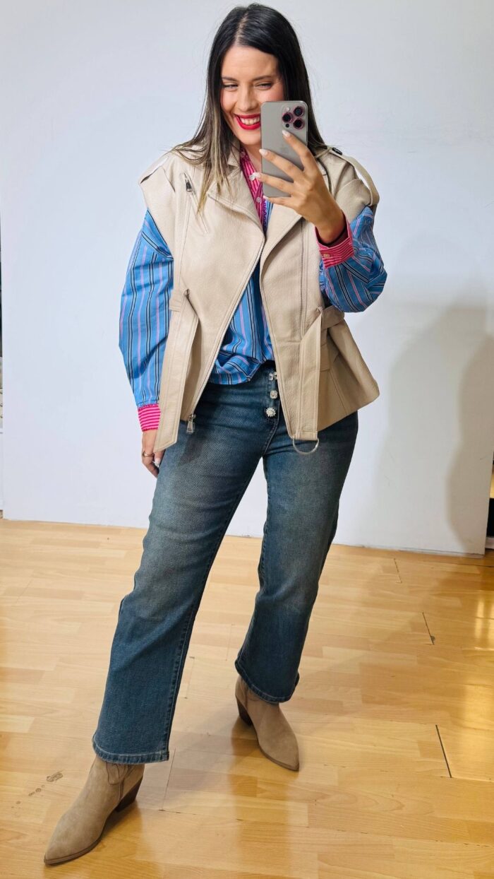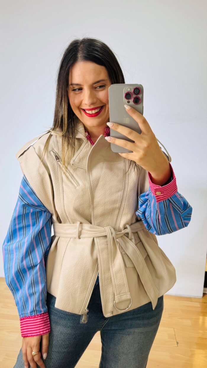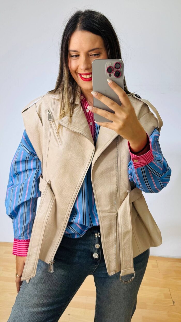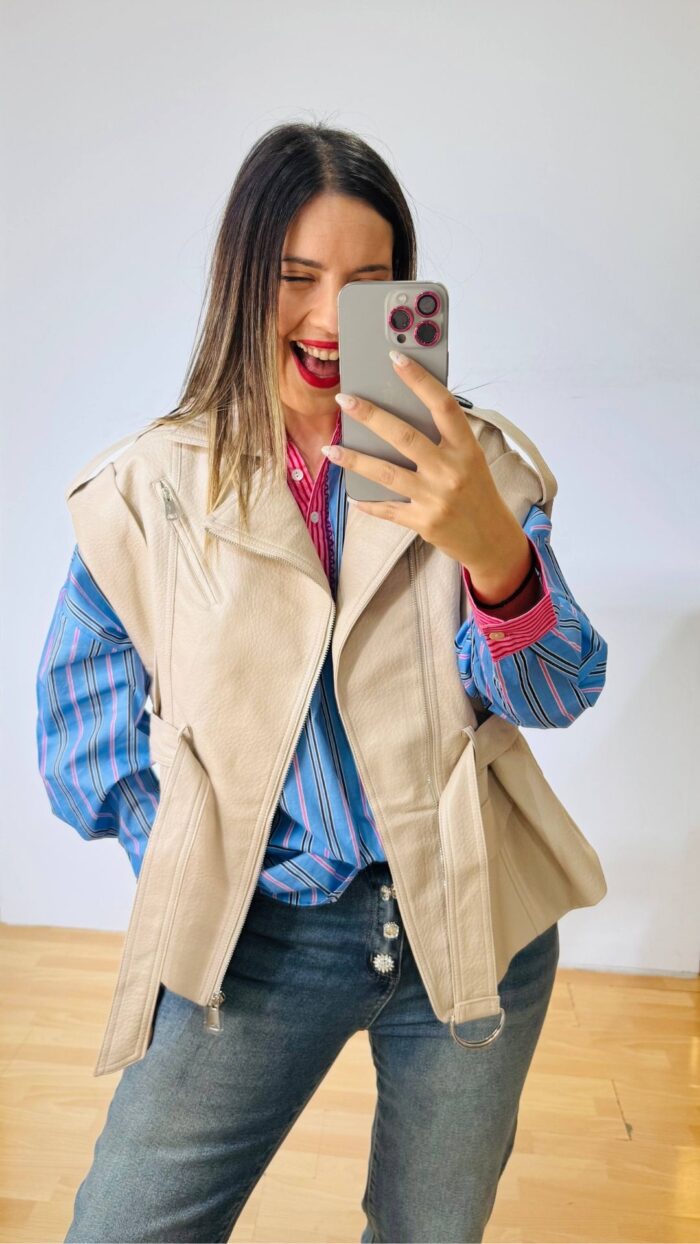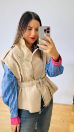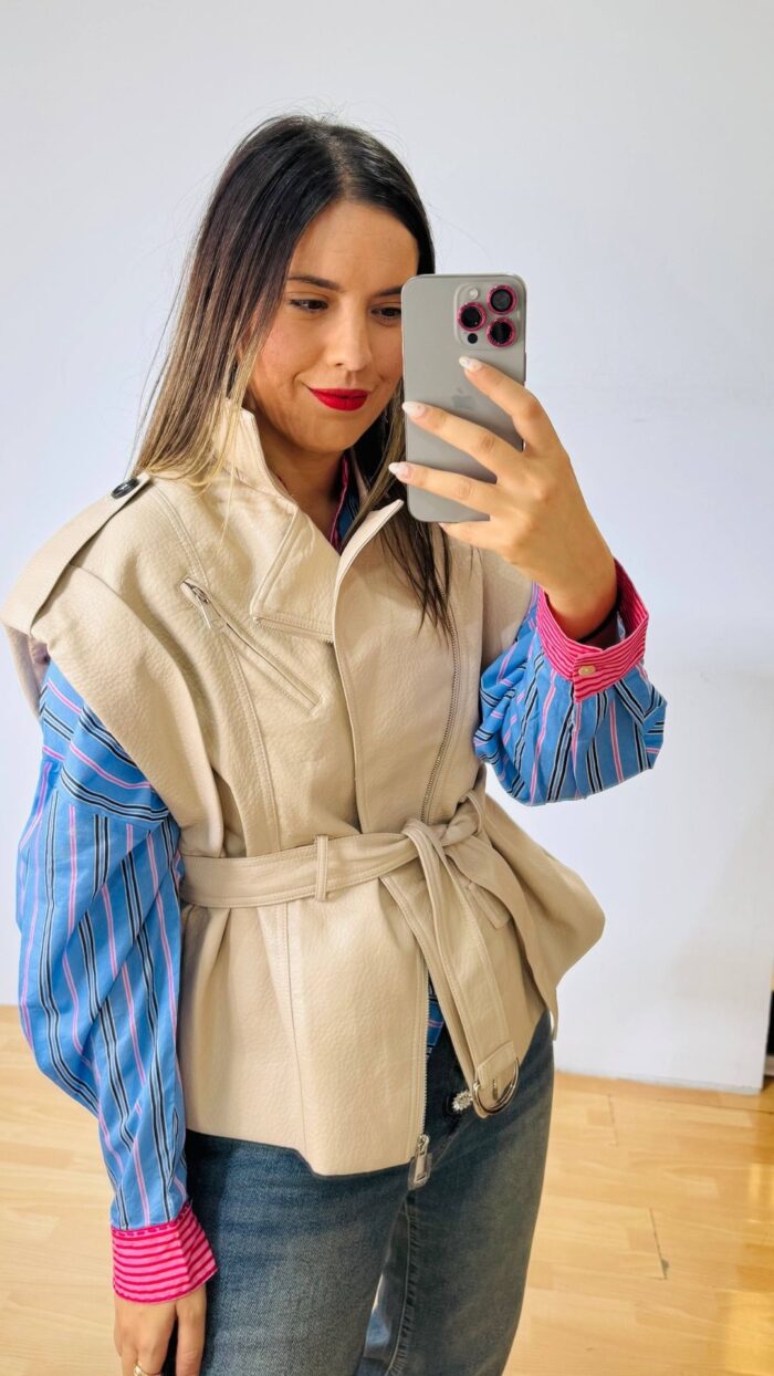 Γιλέκο-Jacket αμάνικο eco leather, εσωτερικά φοδραρισμένο, ρεβερ στους ώμους και επωμύδες /διακοσμητικές τσέπες και ασορτί αποσπώμενη ζώνη.
