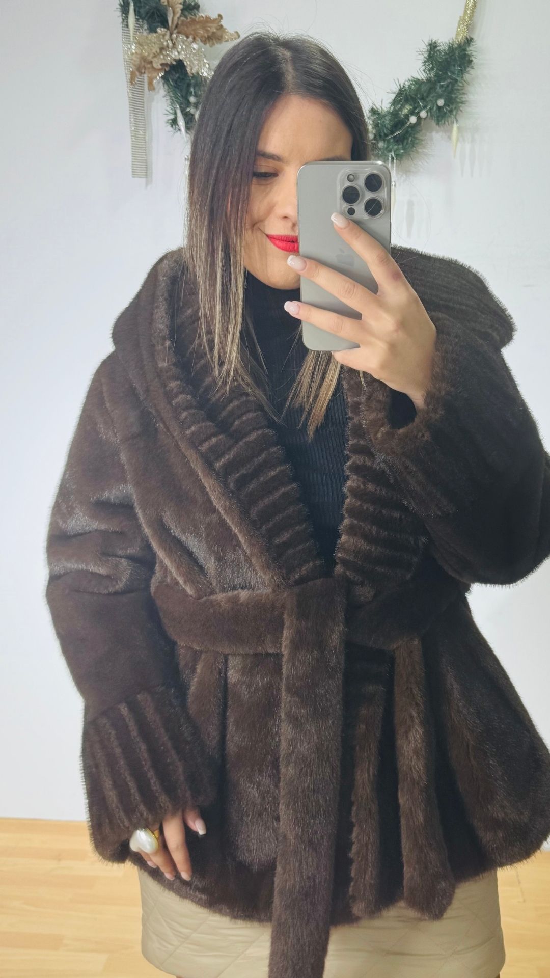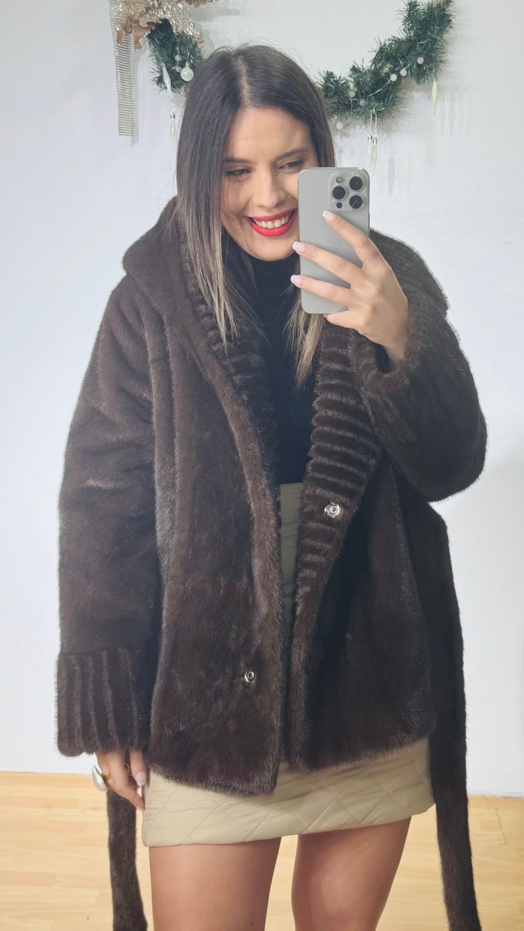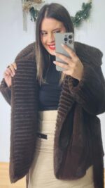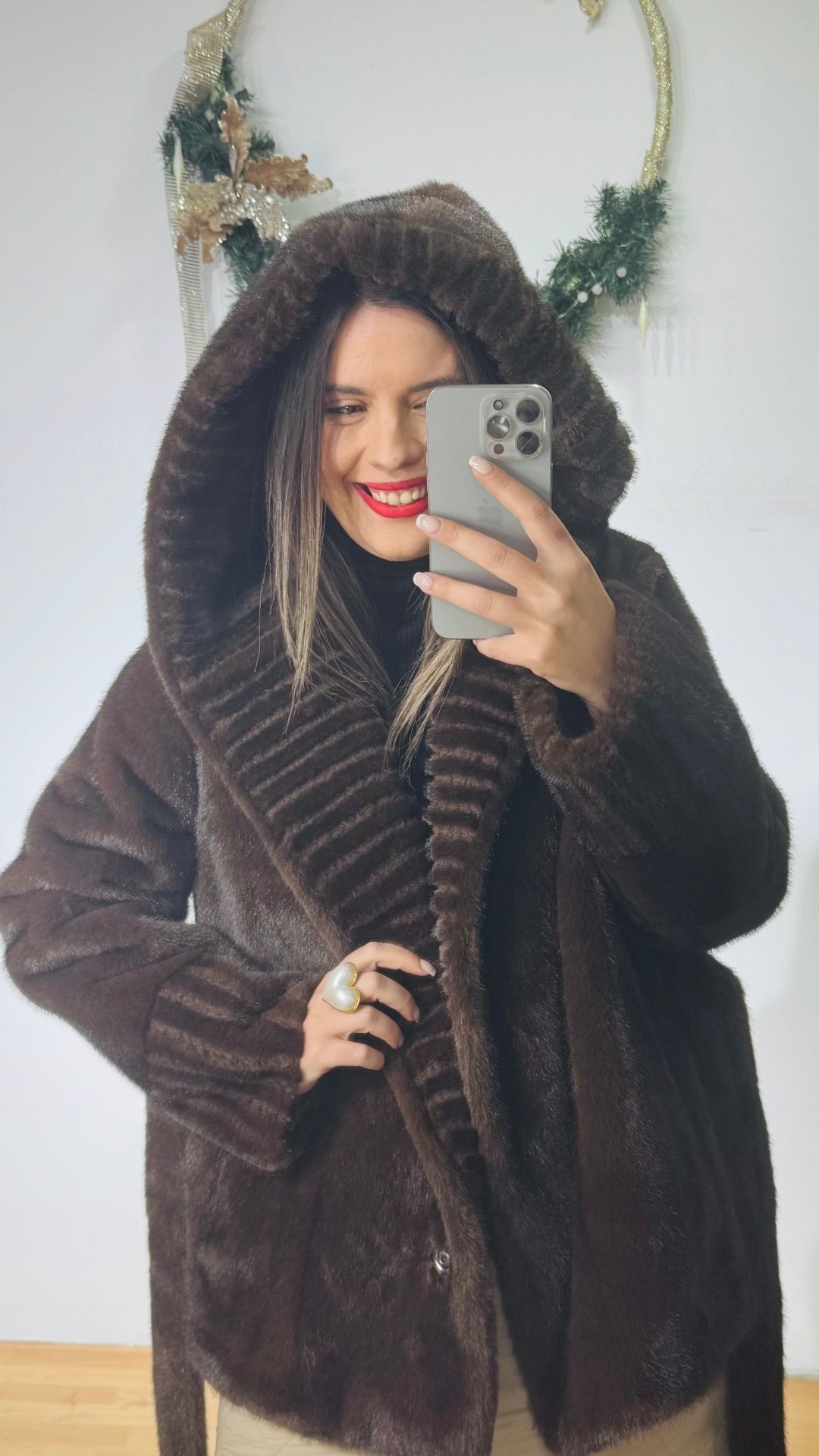Πανωφόρι Γούνα με ενσωματωμένη κουκούλα που σχηματίζει πλούσιο γιακά.
