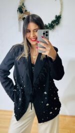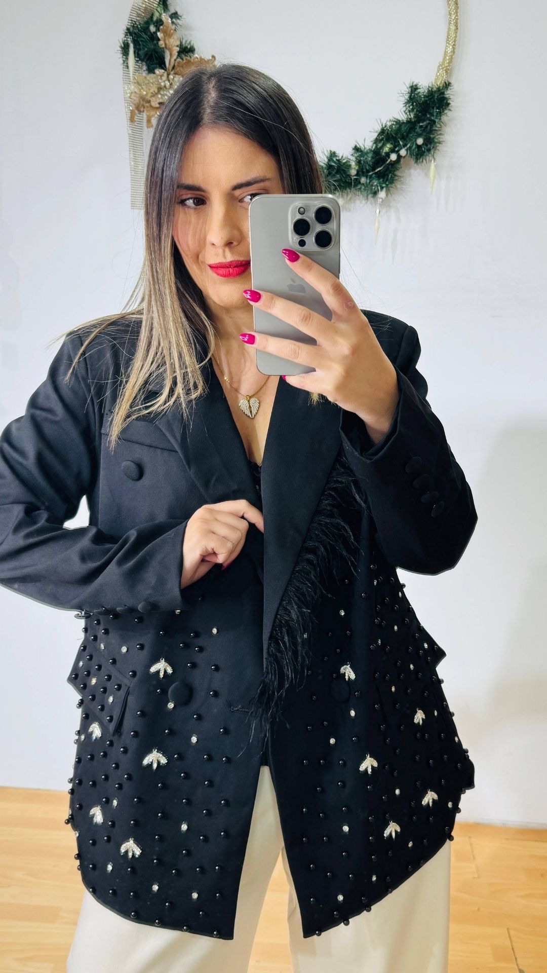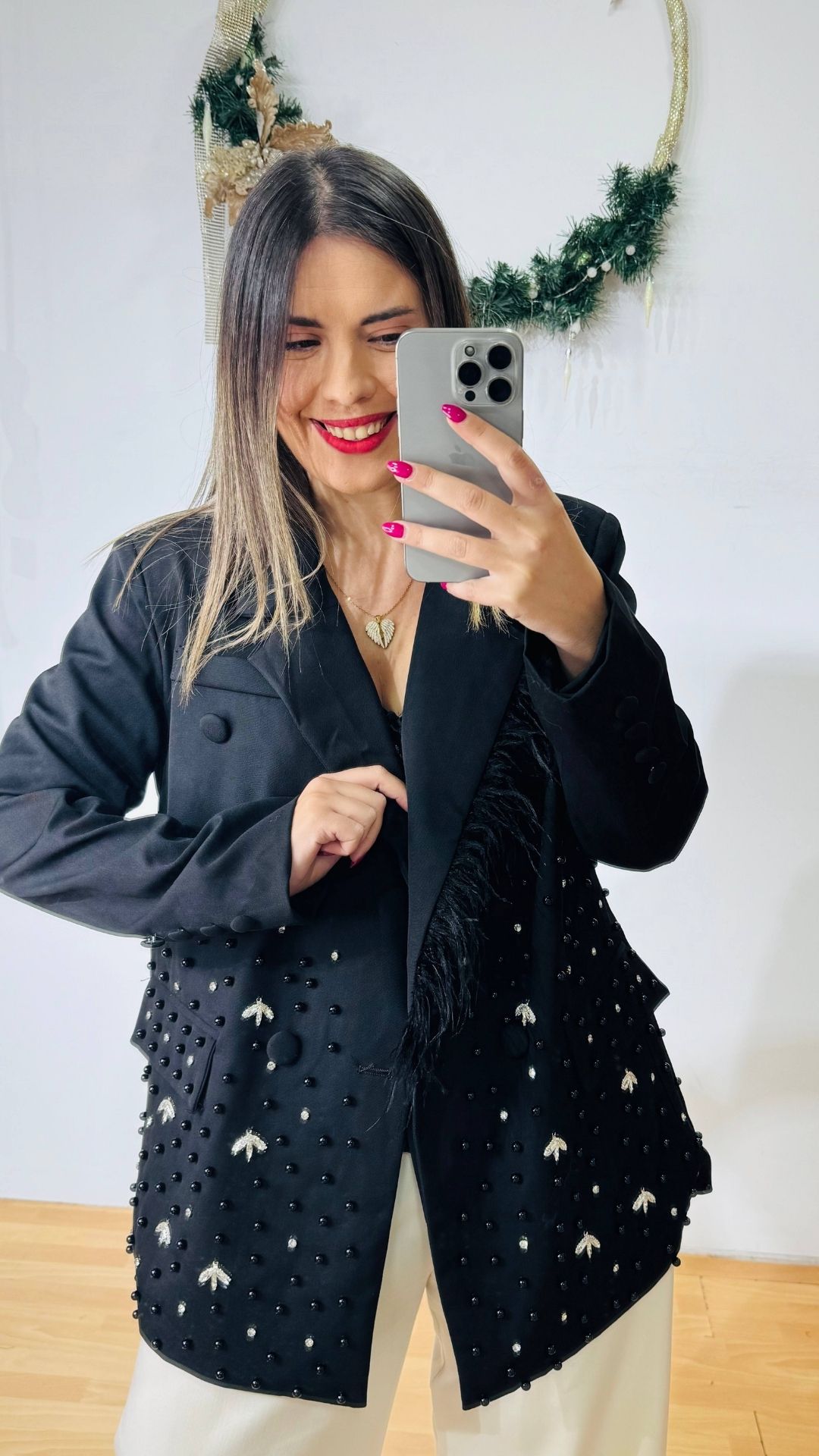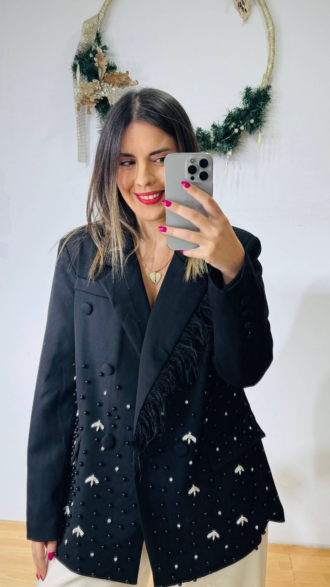 Σακάκι Blaze με διακοσμητικά στοιχεία από κρυστάλλινα στρας, πέρλες και πούπουλα μαραμπού. Διαθέτει εξωτερικές τσέπες και βάτες