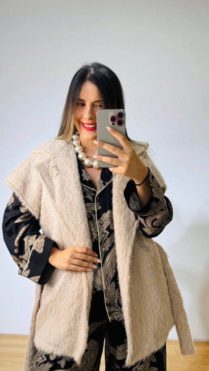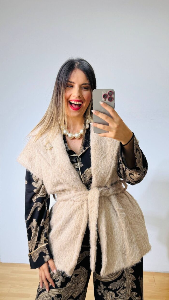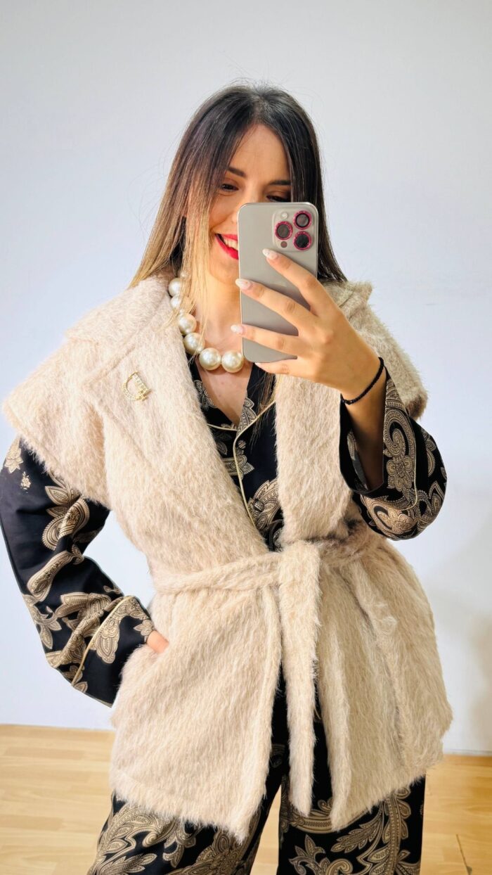 Αμάνικο Πανωφόρι από οικολογικό τρίχωμα. Με ασορτί αποσπώμενη ζώνη, διακοσμητική καρφίτσα στο πέτο. Διαθέτει πλαινές τσέπες.
