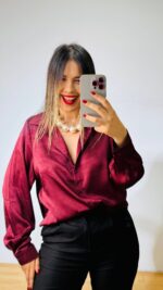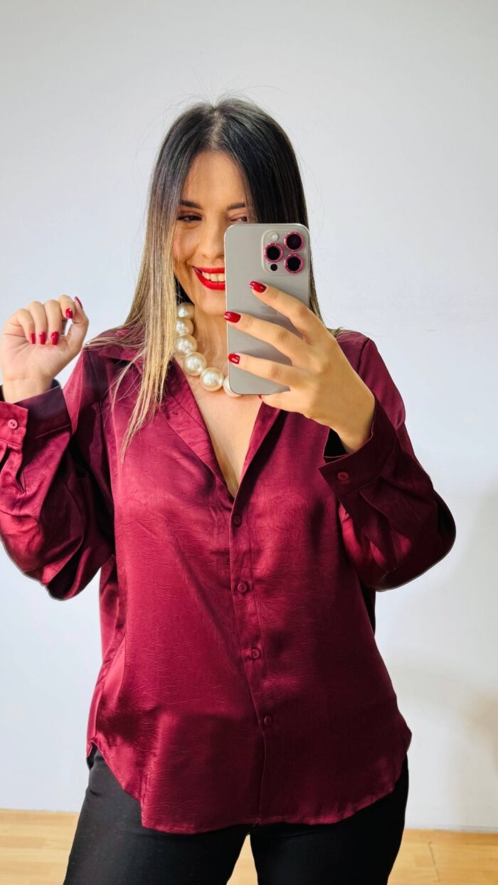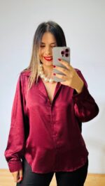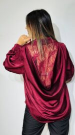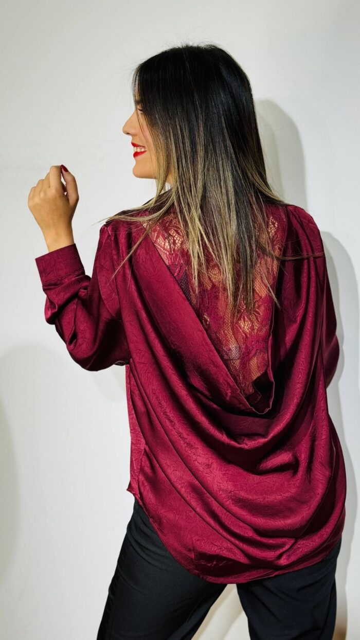 Πουκάμισο σατέν ματ με ιδιαίτερη πλάτη ντραπέ και δαντέλα. Κλείνει με κουπιά