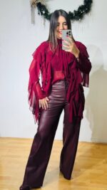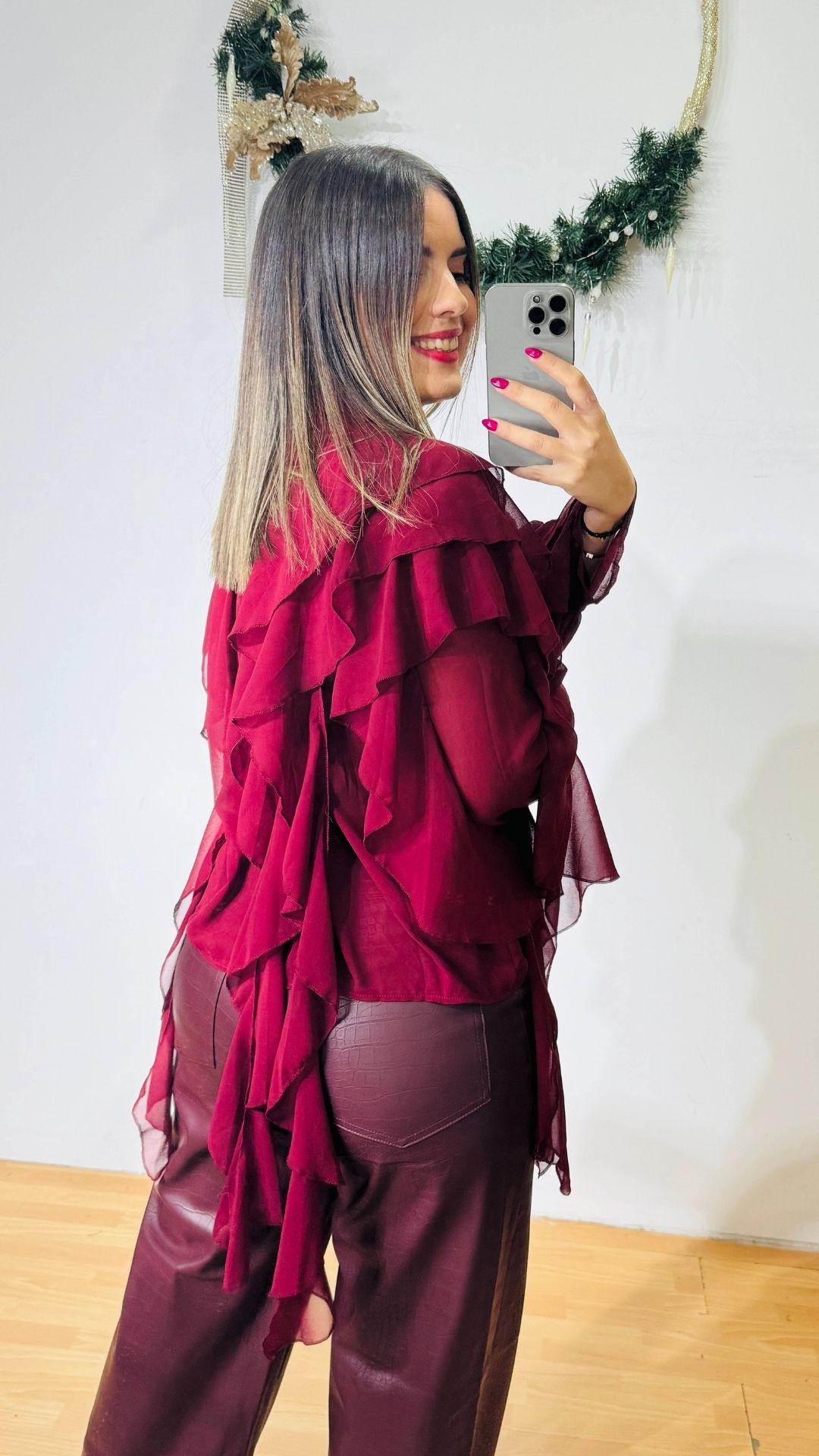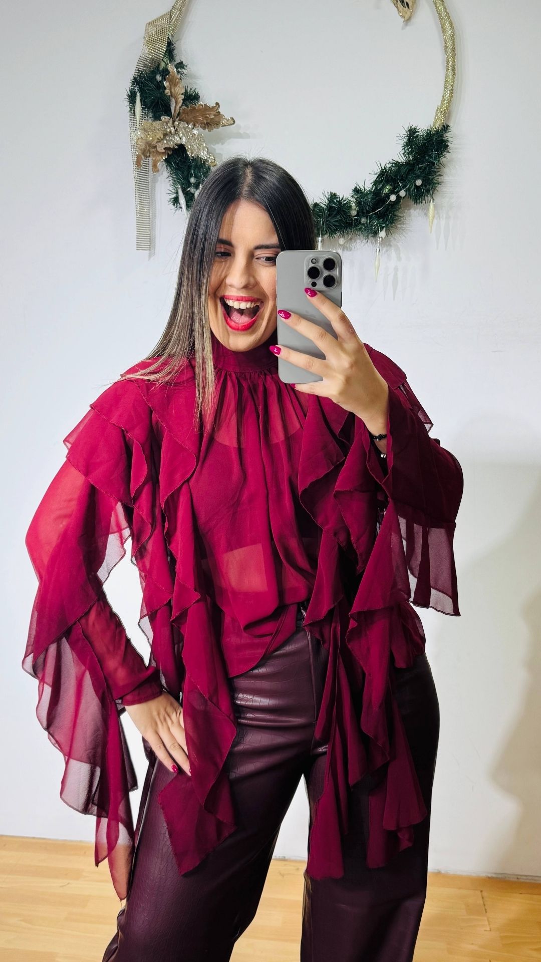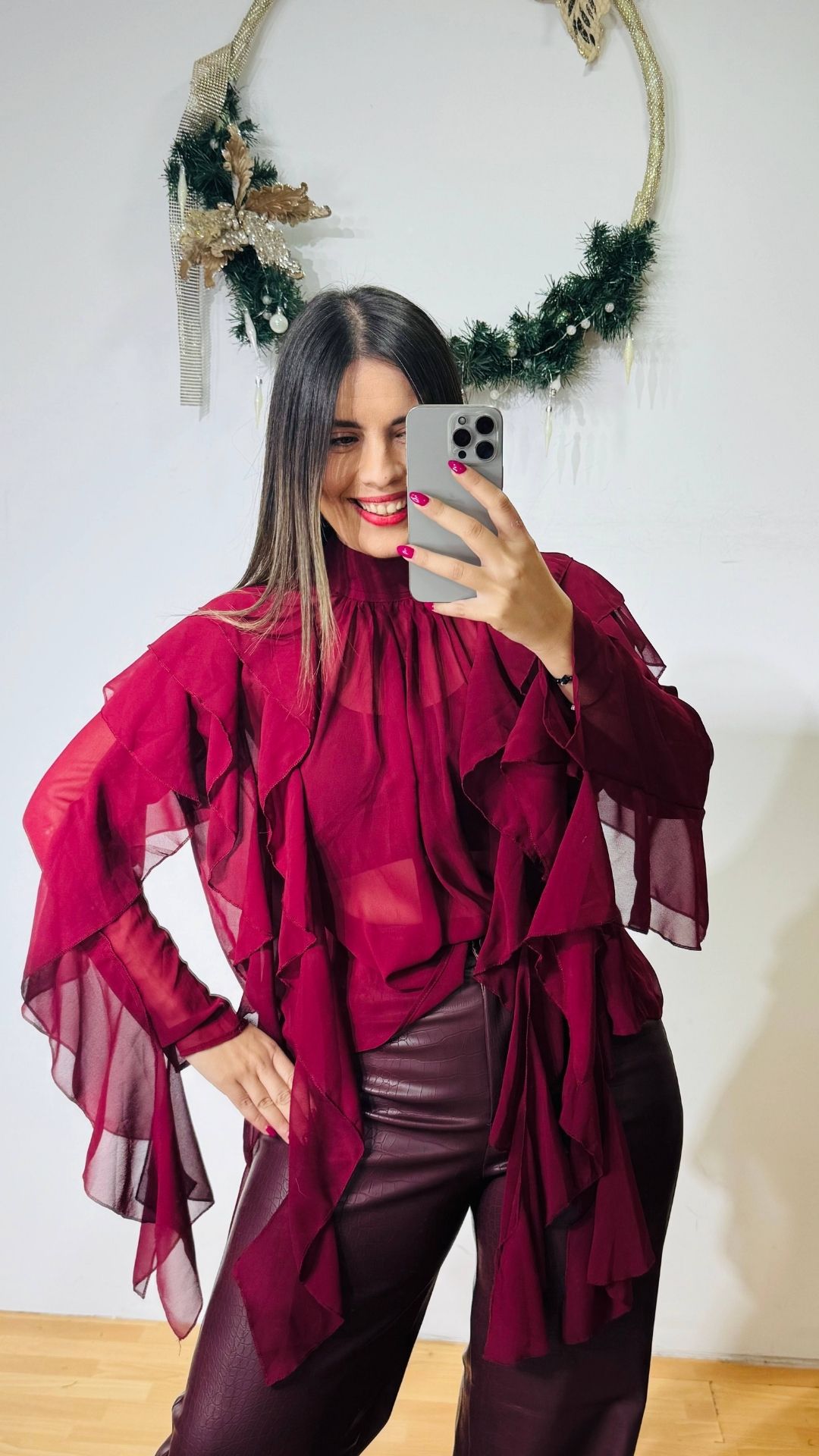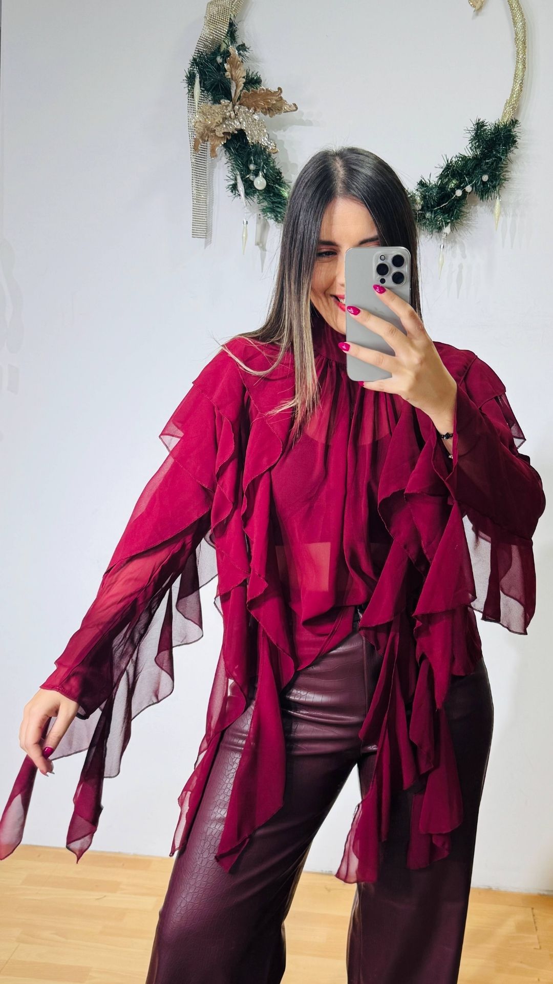 Πουκαμισο -Μπλούζα ημιδιάφανο από εργοστασιακή οργάντζα με ασυμμετρα βολάν. Ιδιαίτερα μανίκια, ορθό μάο λαιμό. Κλείνει με κουμπί στην πλάτη