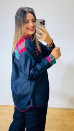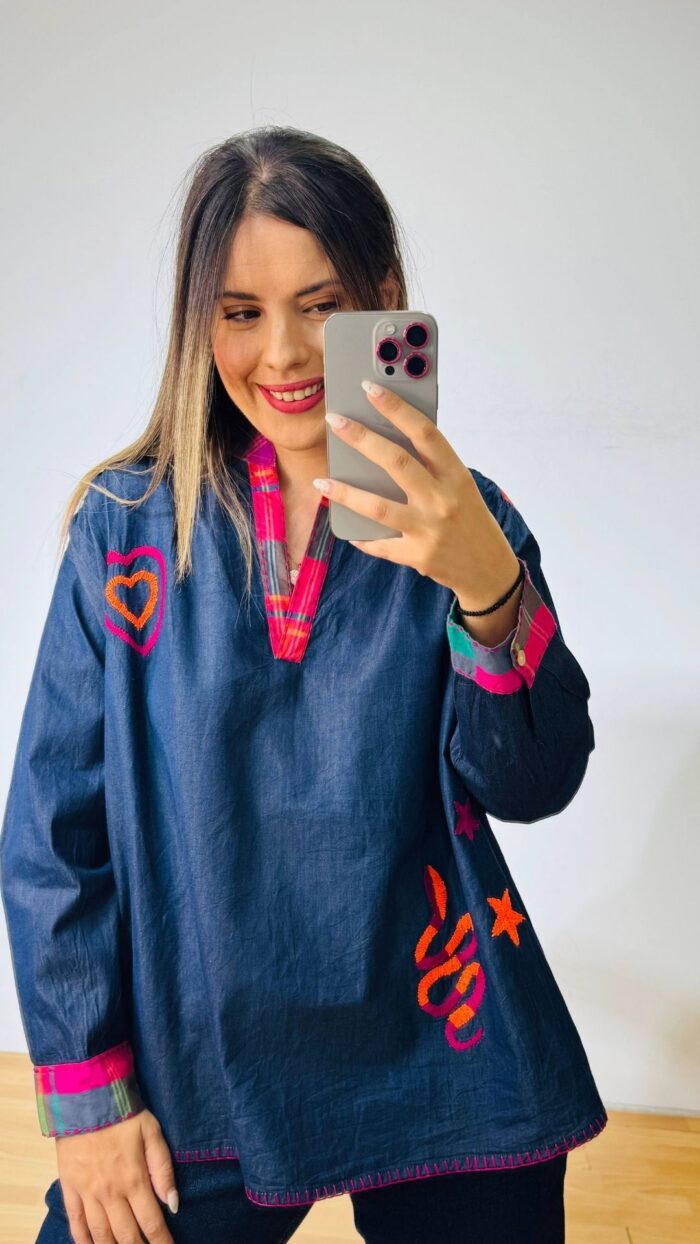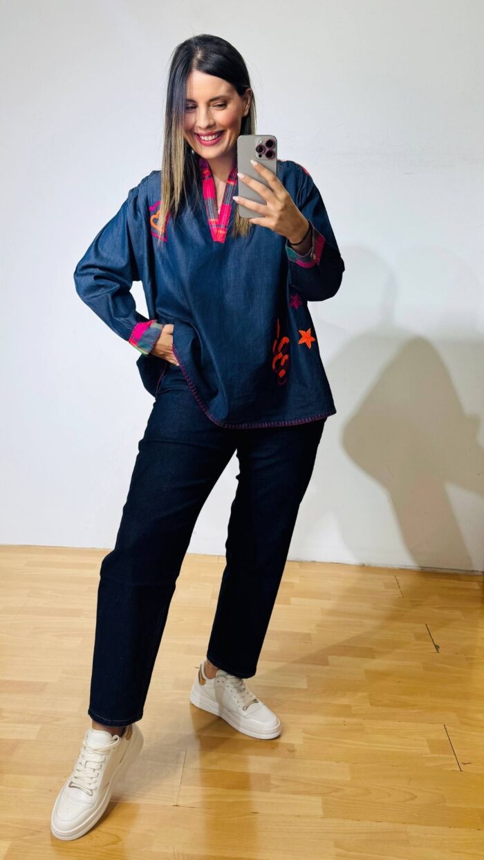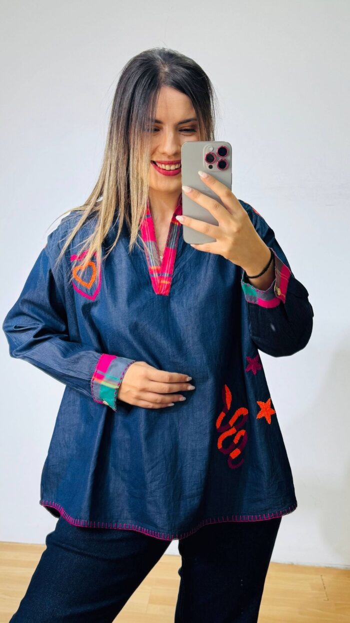 Πουκαμίσα Denim βαμβακερή, σε άνετη γραμμή με μαο γιακά και “v” πατιλέτα . Διαθέτει χειροποίητα κεντήματα
