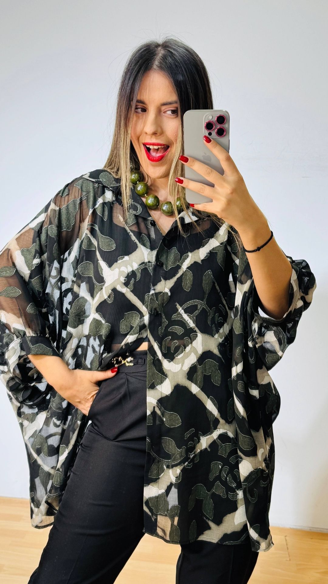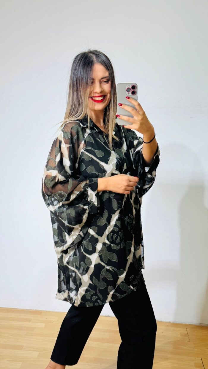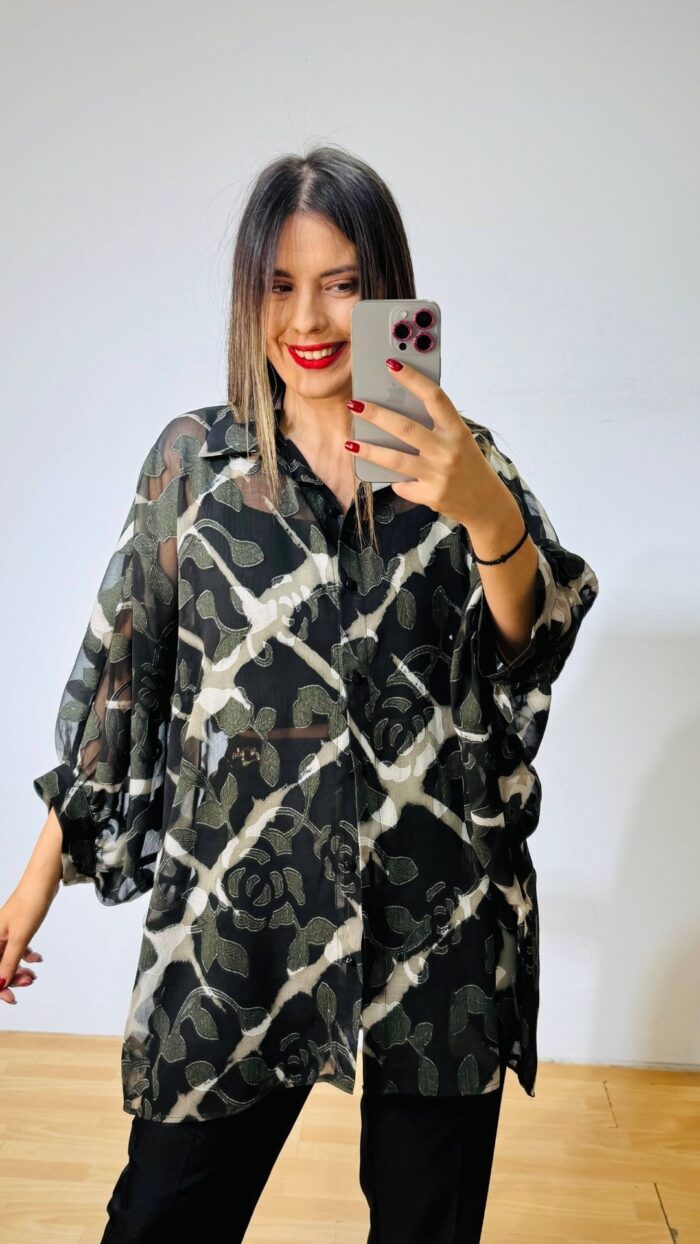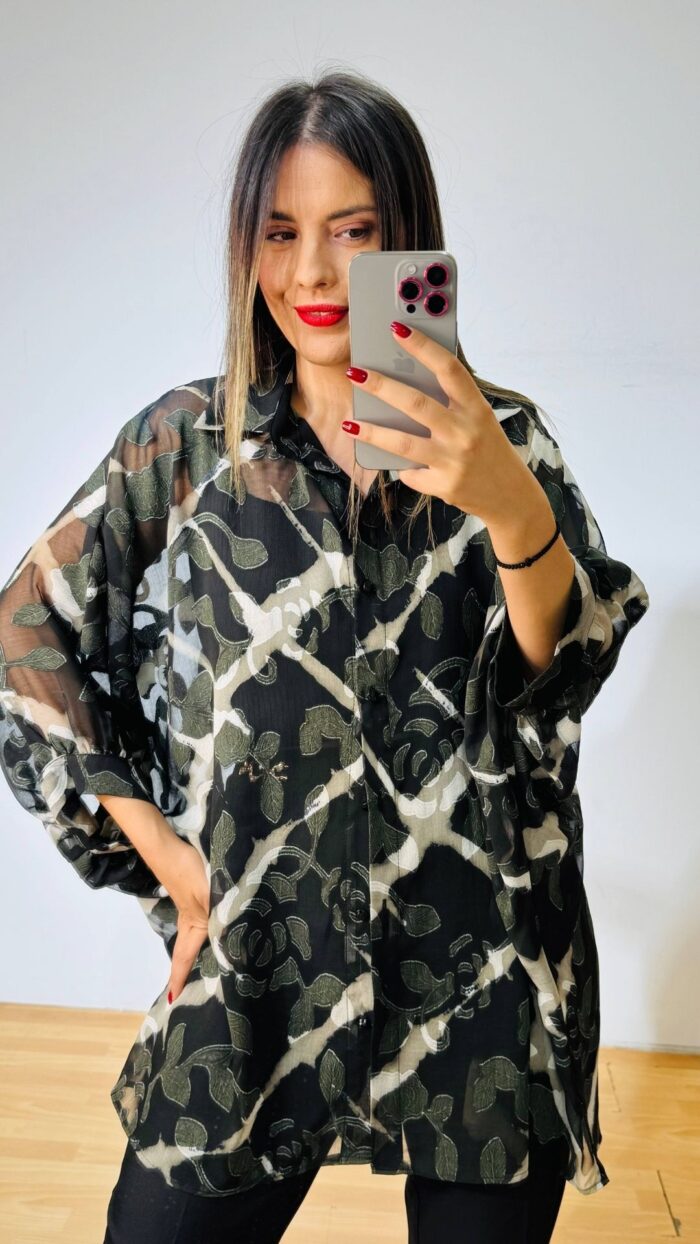 Πουκαμίσα από εργοστασιακό μετάξι σε χαλαρή γραμμή  με νυχτερίδα μανίκι . Κλείνει με κουμπιά.