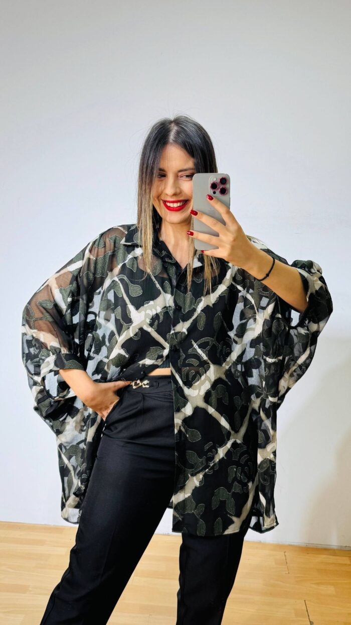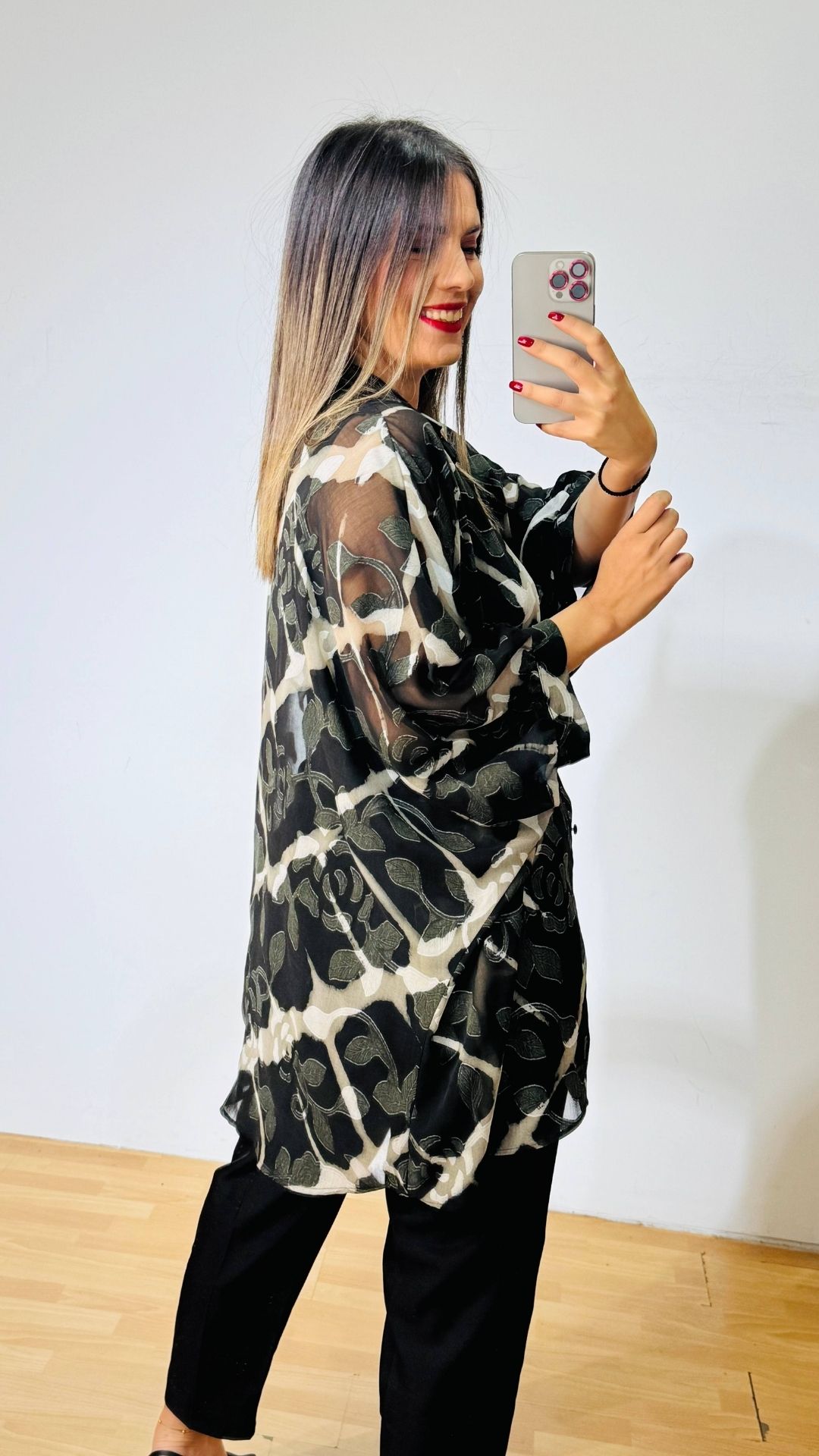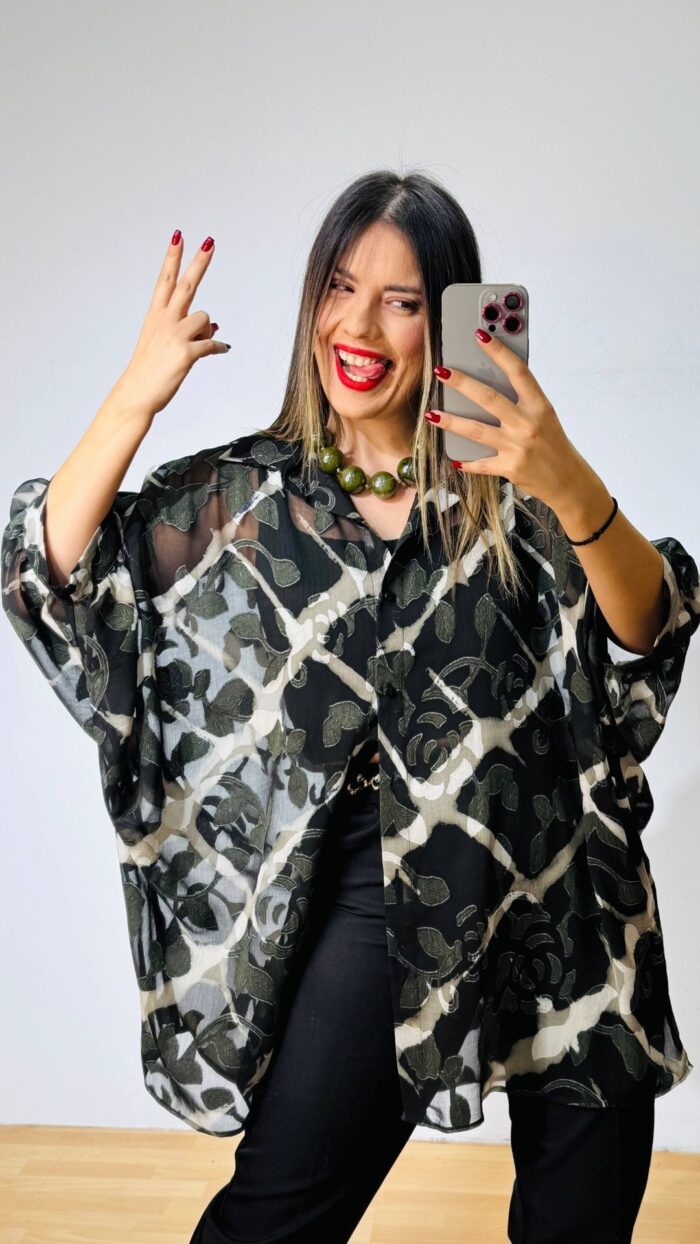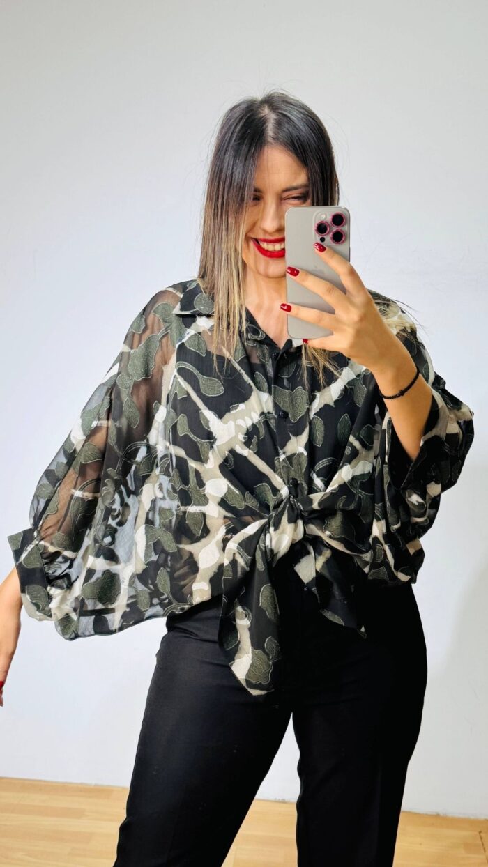 Πουκαμίσα από εργοστασιακό μετάξι σε χαλαρή γραμμή  με νυχτερίδα μανίκι . Κλείνει με κουμπιά.
