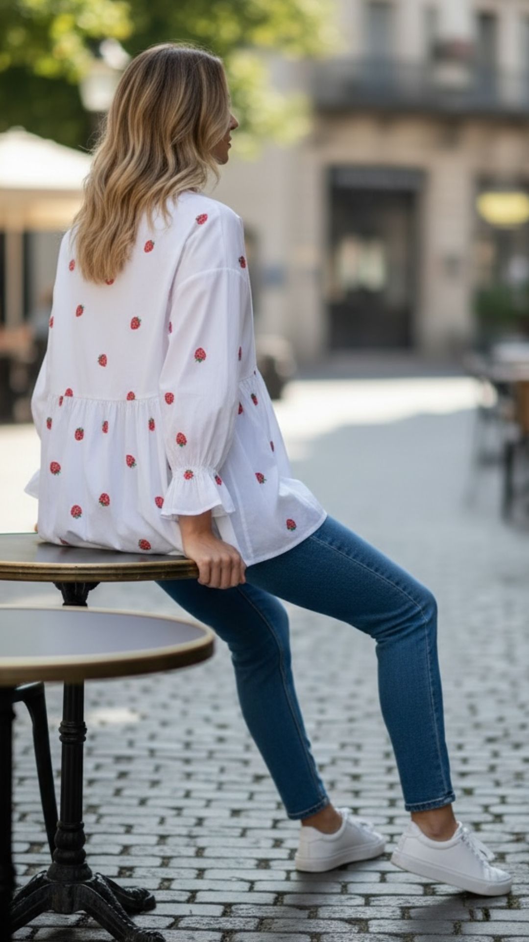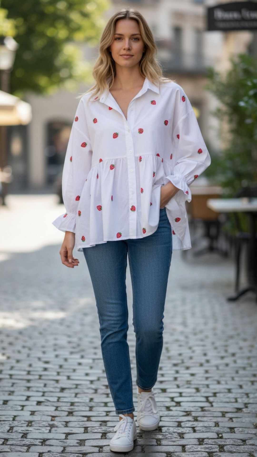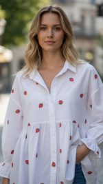 Πουκαμίσα βαμβακερή με χειροποίητες κεντημένες φράουλες, τρουακάρ μανίκι με βολάν