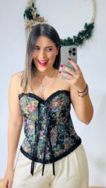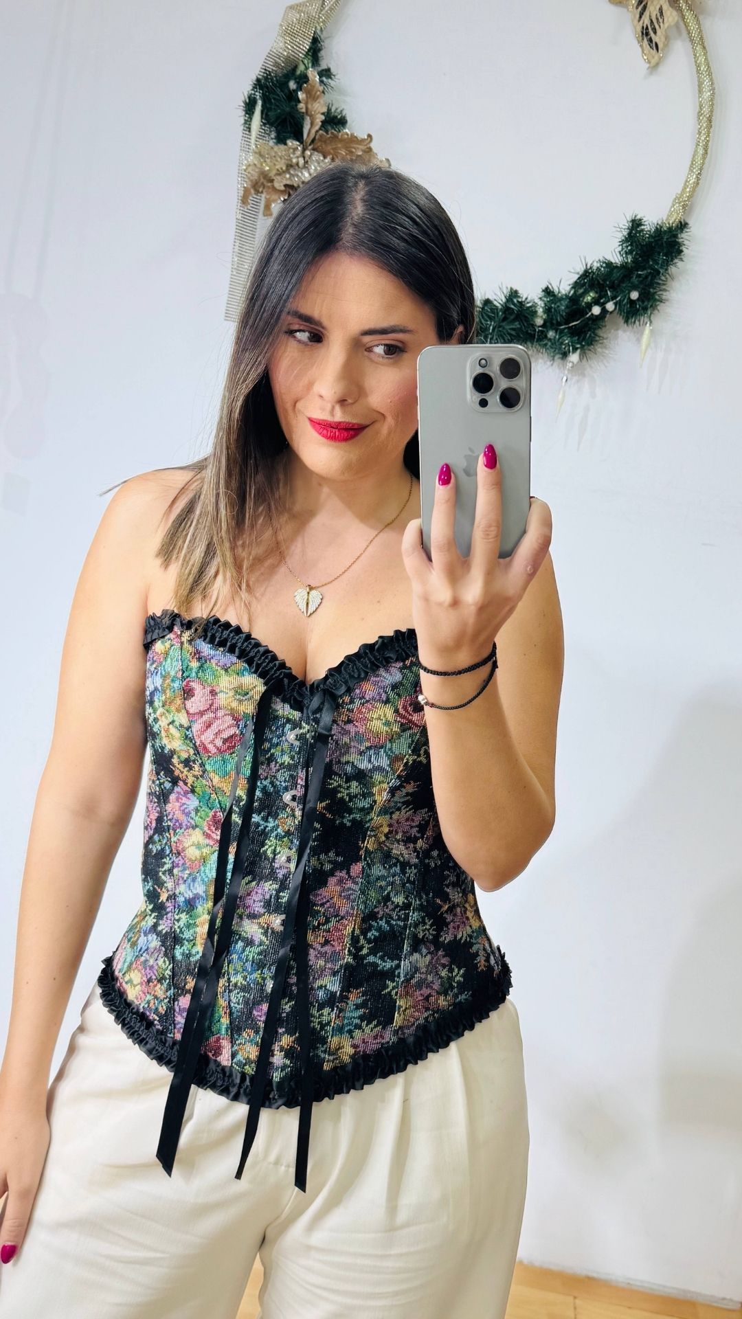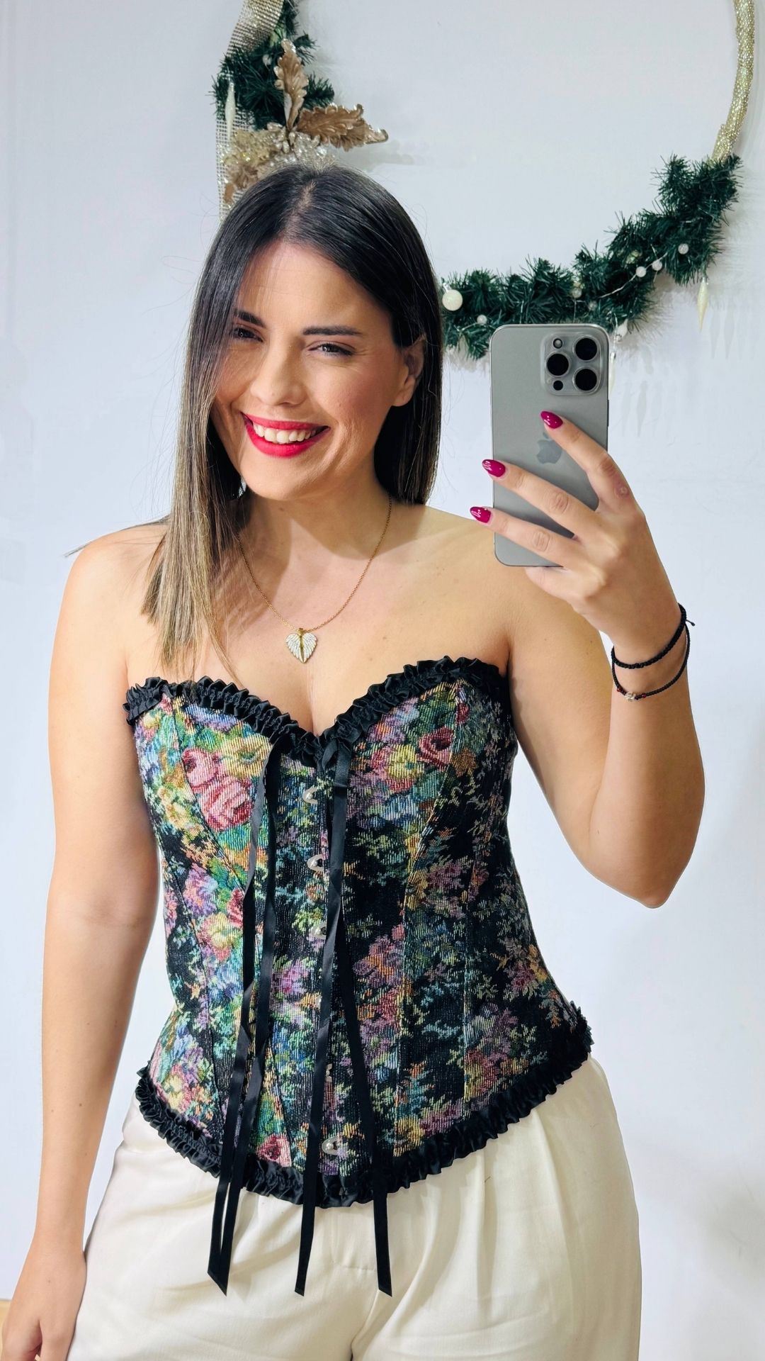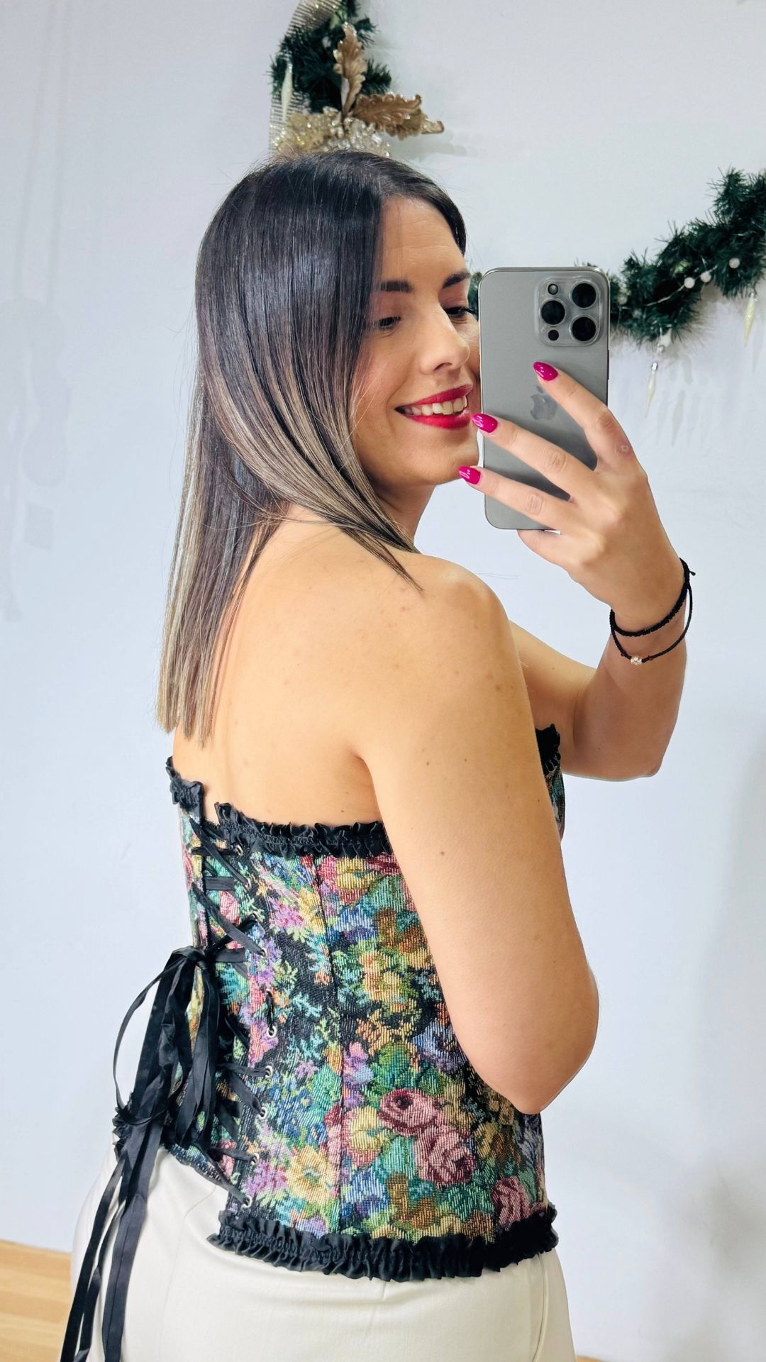Mπούστο μπροκάρ με ρυθμιζόμενες σατέν κορδέλες.