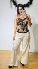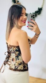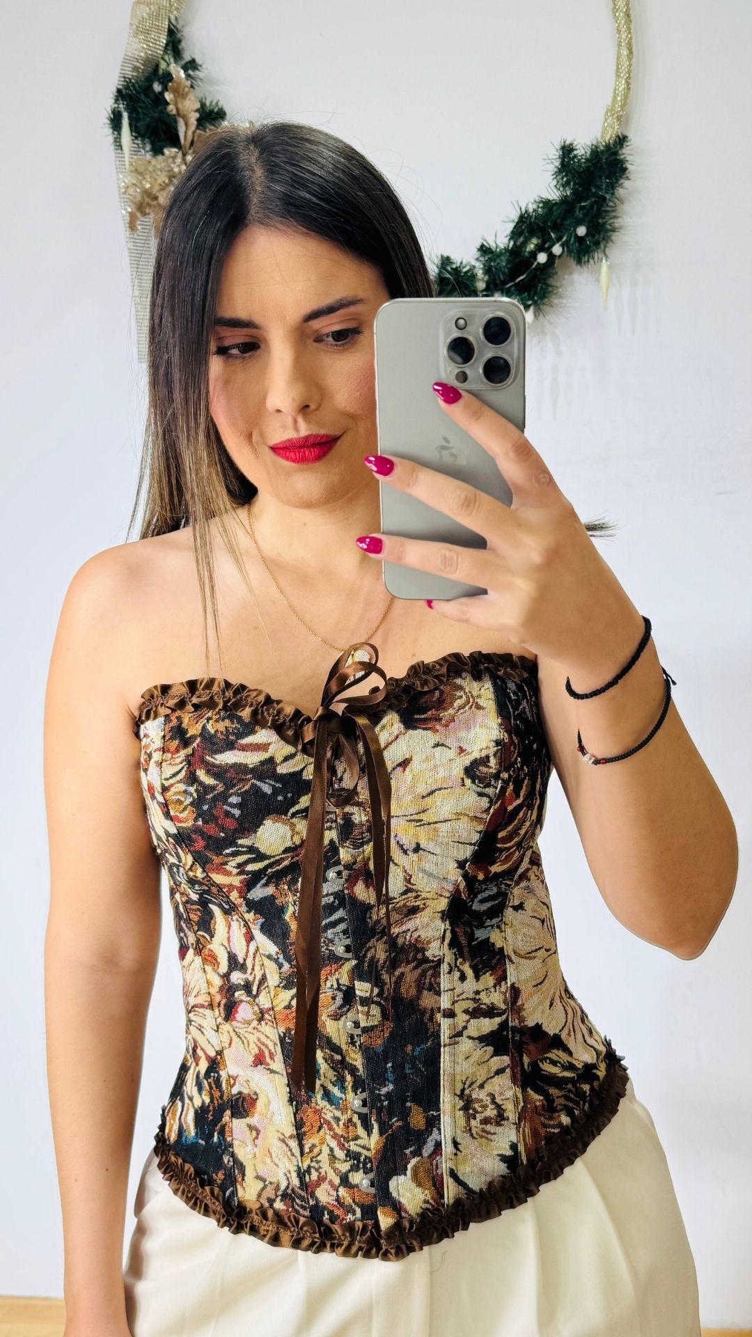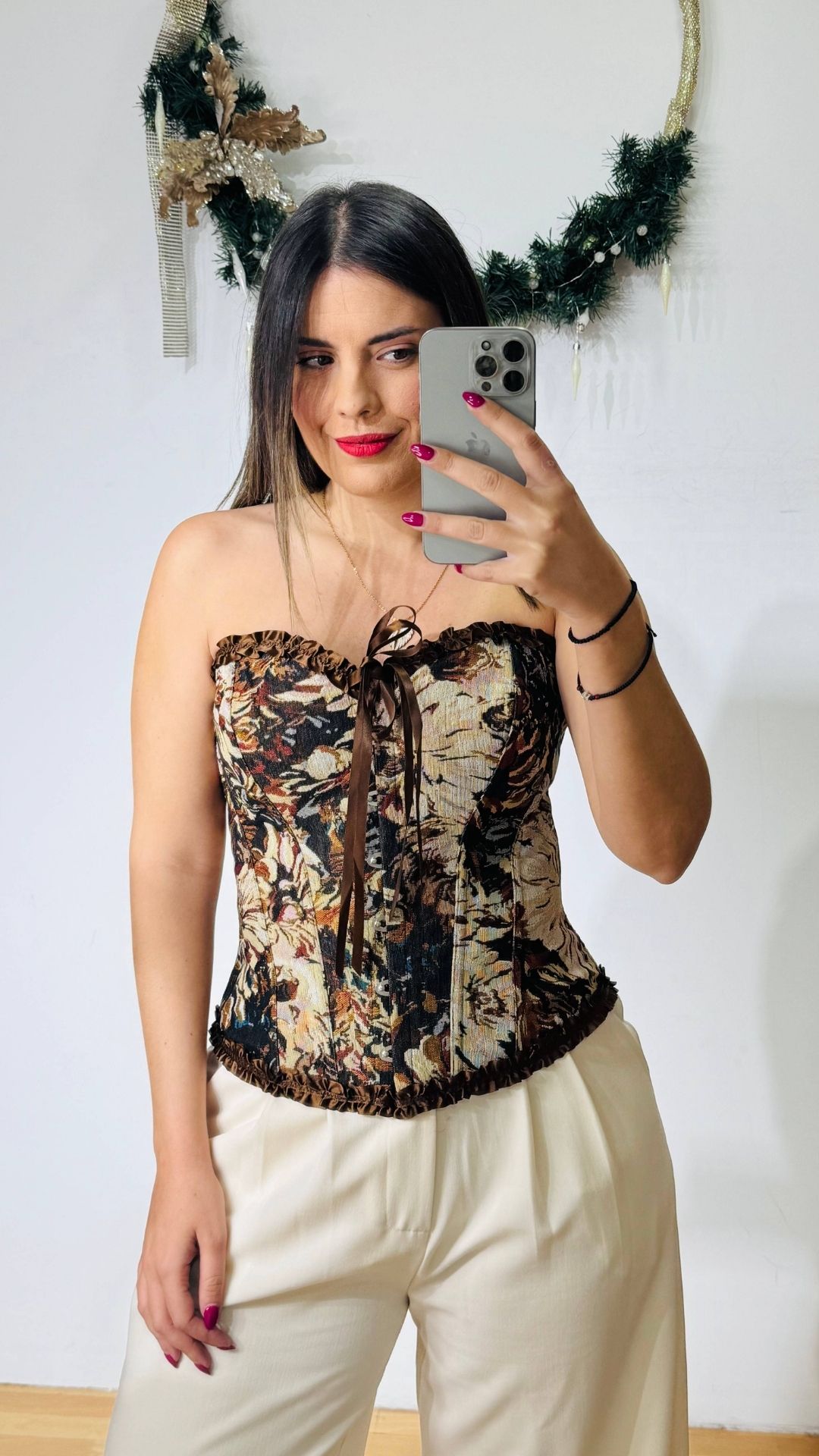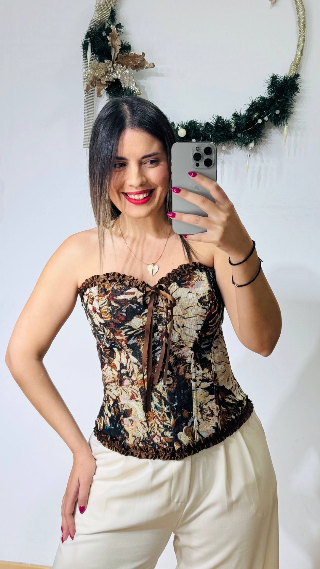 Mπούστο μπροκάρ με ρυθμιζόμενες σατέν κορδέλες.