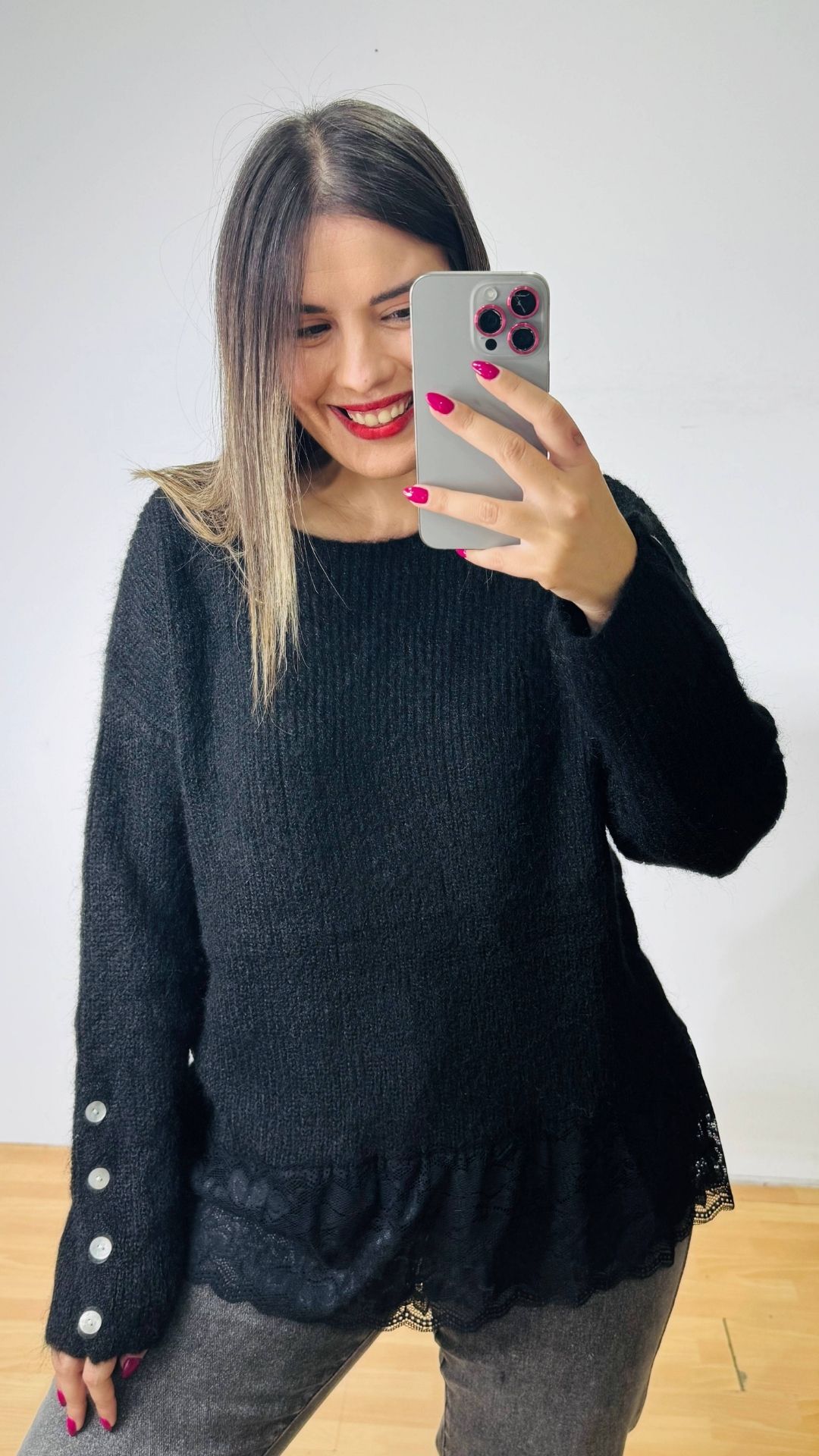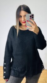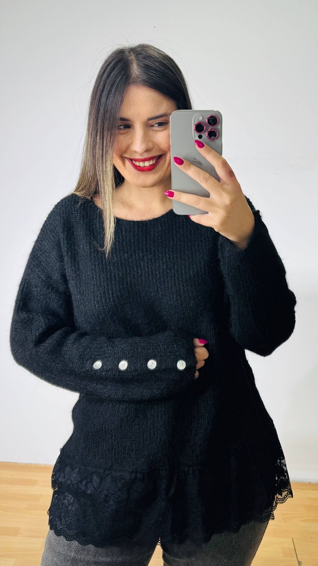 Μακρύ μοχέρ πουλόβερ με διακοσμητική τρέσα δαντέλα στο τελείωμα και διακοσμητικά κουμπιά φίλντισι στις μανσέτες.