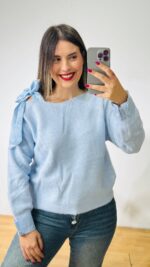 Πουλοβεράκι μοχέρ με χαμόγελο και ραμμένο καρό φουλάρι στον έναν ώμο και ασορτί βαμβακερή καρό μανσέτα.